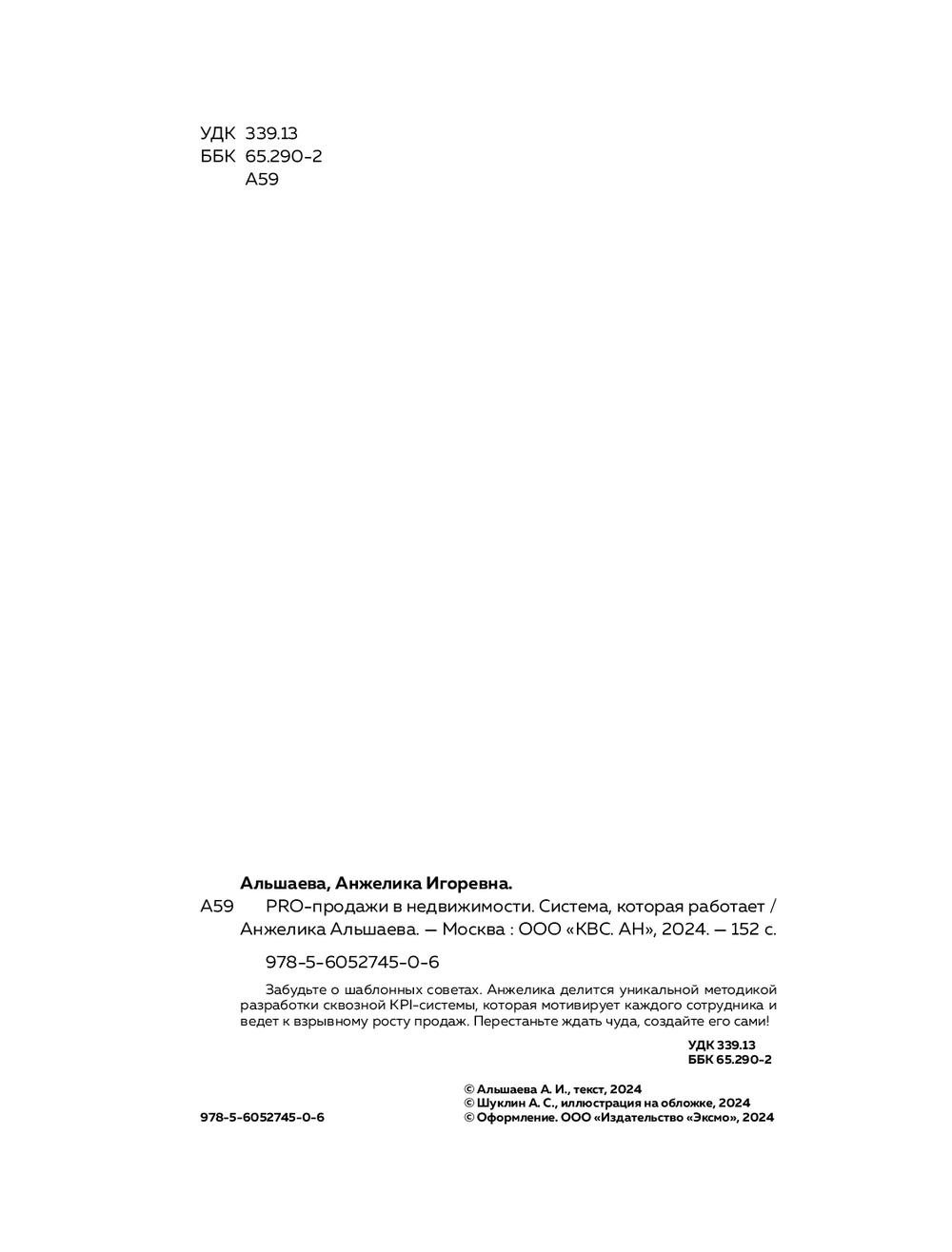 "PRO-продажи в недвижимости: Система, которая работает" – это не просто книга, а пошаговое руководство от практика с 22-летним опытом, Анжелики Альшаевой, генерального директора "КВС. Агентство недвижимости".