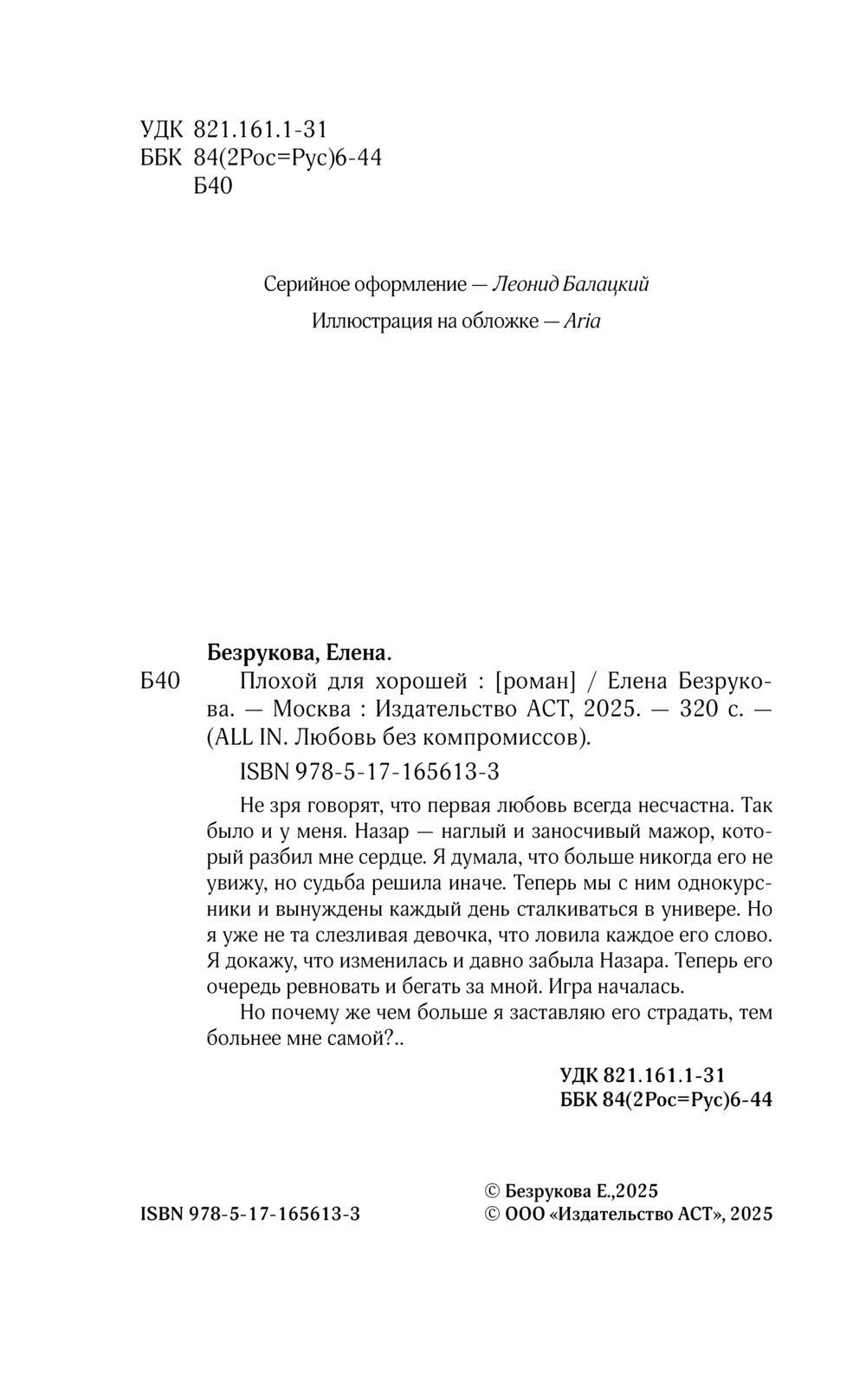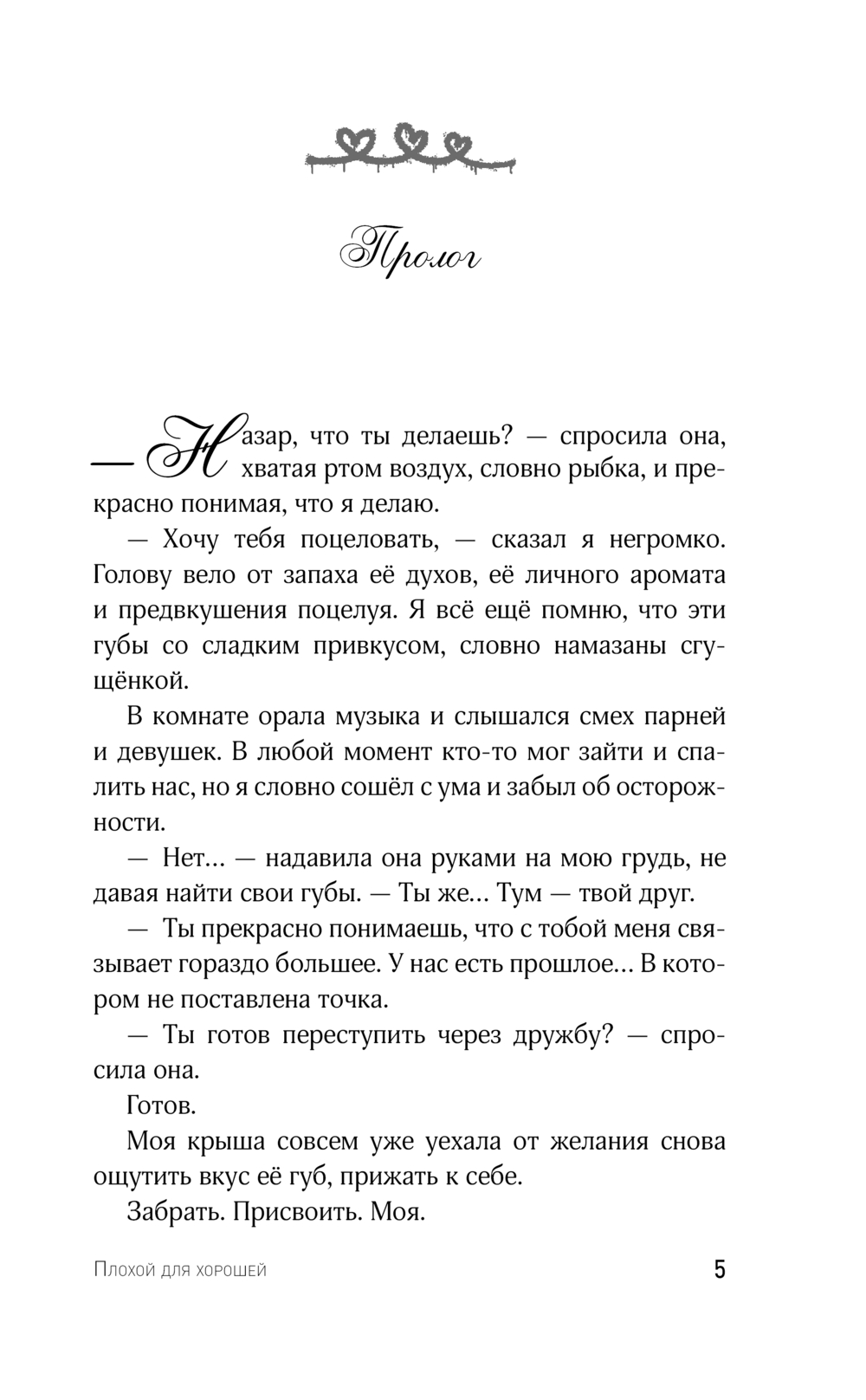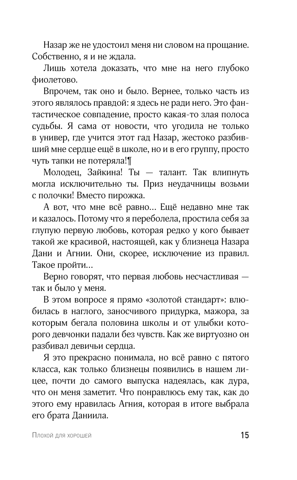 Не зря говорят, что первая любовь всегда несчастна. Так было и у меня. Назар – наглый и заносчивый мажор, который разбил мне сердце. Я думала, что больше никогда его не увижу, но судьба решила иначе. Теперь мы с ним однокурсники и вынуждены каждый день сталкиваться в универе. Но я уже не та слезливая девочка, что ловила каждое его слово. Я докажу, что изменилась и давно забыла Назара. Теперь его очередь ревновать и бегать за мной. Игра началась. Но почему же чем больше я заставляю его страдать, тем больнее мне самой?..