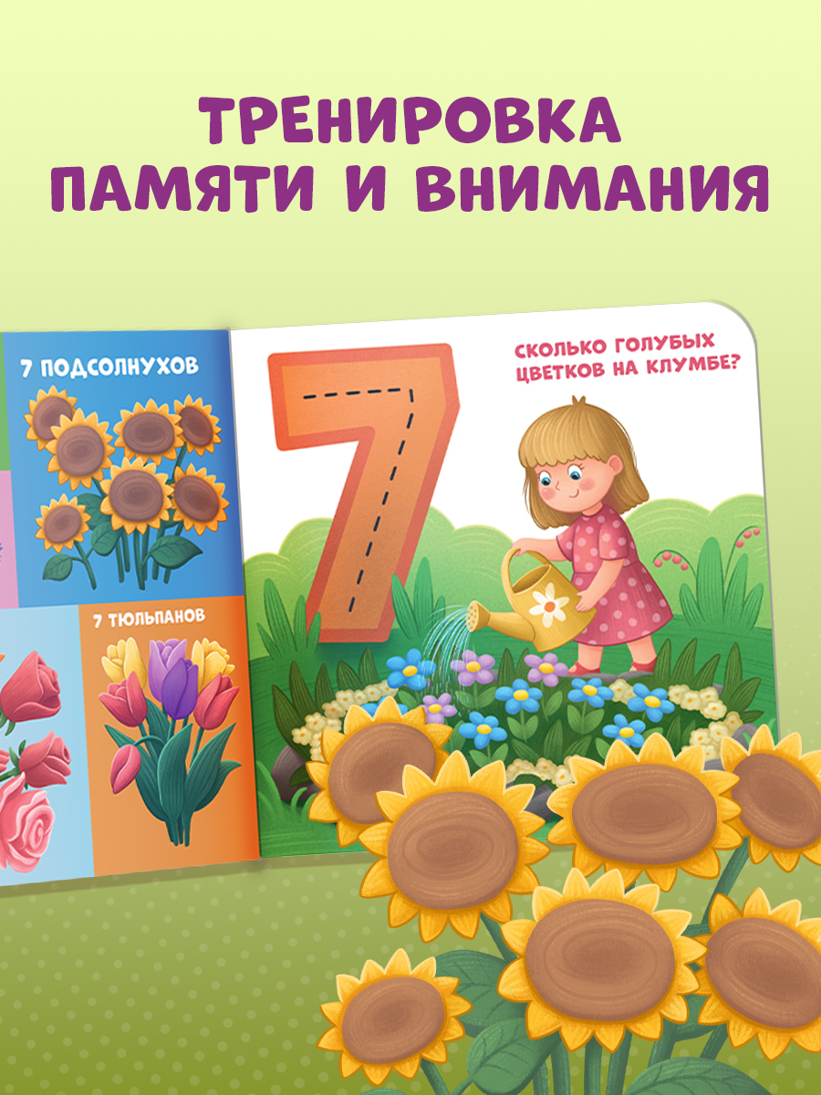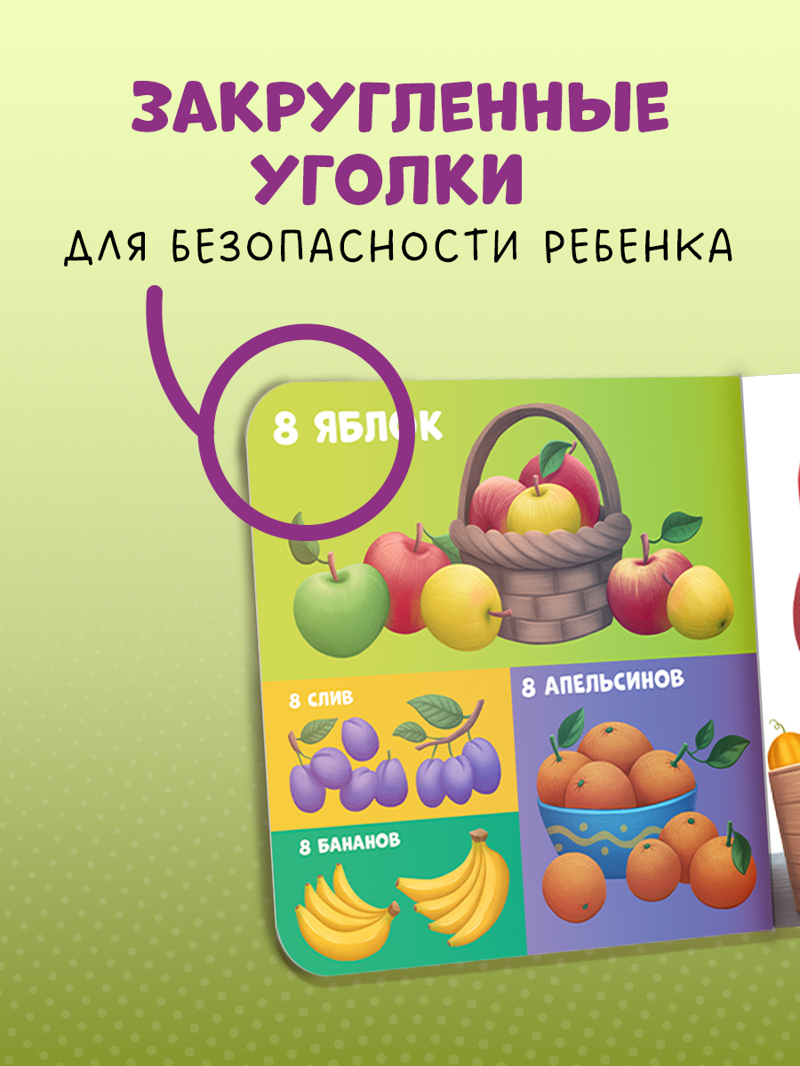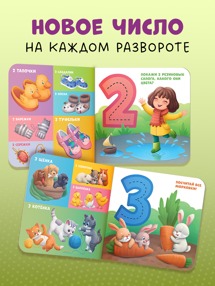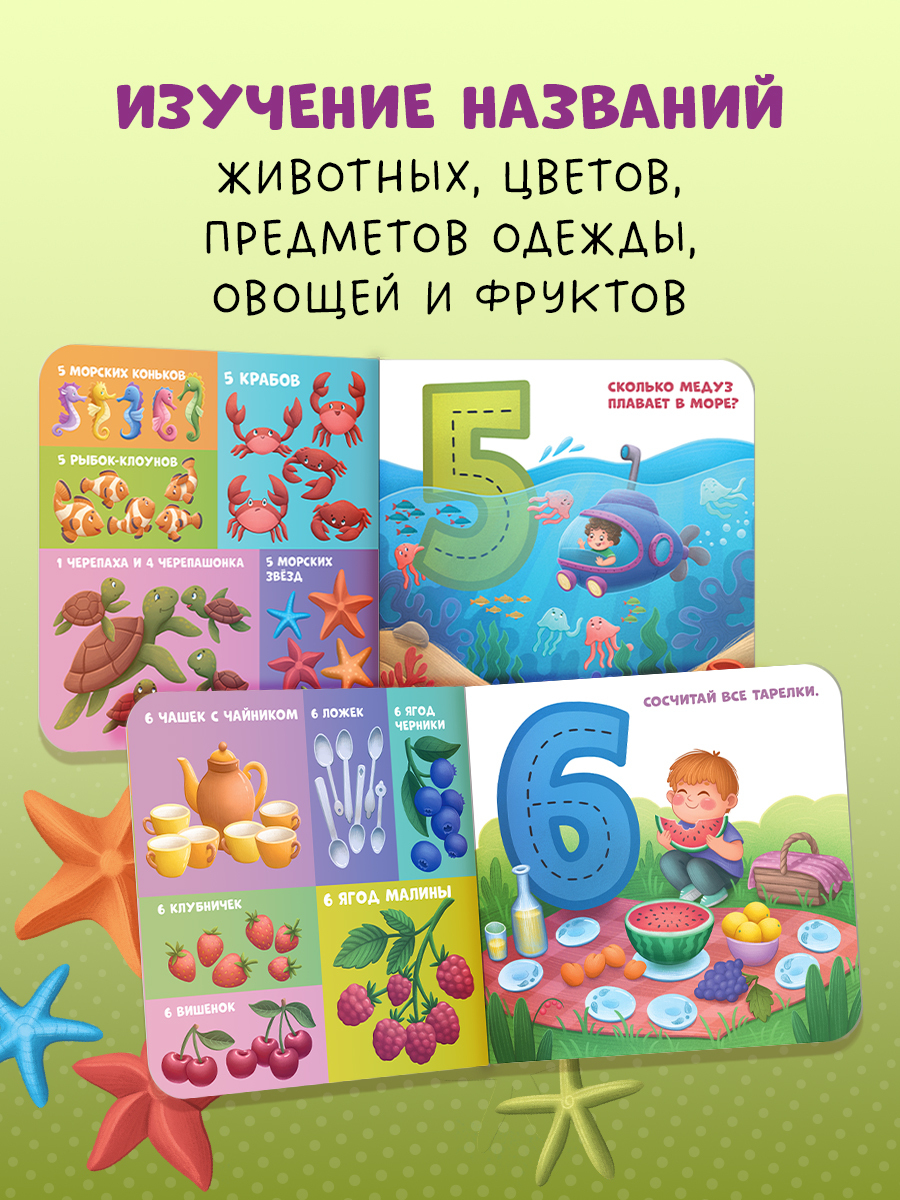 На каждом развороте книги ребенок будет знакомиться с новым числом, обводить пальчиком цифры, отыскивать и считать заданные предметы. Кроме того, занятия по книге помогут маленькому читателю расширить кругозор и выучить названия животных, машин, предметов одежды, овощей и фруктов и повторить цвета.