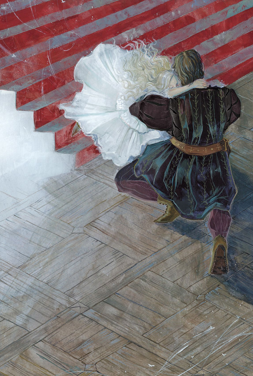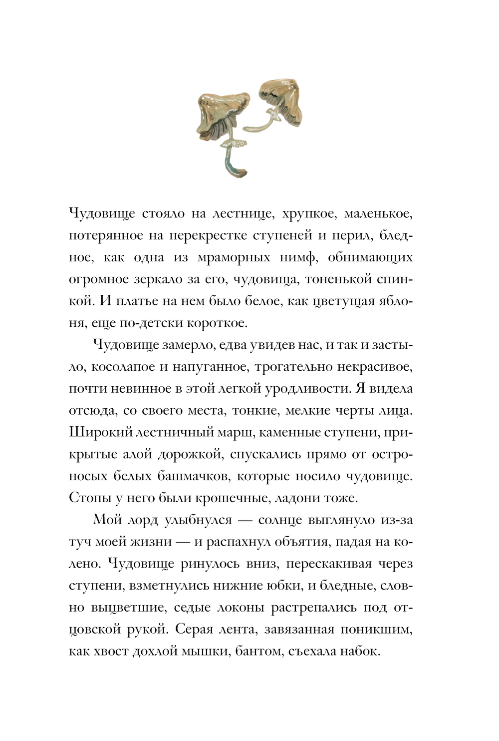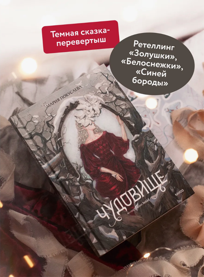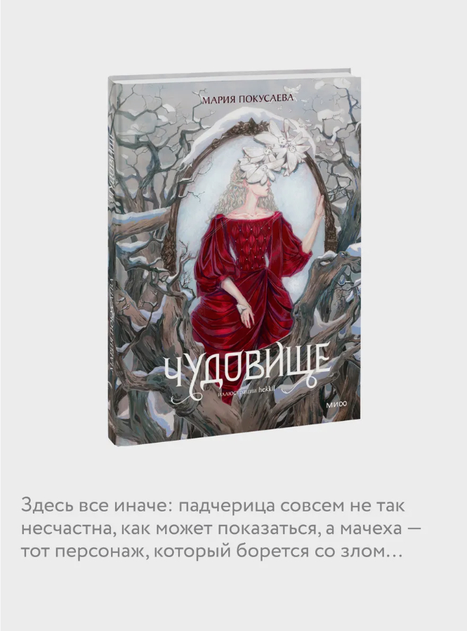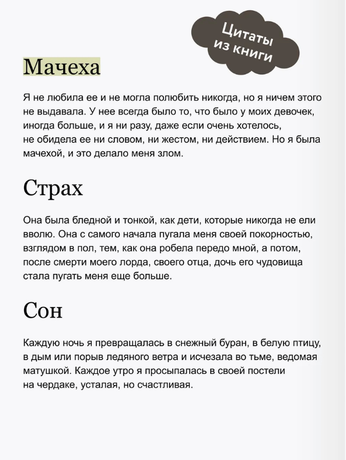 "Чудовище, прекрасное чудовище с волосами белыми, как снег, в платье красном, как кровь, как сочные яблоки и рубины, и с сердцем чернее бесконечности, из которой такие, как она, появлялись и в которую не хотели уходить".