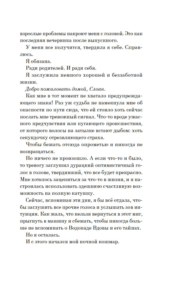 Вчерашняя студентка Слоан устраивается на лето на Водопад Вдовы подработать инструктором по рафтингу. Девушка хотела насладиться живописными пейзажами, встретить новых друзей или даже найти любовное приключение, однако очень скоро окружающая обстановка начинает казаться ей по крайней мере странной. Видимо, Слоан предстоит лично разобраться в том, где кончаются старинные легенды и начинается страшная правда.