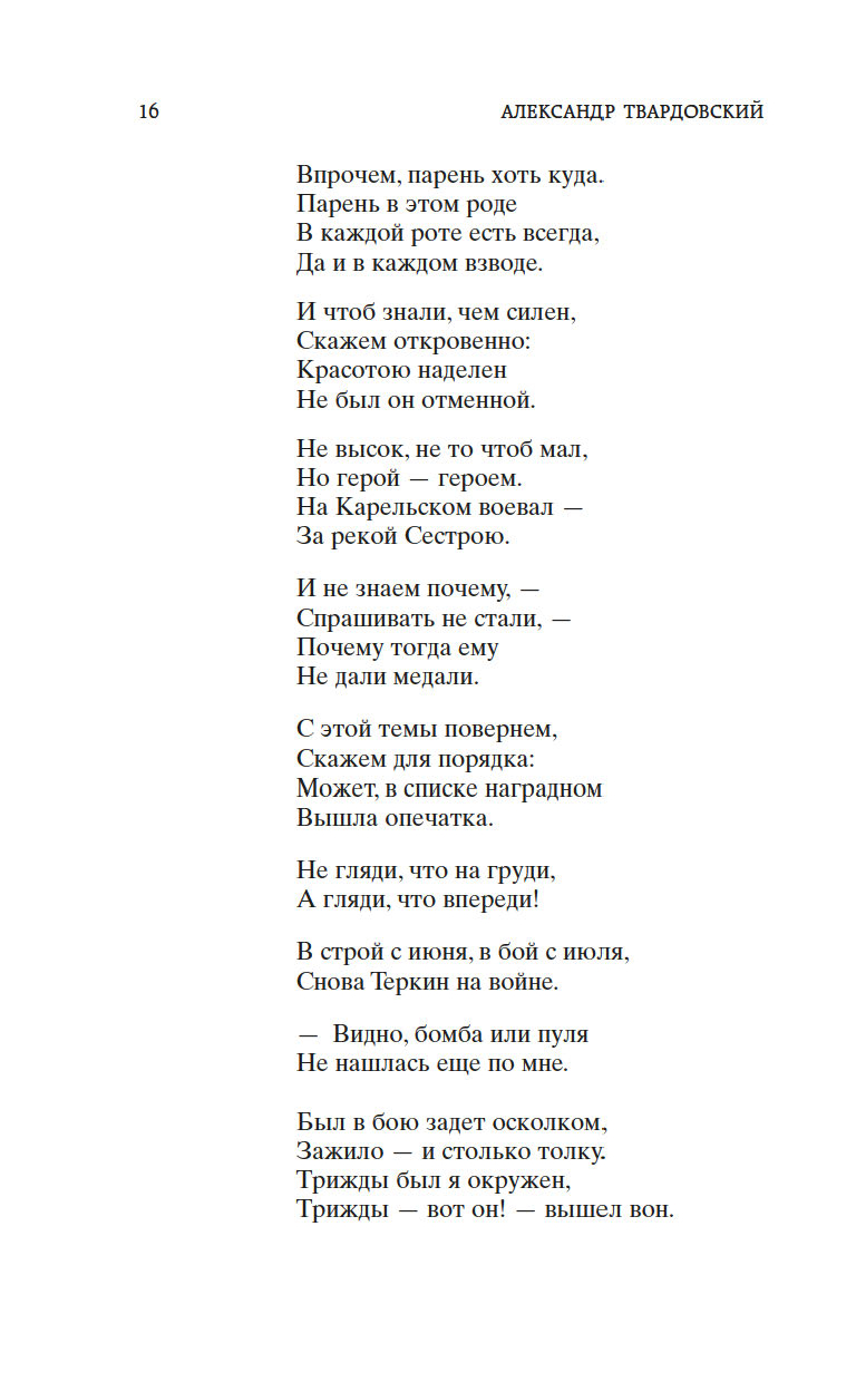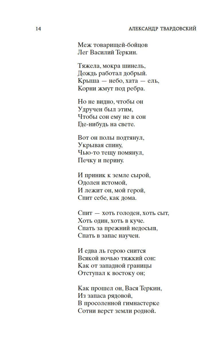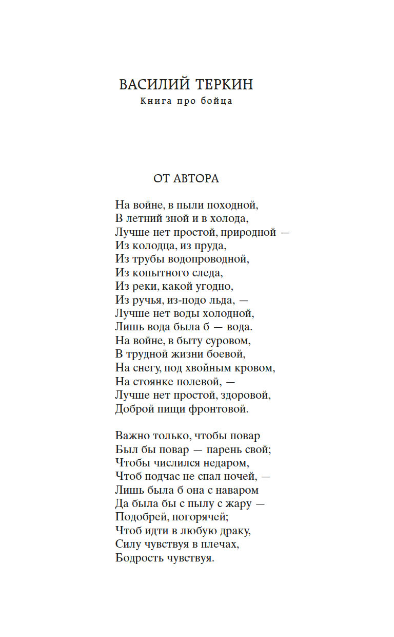 В истории русской литературы мало найдется произведений, которые могли бы сравниться с "Василием Теркиным" по популярности и той поистине всенародной любви, которая выпала на долю знаменитой поэмы Александра Твардовского, выдающегося советского поэта и писателя, главного редактора легендарного журнала "Новый мир", ставшего рупором свободы во времена "оттепели". Основная часть поэмы была создана в годы Великой Отечественной войны и печаталась в виде отдельных глав, которые имели оглушительный успех у читателей; продолжения книги о храбром и неунывающем бойце с нетерпением ждали "живущие на войне люди". "„Василий Теркин" – это лучшее из всего написанного о войне на войне", – отзывался о поэме Константин Симонов.