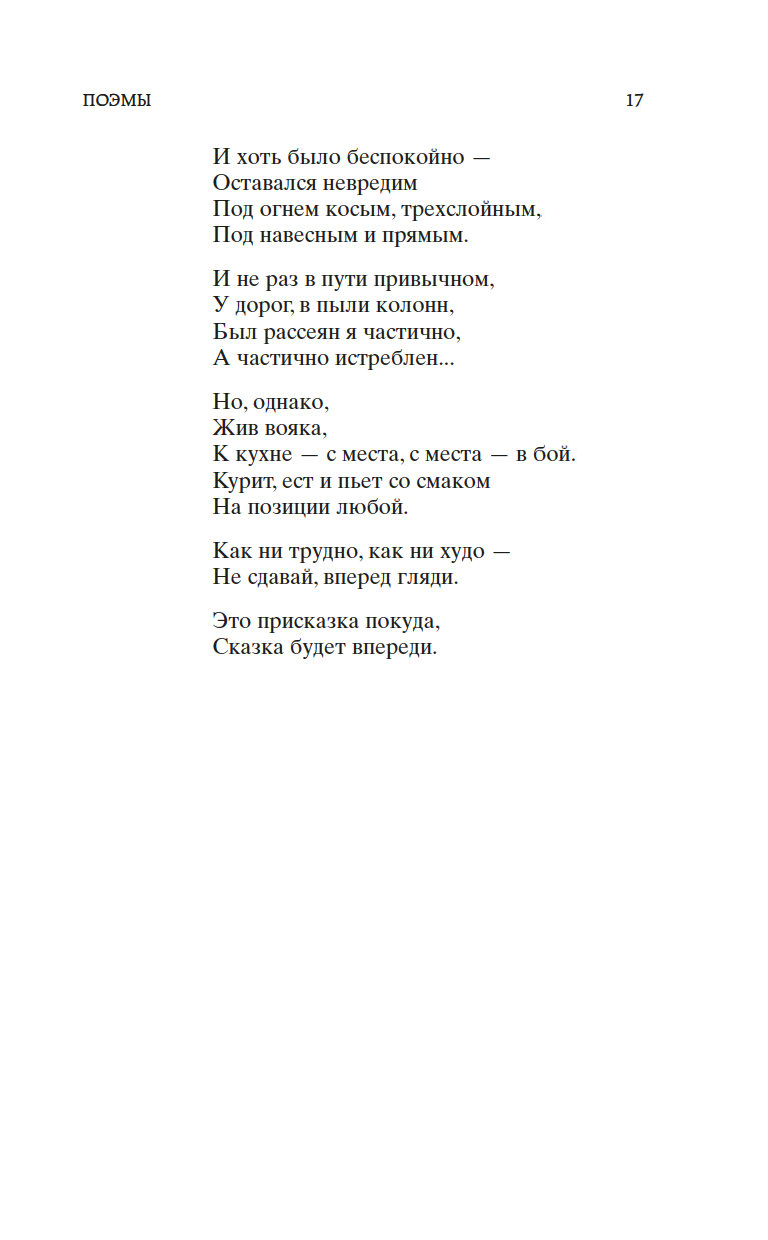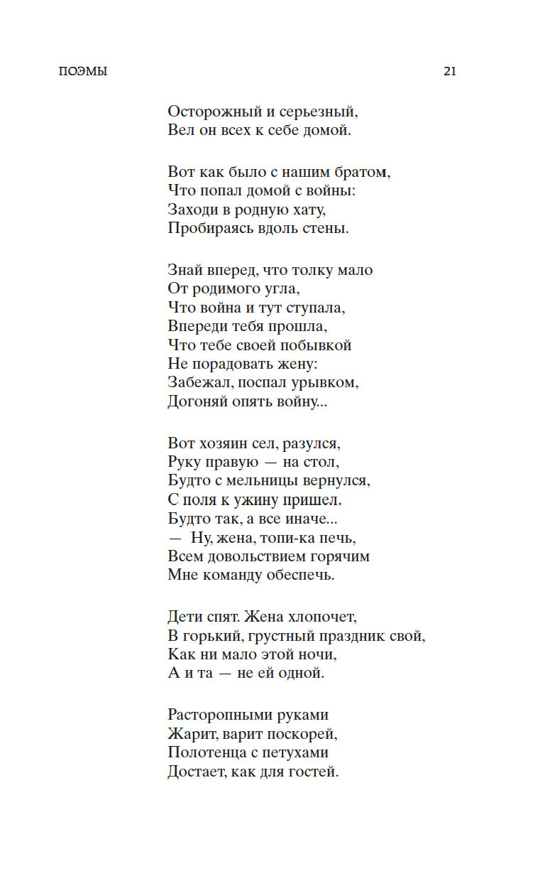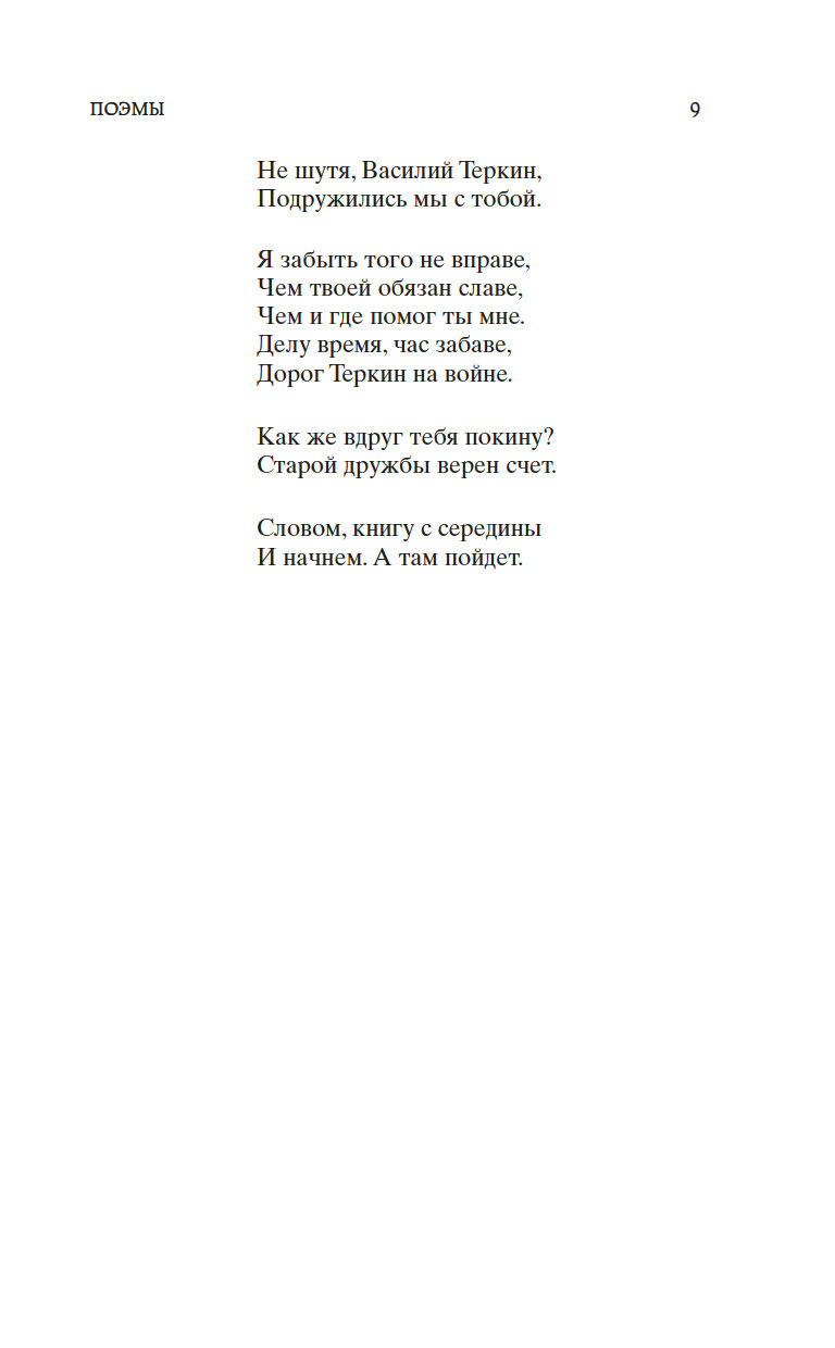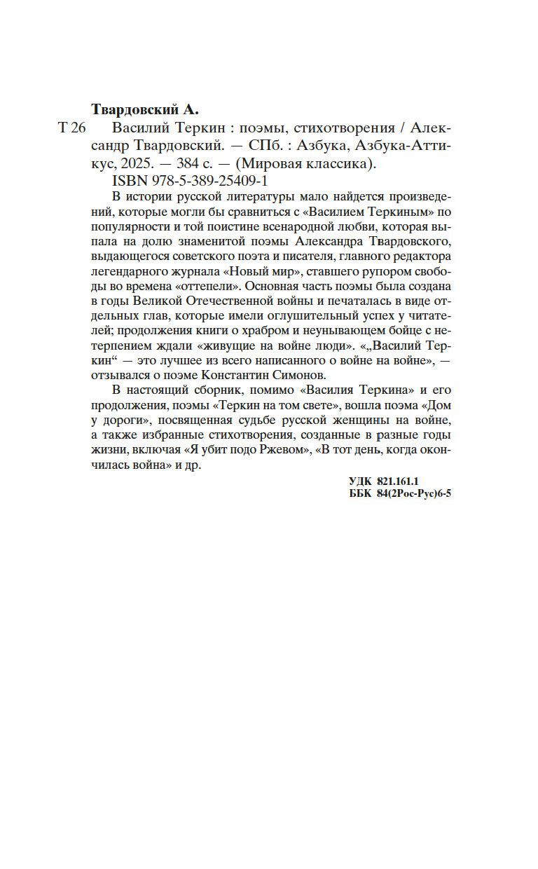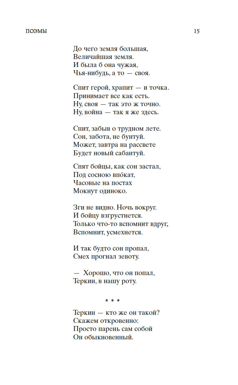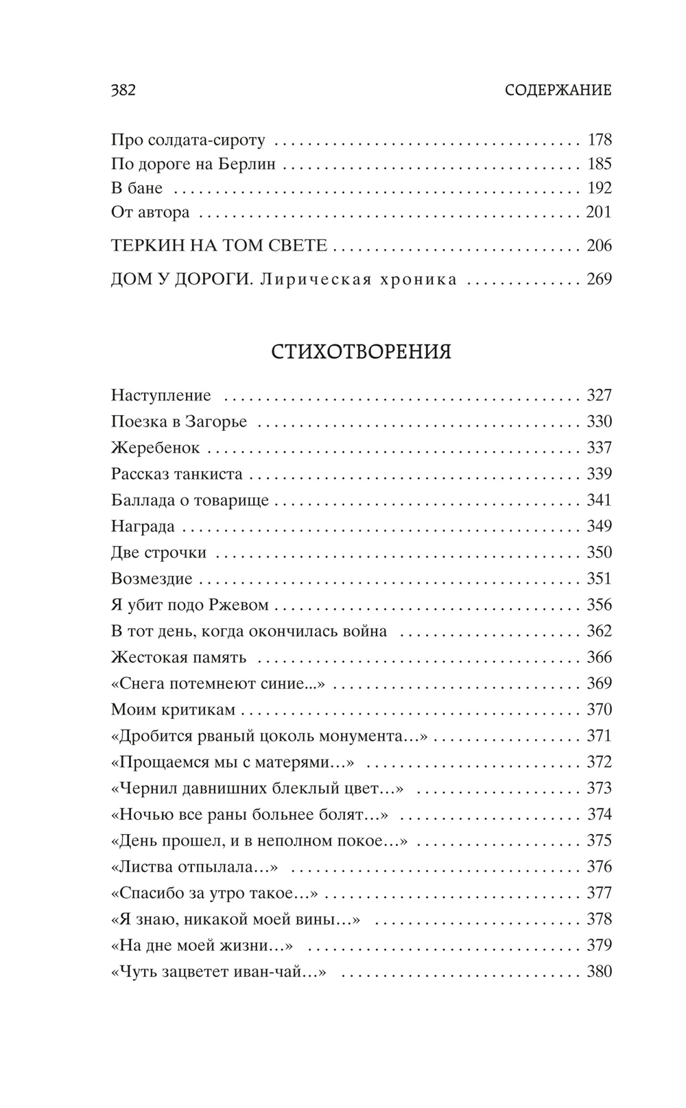 В настоящий сборник, помимо "Василия Теркина" и его продолжения, поэмы "Теркин на том свете", вошла поэма "Дом у дороги", посвященная судьбе русской женщины на войне, а также избранные стихотворения, созданные в разные годы жизни, включая "Я убит подо Ржевом", "В тот день, когда окончилась война" и др.