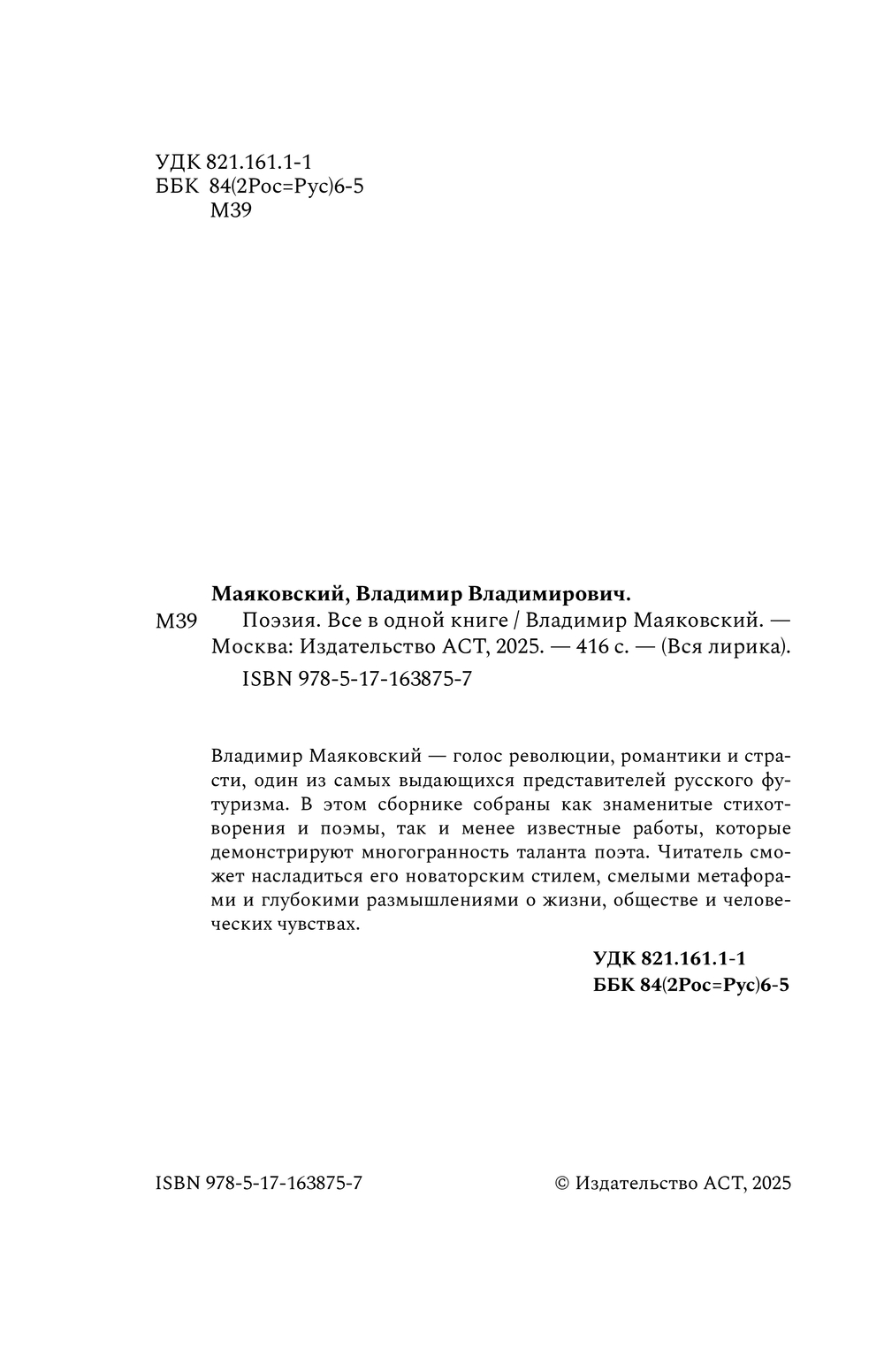 Владимир Маяковский – голос революции, романтики и страсти, один из самых выдающихся представителей русского футуризма. В этом сборнике собраны как знаменитые стихотворения и поэмы, так и менее известные работы, которые демонстрируют многогранность таланта поэта. Читатель сможет насладиться его новаторским стилем, смелыми метафорами и глубокими размышлениями о жизни, обществе и человеческих чувствах.