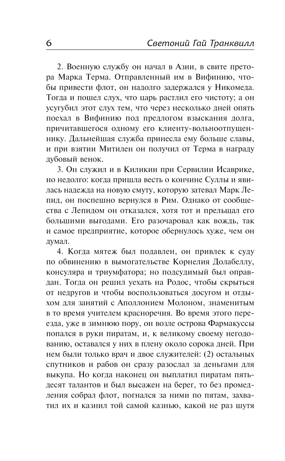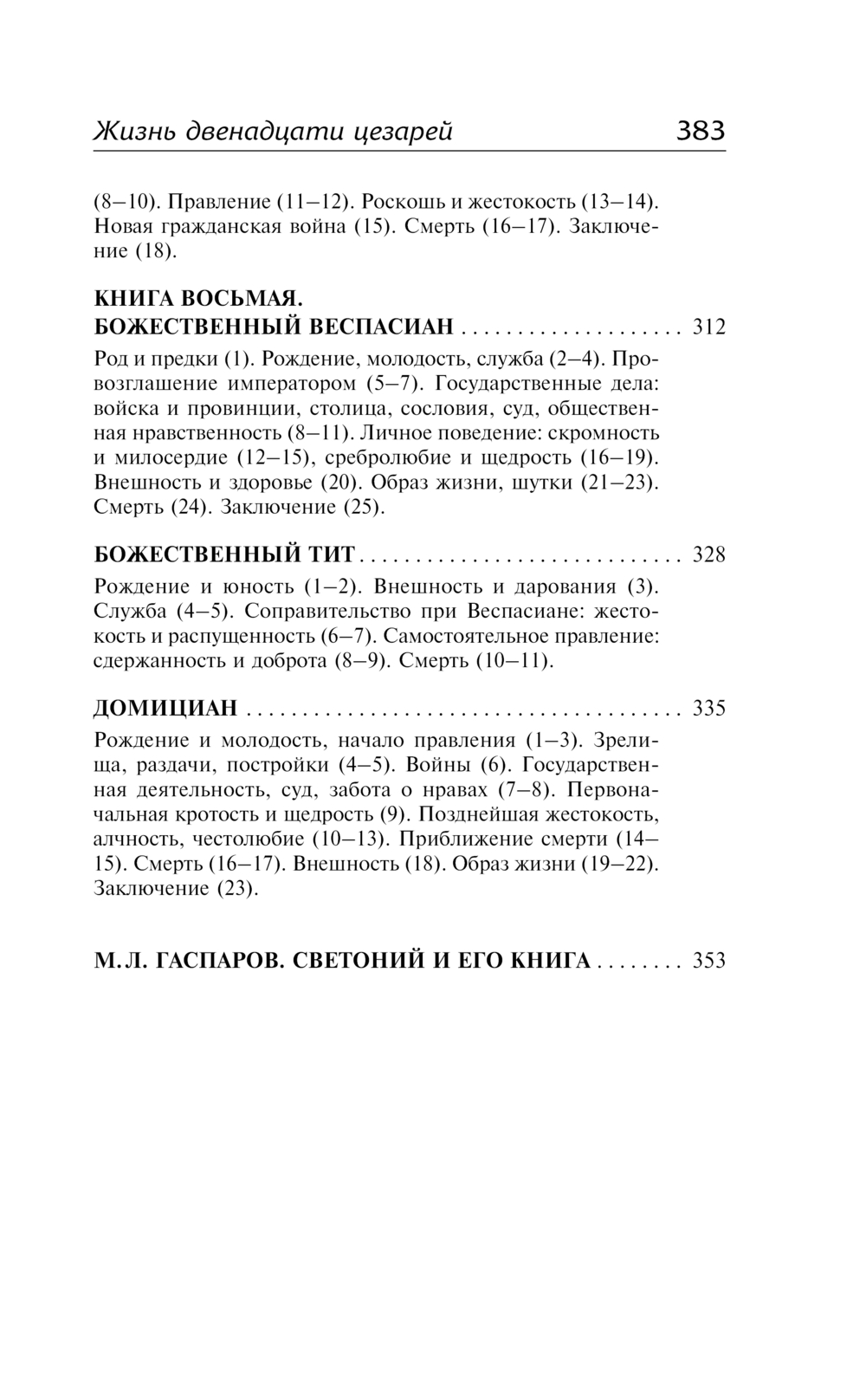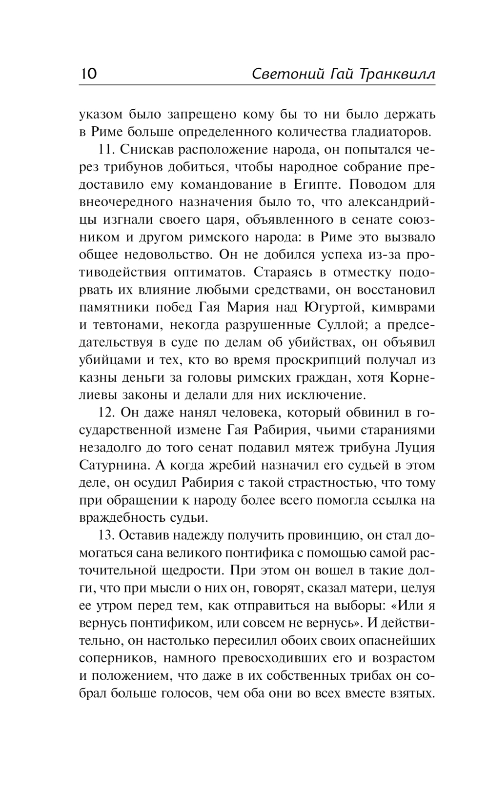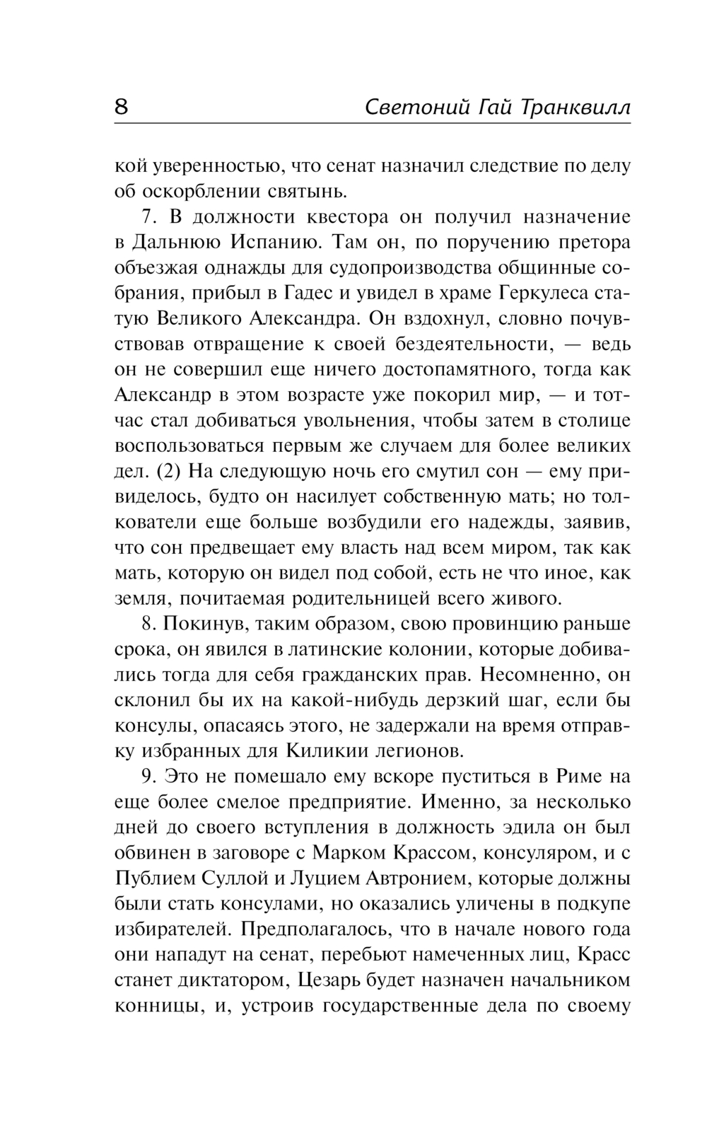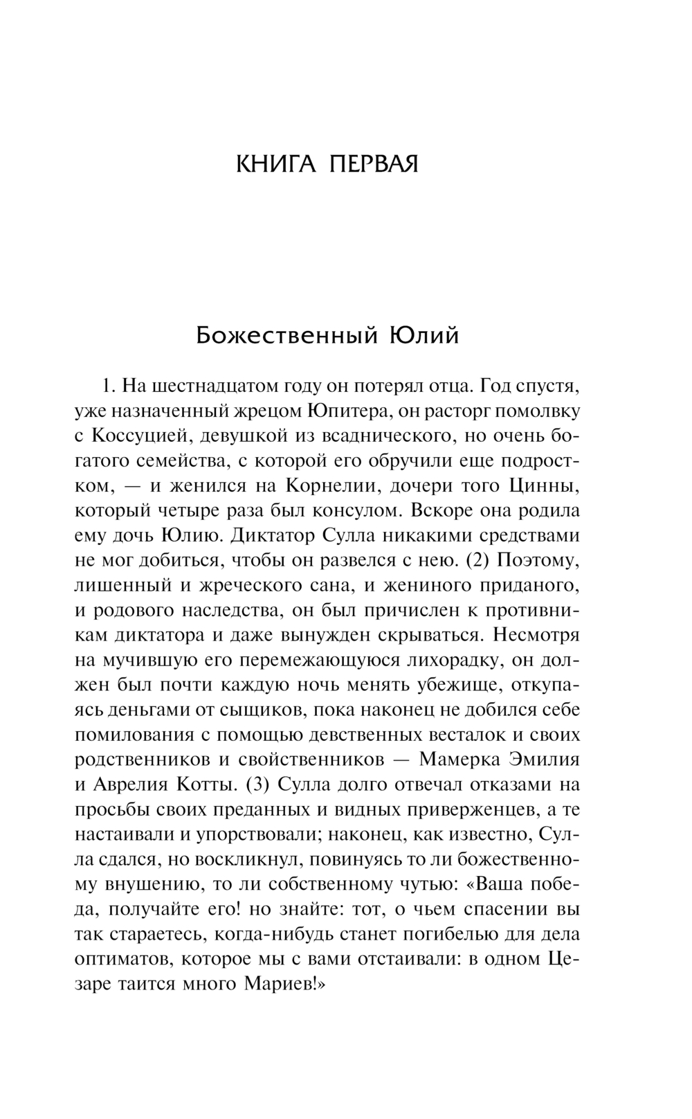 "Жизнь двенадцати цезарей" – известнейший памятник римской литературы первого века нашей эры, оказавший заметное влияние на европейскую культуру, и при этом один из основных источников нашего знания о наиболее скандальной и волнующей с точки зрения политики эпохе в истории Древнего Рима. Перед читателем пройдет вереница властителей мира – тиранов и полководцев, божественных героев и кровожадных сумасшедших – от Юлия Цезаря до императора Домициана. Текст проливает свет как на политические интриги, так и на интимную жизнь цезарей, сочетая увлекательность повествования с классической ясностью античного слога.