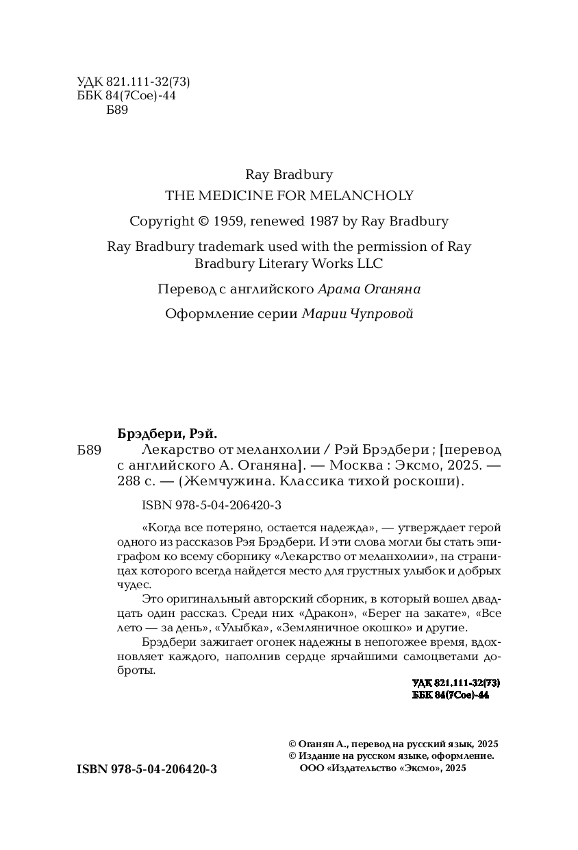"Когда все потеряно, остается надежда", – утверждает герой одного из рассказов Рэя Брэдбери. И эти слова могли бы стать эпиграфом ко всему сборнику "Лекарство от меланхолии", на страницах которого всегда найдется место для грустных улыбок и добрых чудес.