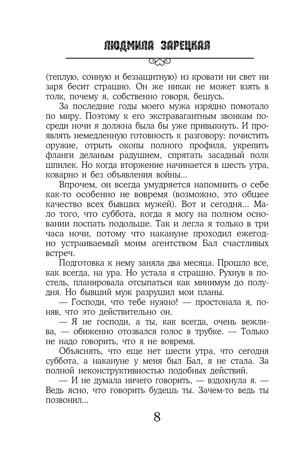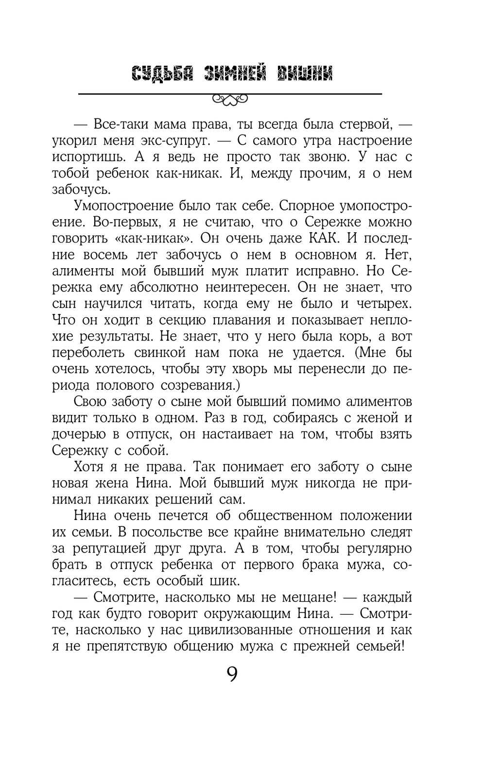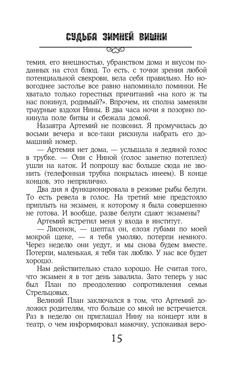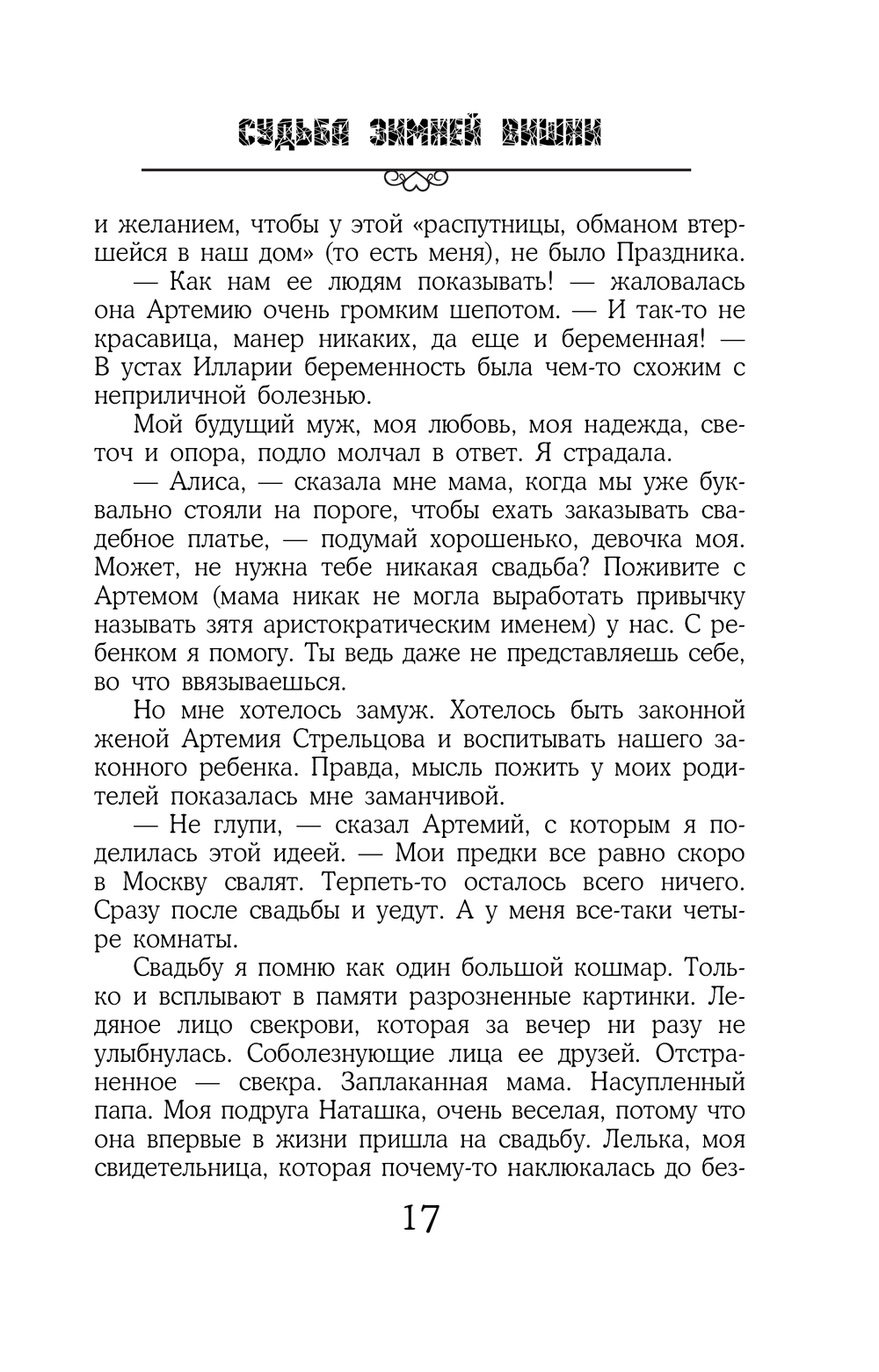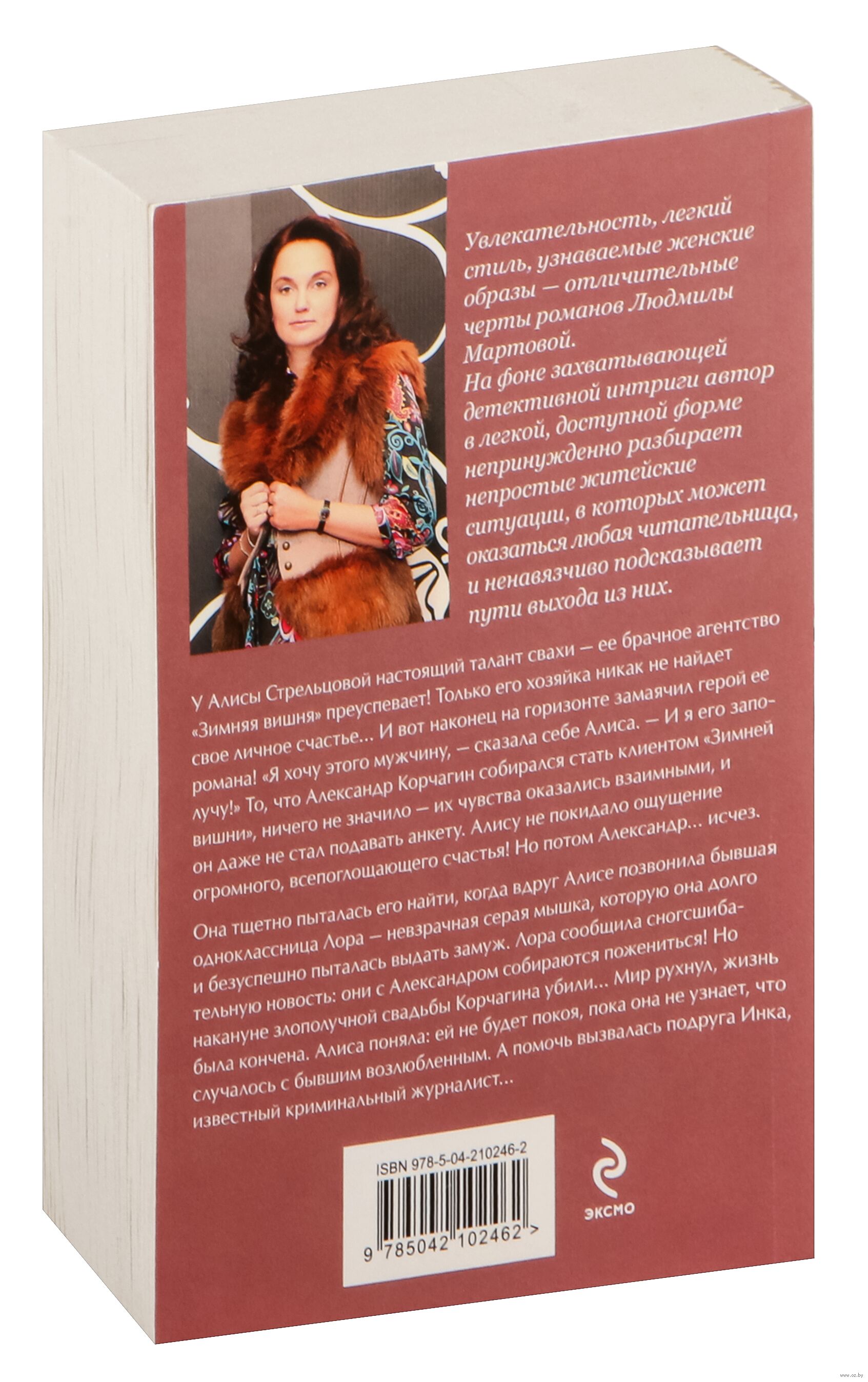 У Алисы Стрельцовой настоящий талант свахи – ее брачное агентство "Зимняя вишня" преуспевает! Только его хозяйка никак не найдет свое личное счастье... И вот наконец на горизонте замаячил герой ее романа! "Я хочу этого мужчину, – сказала себе Алиса. – И я его заполучу!" То, что Александр Корчагин собирался стать клиентом "Зимней вишни", ничего не значило – их чувства оказались взаимными, и он даже не стал подавать анкету. Алису не покидало ощущение огромного, всепоглощающего счастья! Но потом Александр... исчез. Она тщетно пыталась его найти, когда вдруг Алисе позвонила бывшая одноклассница Лора – невзрачная серая мышка, которую она долго и безуспешно пыталась выдать замуж. Лора сообщила сногсшибательную новость: они с Александром собираются пожениться! Но накануне злополучной свадьбы Корчагина убили... Мир рухнул, жизнь была кончена. Алиса поняла: ей не будет покоя, пока она не узнает, что случалось с бывшим возлюбленным. А помочь вызвалась подруга Инка, известный криминальный журналист...