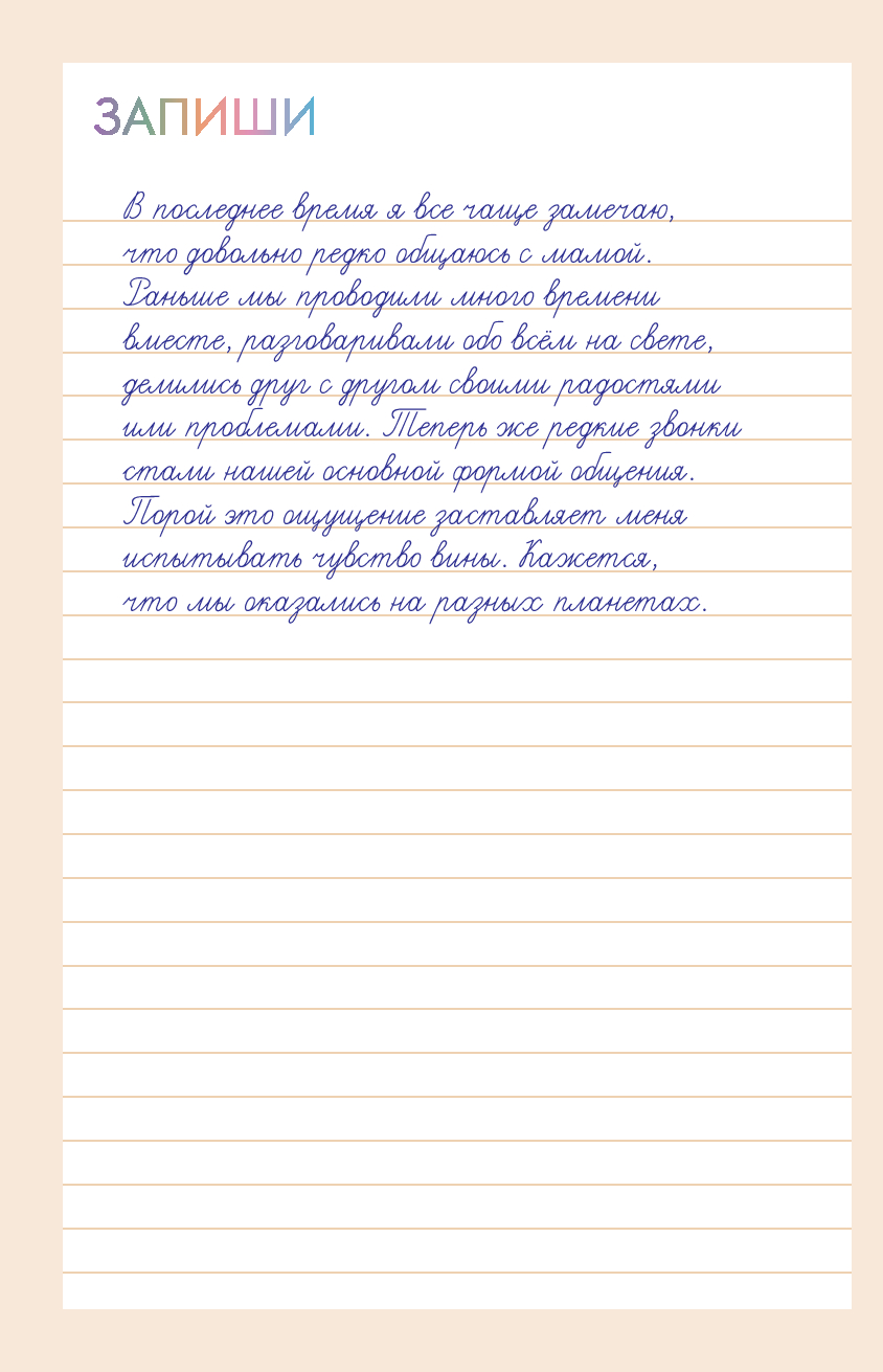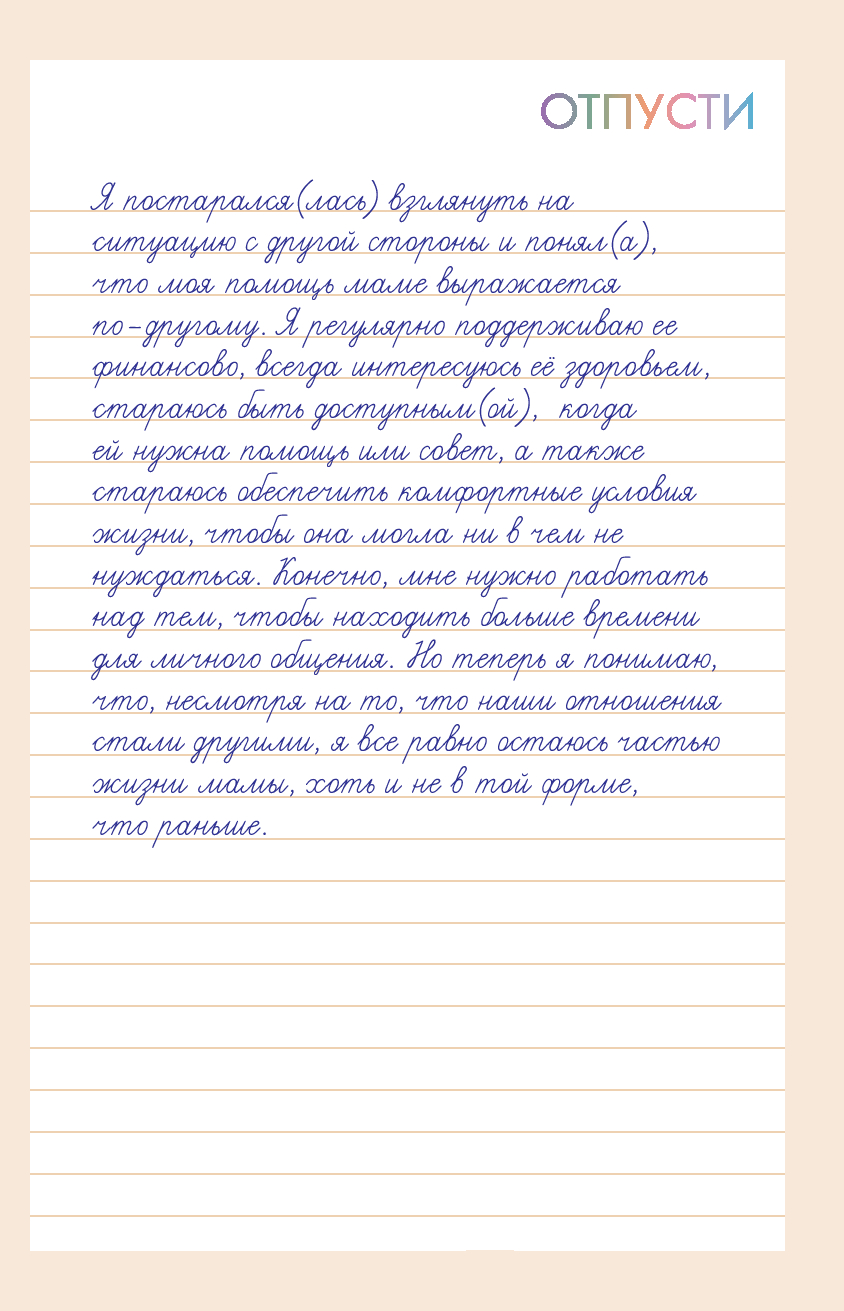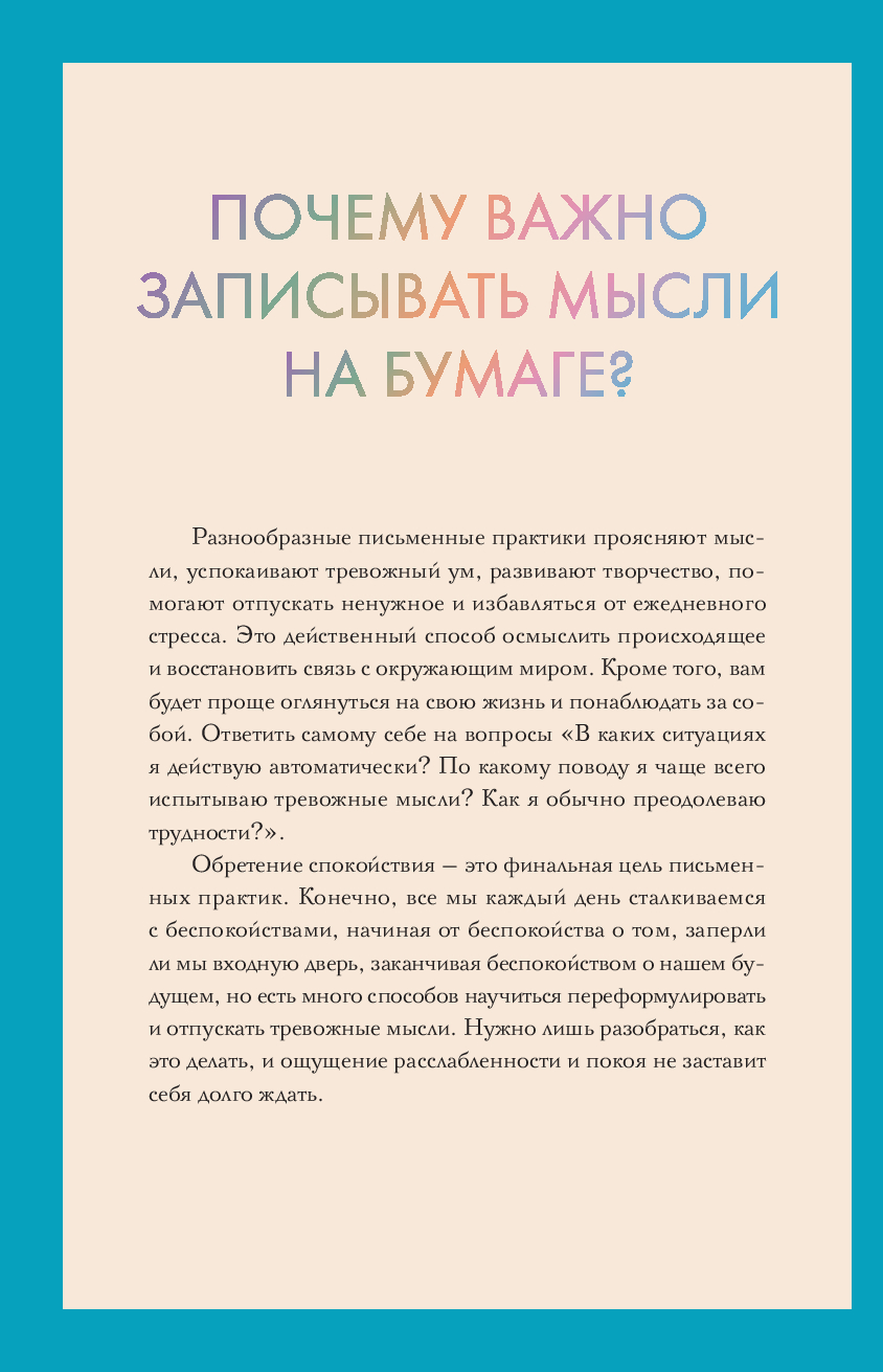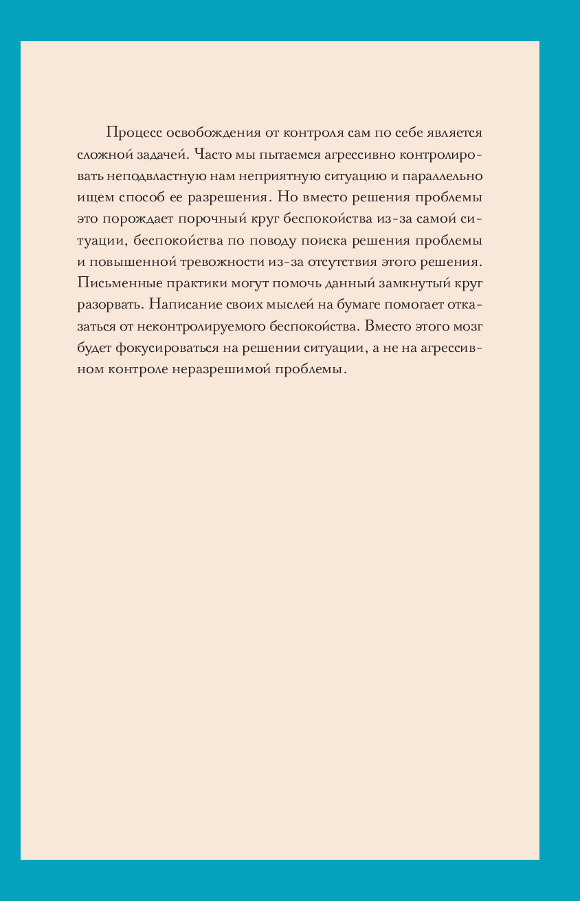 Обретение спокойствия – это финальная цель письменных практик. Стоит лишь раз разобраться, как работает этот метод, и ощущение расслабленности и покоя не заставит себя долго ждать. Благодаря письменным практикам вы научитесь смещать фокус с негативных мыслей и событий на позитивные – и, что важнее, превращать свои тревожные мысли в позитивные чувства или действия. Дневник очень прост в использовании: записывайте свои тревожные мысли на одной странице, а затем переосмысливайте их в позитивные чувства или действия на противоположной. Практикуйте этот метод регулярно, и результат не заставит себя ждать.