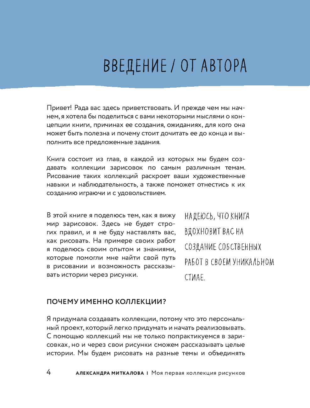 Эта книга – настоящая находка для начинающего художника! В ней художник-иллюстратор Саша Миткалова расскажет, как побороть страх чистого листа и быстро и свободно научиться рисовать. Вместе с ней вы выберете художественные материалы, поймете основы рисования и начнете собирать свои первые коллекции. А чтобы вам было легче и интереснее усваивать материал, Саша придумала задания и упражнения, который вы найдете на страницах книги.