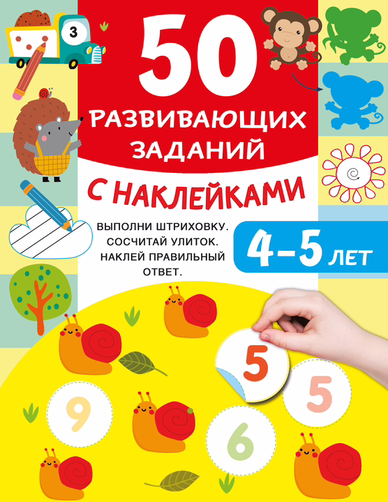 "50 развивающих заданий с наклейками. 4-5 лет" – замечательная книжка, которая поможет сделать мир ребёнка весёлым и интересным: в игровой форме даны задания с учётом возрастных особенностей детей дошкольного возраста. Книжка станет для заботливых родителей незаменимым помощником в занятиях с малышом. Всё, что нужно для развития речи, мышления, внимания, памяти, мелкой моторики, координации движений, пространственного мышления, наблюдательности. Малыша ждёт масса увлекательных заданий, он сможет сам подобрать место для каждой наклейки.