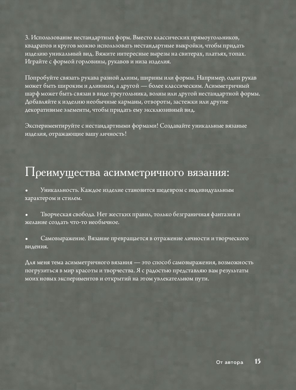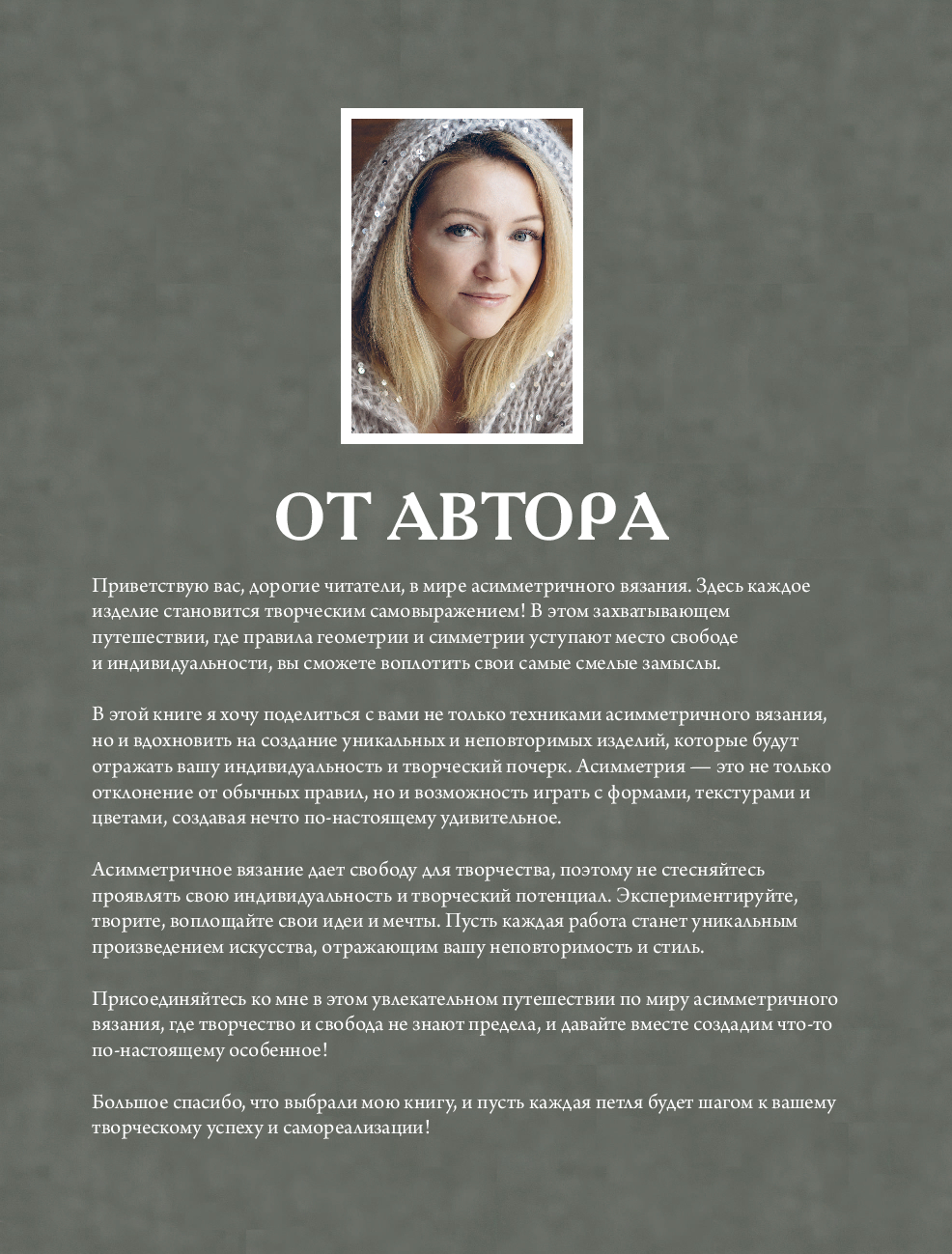 Асимметрия – эффектная альтернатива классическим силуэтам, бунт против банальных методов вязания, огромное пространство для экспериментов. Динамичный асимметричный образ привлекает своей раскованностью, позволяет проявить яркую индивидуальность. Мастер-классы по вязанию 10 изделий: жилетов, свитеров, джемперов, кардиганов.