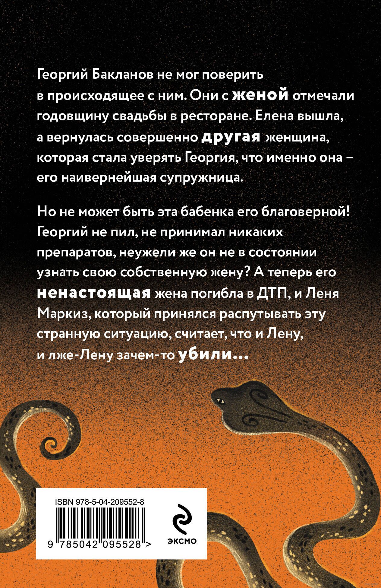 Георгий Бакланов не мог поверить в происходящее с ним. Они с женой отмечали годовщину свадьбы в ресторане. Елена вышла, а вернулась совершенно другая женщина, которая стала уверять Георгия, что именно она – его наивернейшая супружница. Но не может быть эта бабенка его благоверной! Георгий не пил, не принимал никаких препаратов, неужели же он не в состоянии узнать свою собственную жену? А теперь его ненастоящая жена погибла в ДТП, и Леня Маркиз, который принялся распутывать эту странную ситуацию, считает, что и Лену, и лже-Лену зачем-то убили...