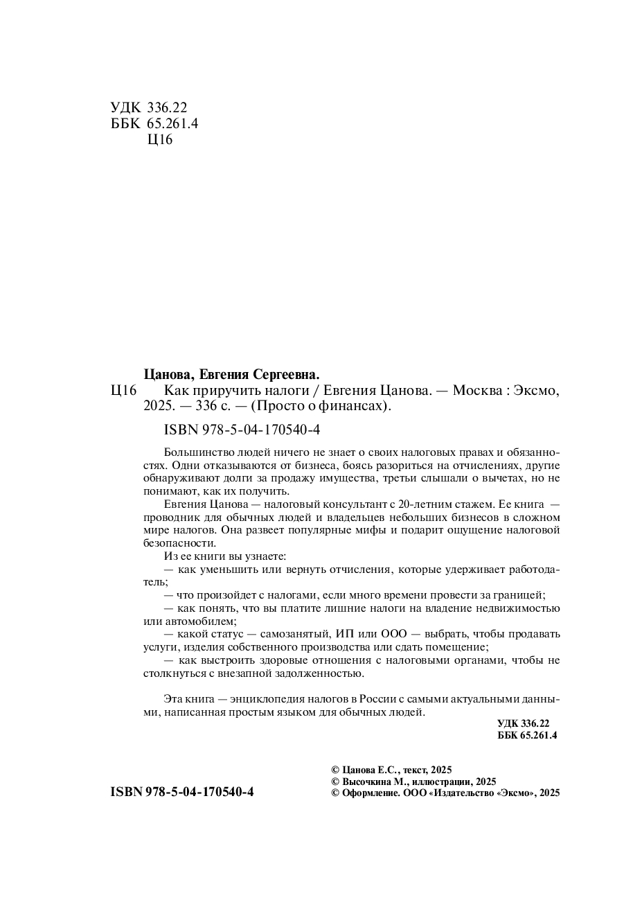 Евгения Цанова – налоговый консультант с 20-летним стажем. Ее книга – проводник для простых людей и владельцев небольших бизнесов в сложном мире налогов. Она развеет популярные мифы и подарит ощущение налоговой безопасности.