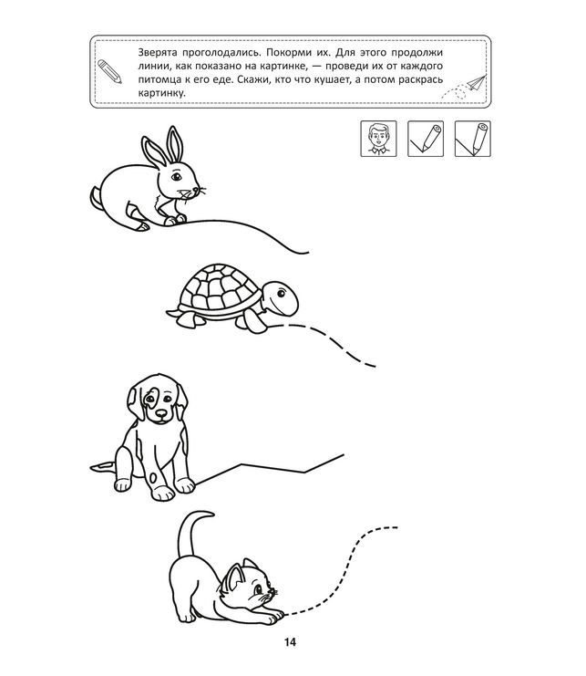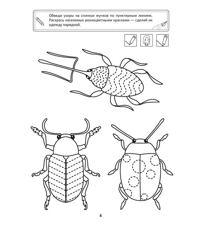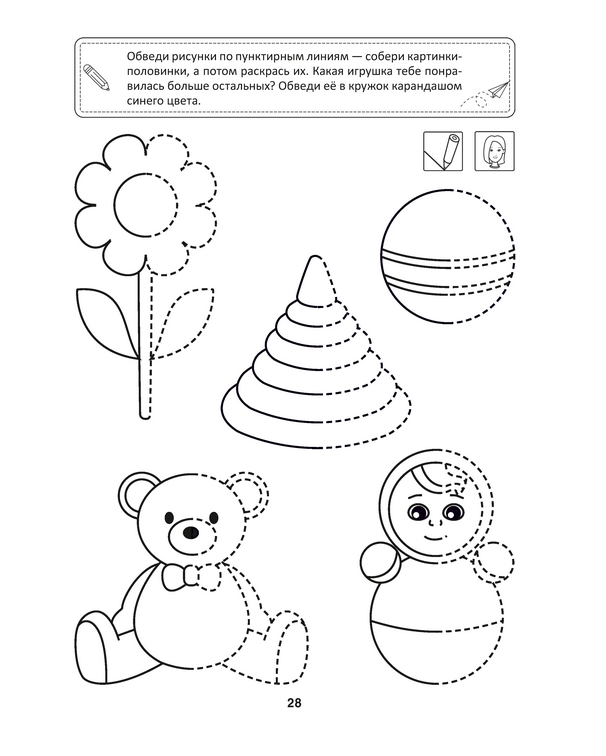 Задача пособия – развивать изобразительные способности ребёнка, учиться понимать иллюстрации, использовать различные техники рисования. Тетрадь интересные игры и развивающие задания, которые помогут малышам укрепить мышцы пишущей руки, а потому будут способствовать развитию концентрации и усидчивости. Ребёнок научится уверенно держать ручку, сможет проводить различные линии, раскрашивать рисунки, обводить отдельные элементы, не выходя за обозначенные контуры.