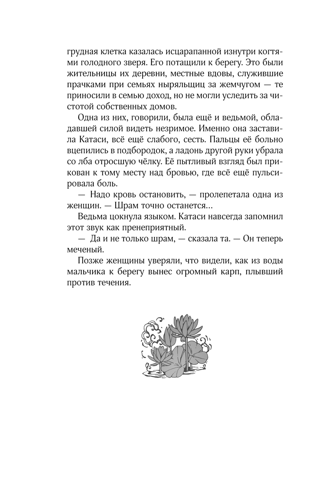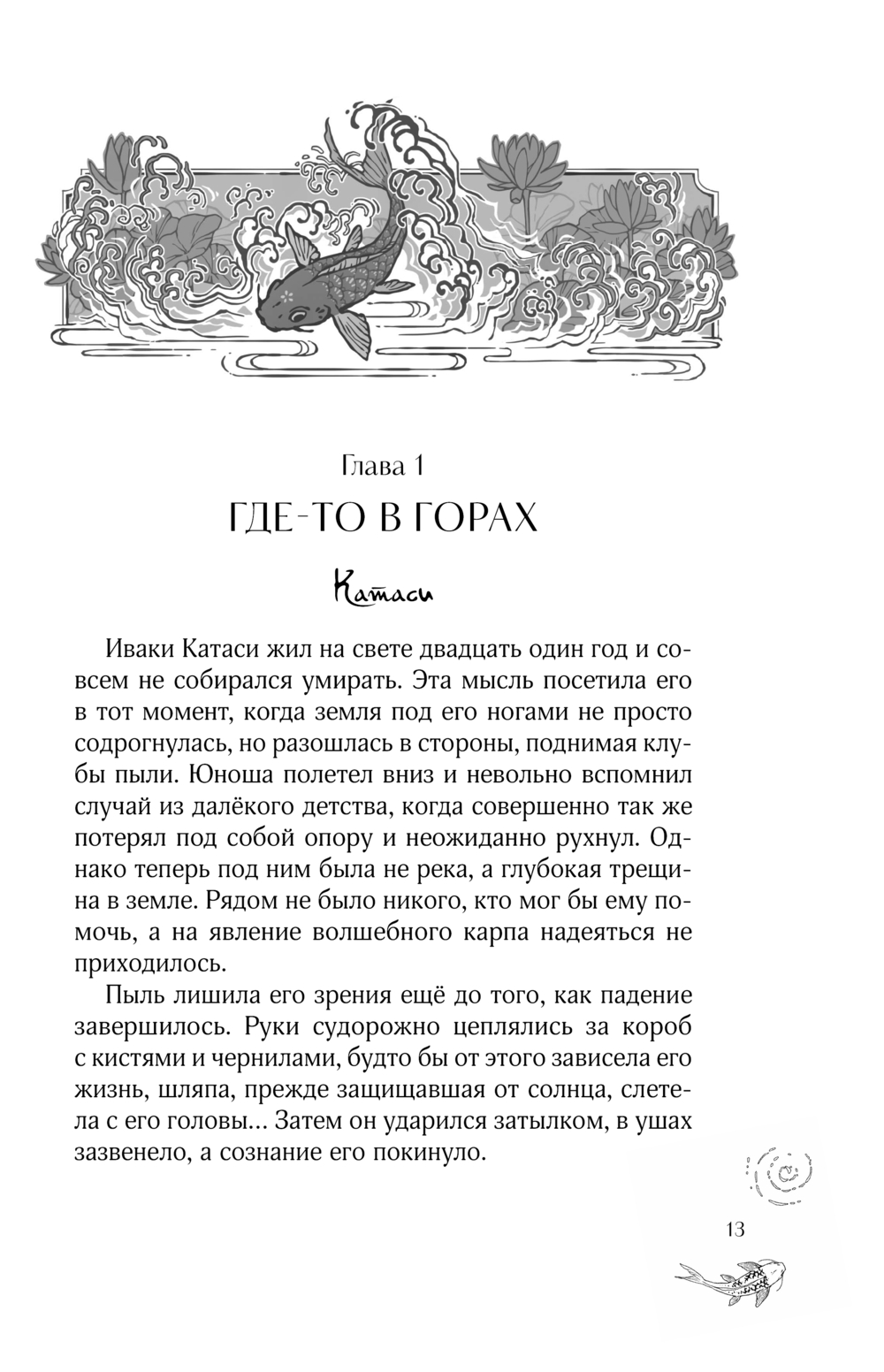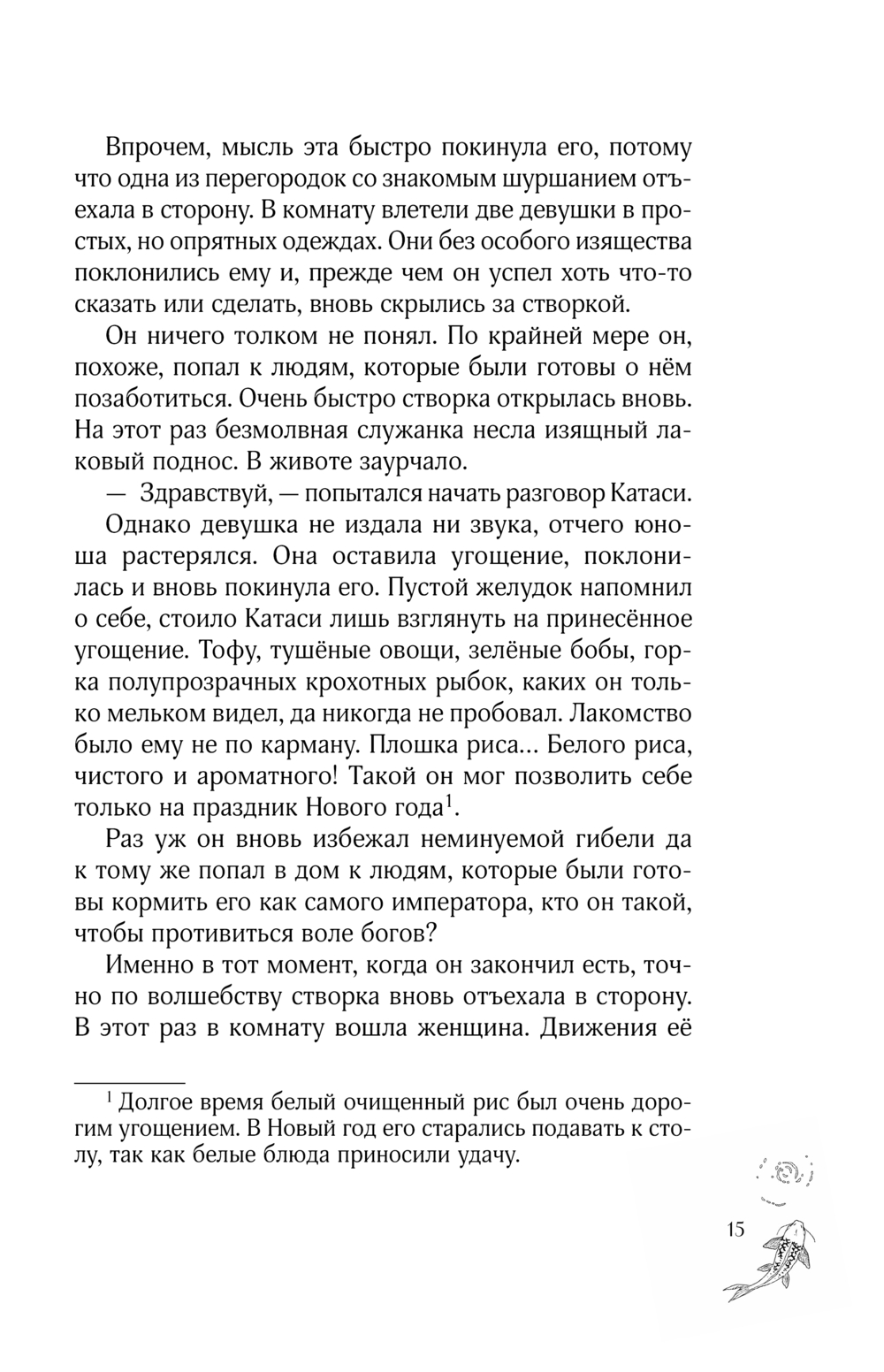 Не успев начаться, путешествие Катаси оборачивается полной катастрофой. Кажется, в доме госпожи Сойку ему готовы помочь. Только как такая красавица оказалась в глуши совершенно одна? Какие тайны хранит её прошлое? Почему племянница её, Юкия, живёт под замком и так сильно боится свою тётушку? И, главное, как со всем этим связана встреча с огромным карпом, отметившим Катаси ещё в детстве?