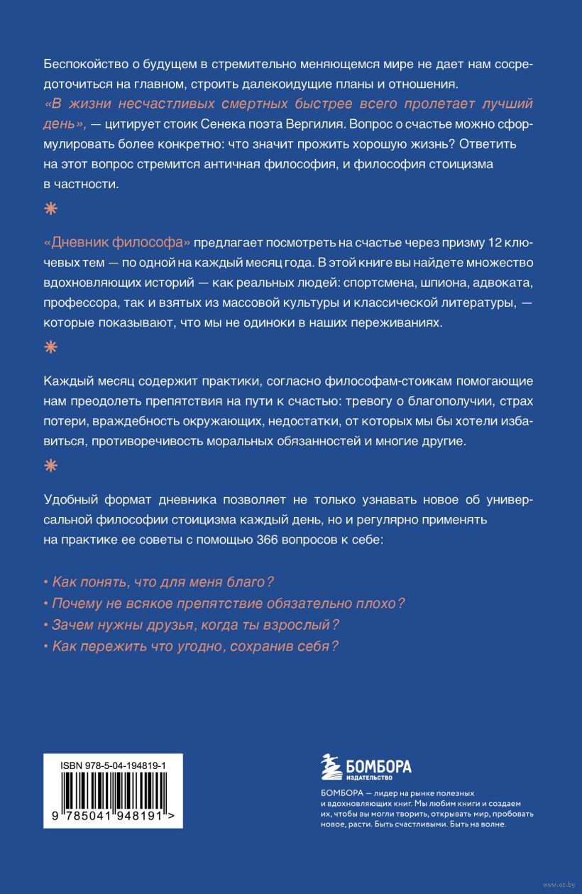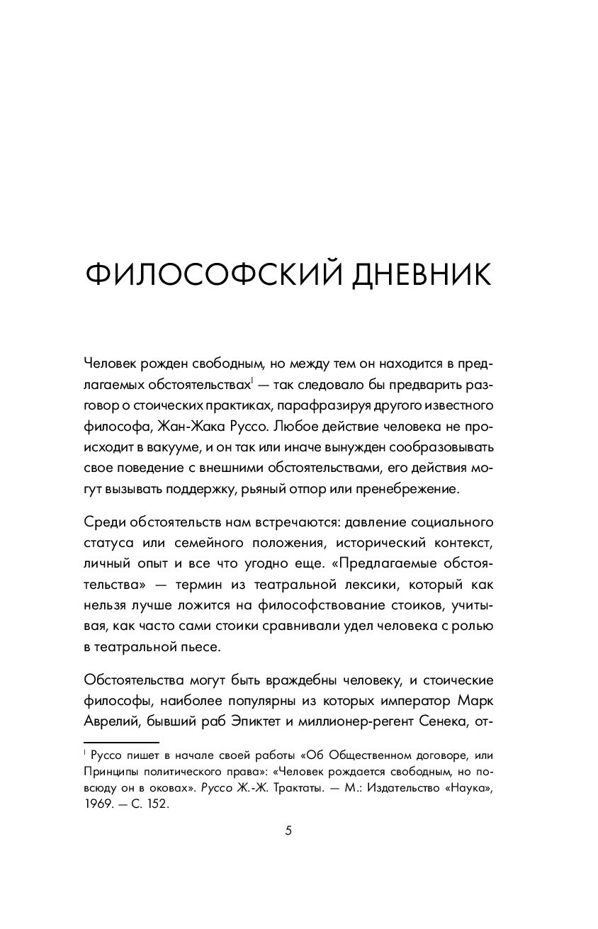 В современном мире, переполненном вызовами и возможностями, идеи стоицизма помогут найти опору и путь к желаемым переменам. Эпиктет, Сенека, Марк Аврелий – все они восхваляли пользу ведения дневника. Фиксация своих размышлений – одно из важнейших упражнений стоиков. Для них ежедневная практика и есть философия. Философия, которая уже более двух тысяч лет служит тайной основой для мудрых лидеров, выдающихся мыслителей, деятелей искусства и просто людей, стремящихся к осмыслению повседневности.