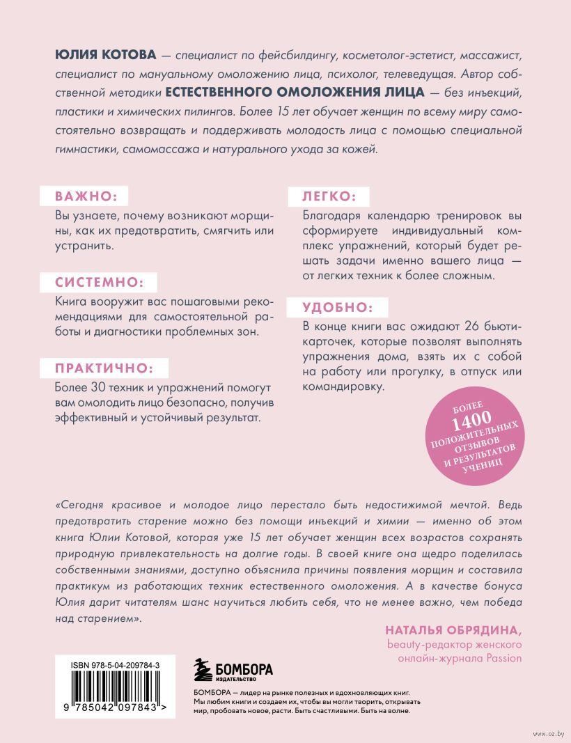 Чистая и гладкая кожа, подтянутый подбородок, упругий овал лица и здоровая шея – и все это без пластической хирургии и химических пилингов! Никакого волшебства, только ресурсы вашего организма и точное следование пошаговым техникам от эксперта по фэйсбилдингу Юлии Котовой. Пора устроить вашей коже настоящую тренировку, чтобы обрести внешность, о которой вы давно мечтали. Благодаря точным рекомендациям вы сможете самостоятельно определить свои проблемные зоны и подобрать необходимый комплекс упражнений, начиная с простых, переходя к более сложным. Вы избавитесь от морщин и отечностей, добьетесь четкого контура лица, устраните асимметрию и придадите губам объемный и насыщенный вид. Достичь гарантированного результата вам поможет календарь тренировок, а отрывные бьюти-карточки позволят выполнять упражнения дома, в отпуске и даже на работе.