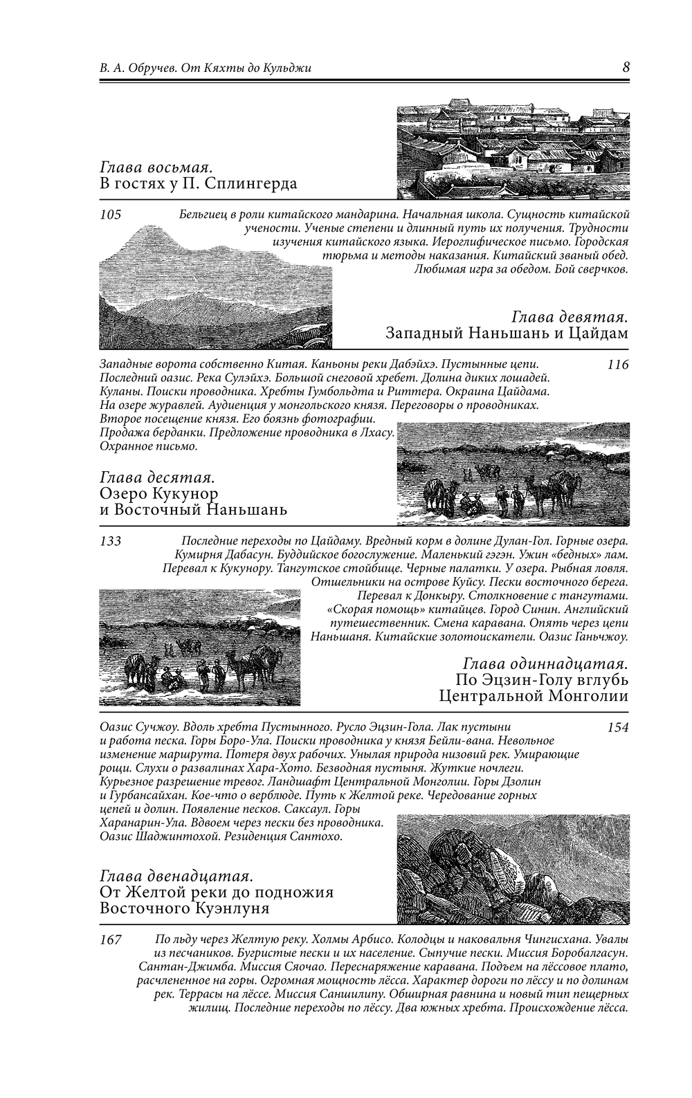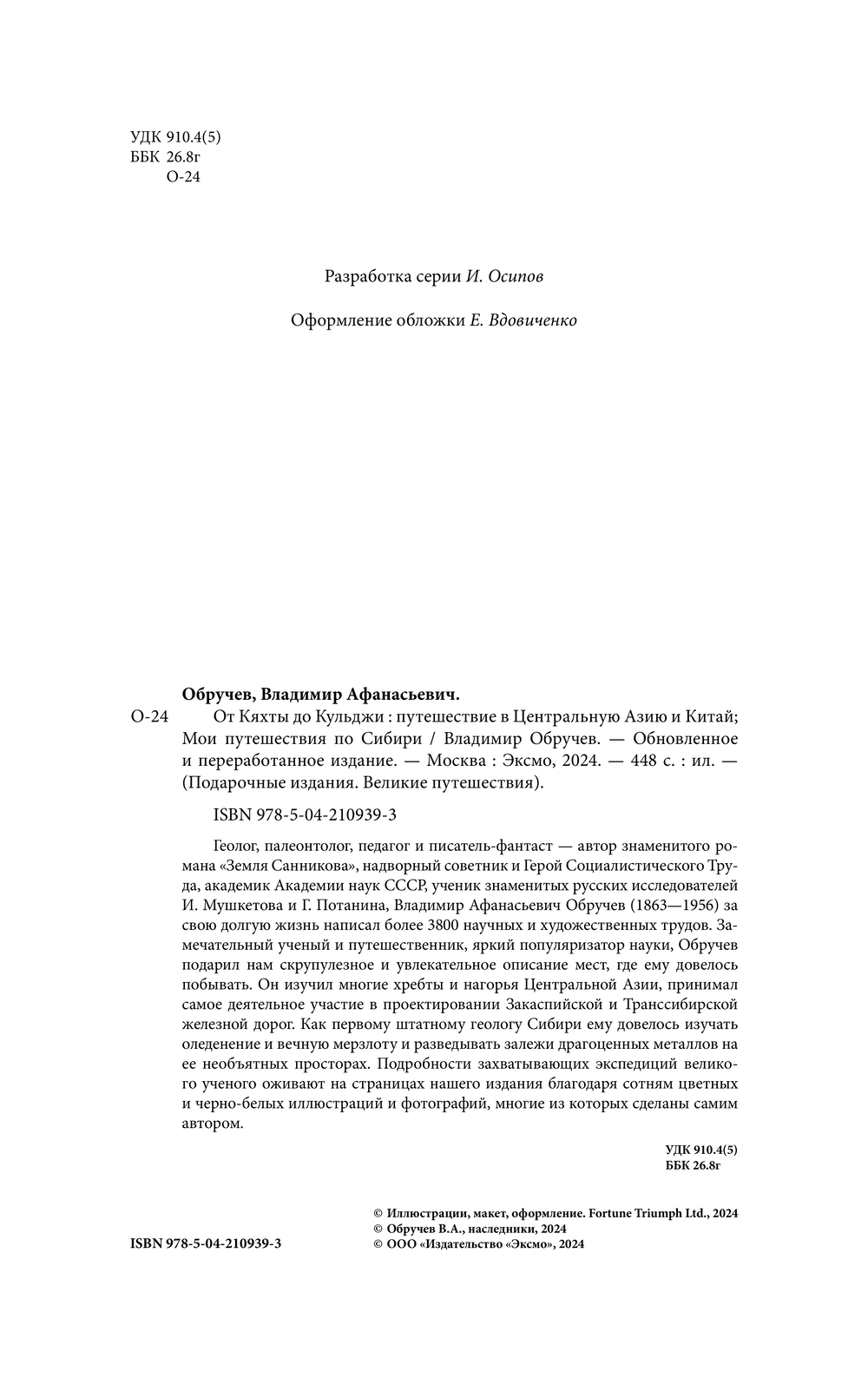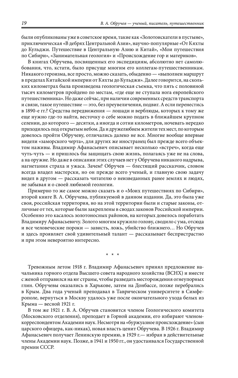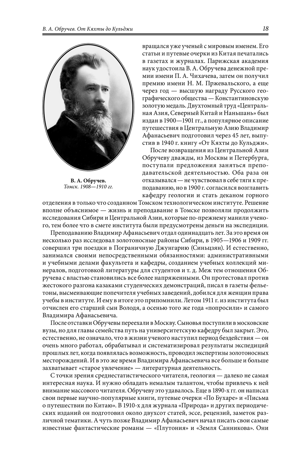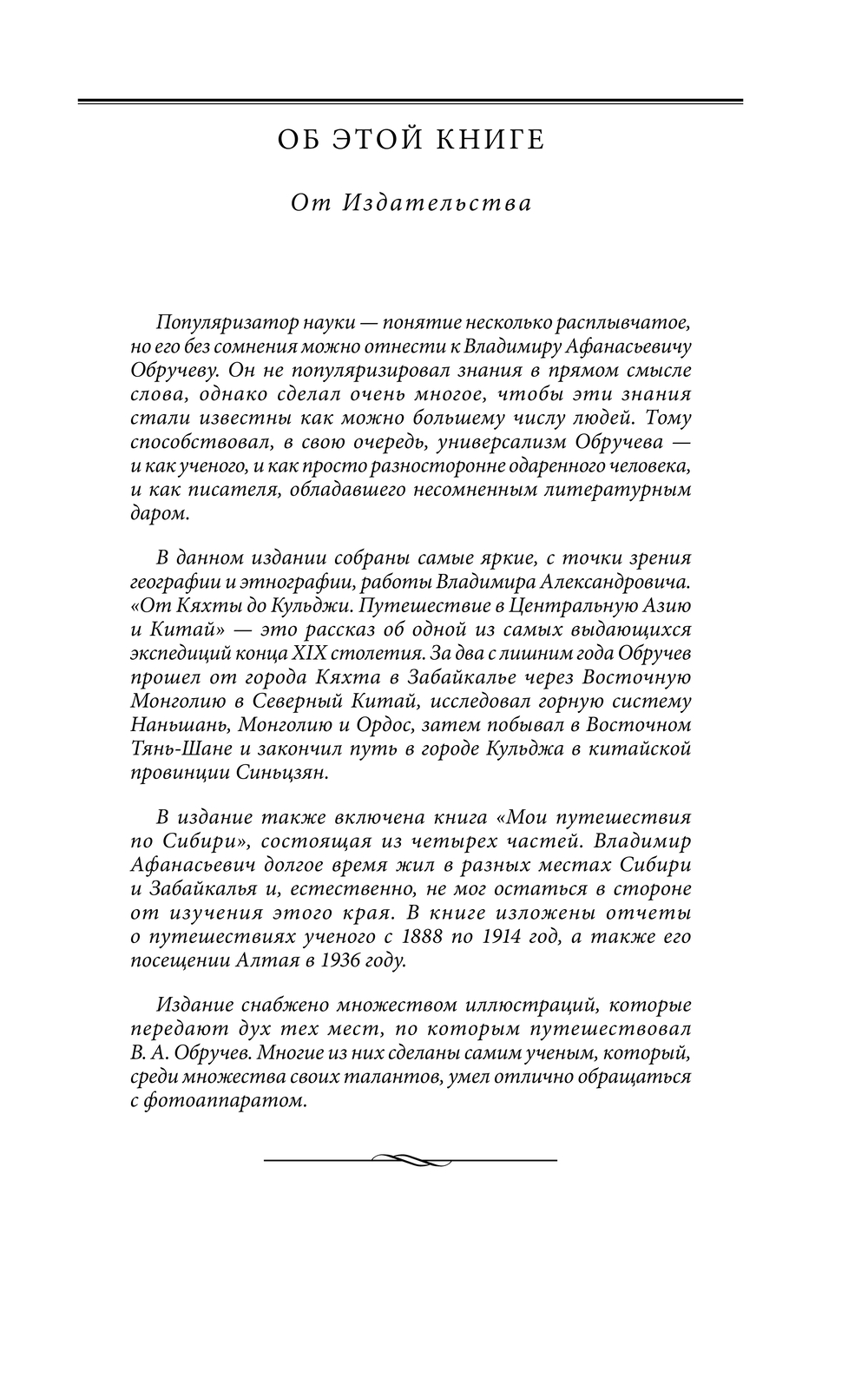 Геолог, палеонтолог, педагог и писатель-фантаст – автор знаменитого романа "Земля Санникова", надворный советник и Герой Социалистического Труда, академик Академии Наук СССР, ученик знаменитых русских исследователей И. Мушкетова и Г. Потанина, Владимир Афанасьевич Обручев (1863-1956) за свою долгую жизнь написал более 3800 научных и художественных трудов. Замечательный ученый и путешественник, яркий популяризатор науки, Обручев подарил нам скрупулезное и увлекательное описание мест, где ему довелось побывать. Он изучил многие хребты и нагорья Центральной Азии, принимал самое деятельное участие в проектировании Закаспийской и Транссибирской железной дорог. Как первому штатному геологу Сибири ему довелось изучать оледенение и вечную мерзлоту и разведывать залежи драгоценных металлов на ее необъятных просторах. Подробности захватывающих экспедиций великого ученого оживают на страницах нашего издания благодаря сотням цветных и черно-белых иллюстраций и фотографий, многие из которых сделаны самим автором.