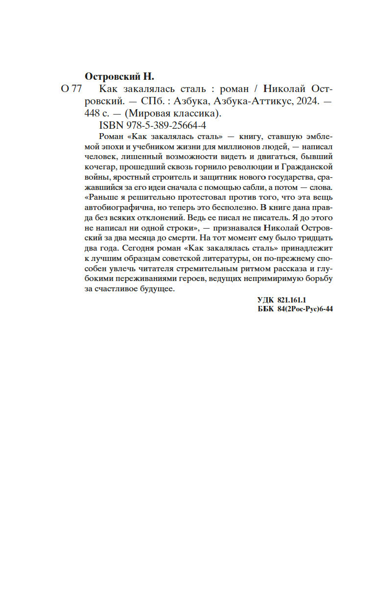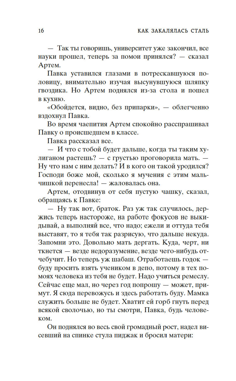 Роман "Как закалялась сталь" – книгу, ставшую эмблемой эпохи и учебником жизни для миллионов людей, – написал человек, лишенный возможности видеть и двигаться, бывший кочегар, прошедший сквозь горнило революции и Гражданской войны, яростный строитель и защитник нового государства, сражавшийся за его идеи сначала с помощью сабли, а потом – слова. "Раньше я решительно протестовал против того, что эта вещь автобиографична, но теперь это бесполезно. В книге дана правда без всяких отклонений. Ведь ее писал не писатель. Я до этого не написал ни одной строки", – признавался Николай Островский за два месяца до смерти. На тот момент ему было тридцать два года. Сегодня роман "Как закалялась сталь" принадлежит к лучшим образцам советской литературы, он по-прежнему способен увлечь читателя стремительным ритмом рассказа и глубокими переживаниями героев, ведущих непримиримую борьбу за счастливое будущее.