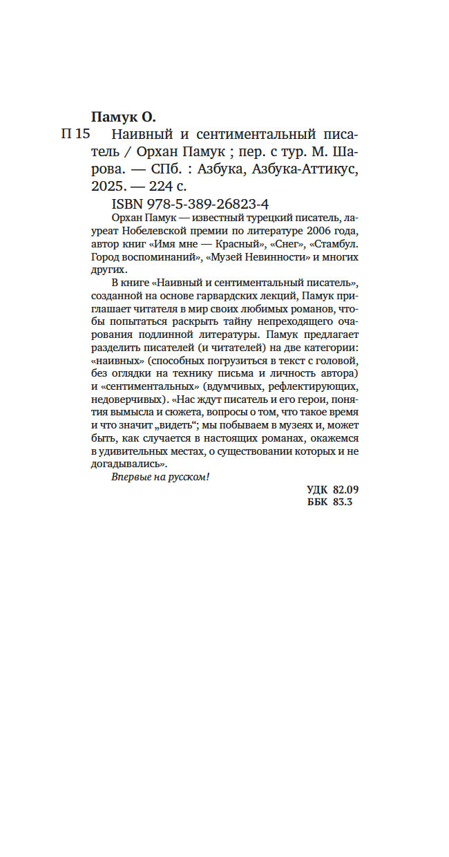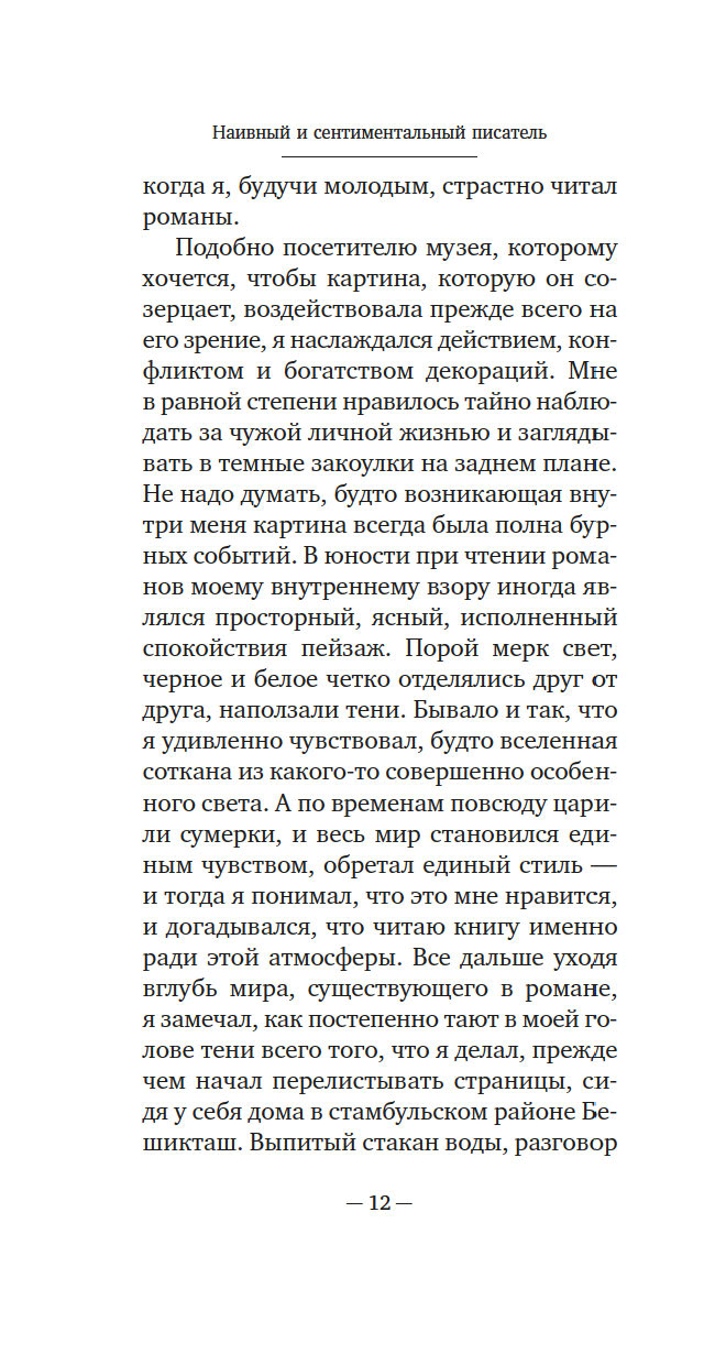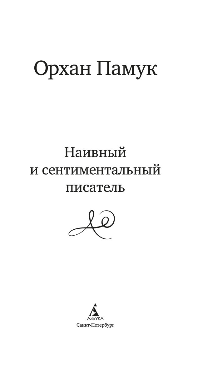 В книге "Наивный и сентиментальный писатель", созданной на основе гарвардских лекций, Памук приглашает читателя в мир своих любимых романов, чтобы попытаться раскрыть тайну непреходящего очарования подлинной литературы. Памук предлагает разделить писателей (и читателей) на две категории: "наивных" (способных погрузиться в текст с головой, без оглядки на технику письма и личность автора) и "сентиментальных" (вдумчивых, рефлектирующих, недоверчивых). "Нас ждут писатель и его герои, понятия вымысла и сюжета, вопросы о том, что такое время и что значит „видеть"; мы побываем в музеях и, может быть, как случается в настоящих романах, окажемся в удивительных местах, о существовании которых и не догадывались".
