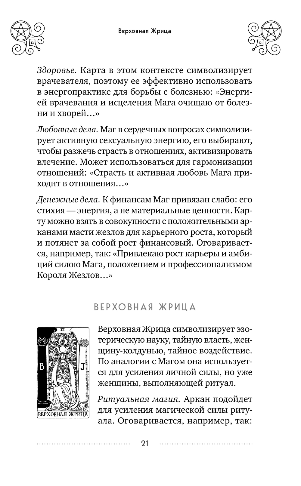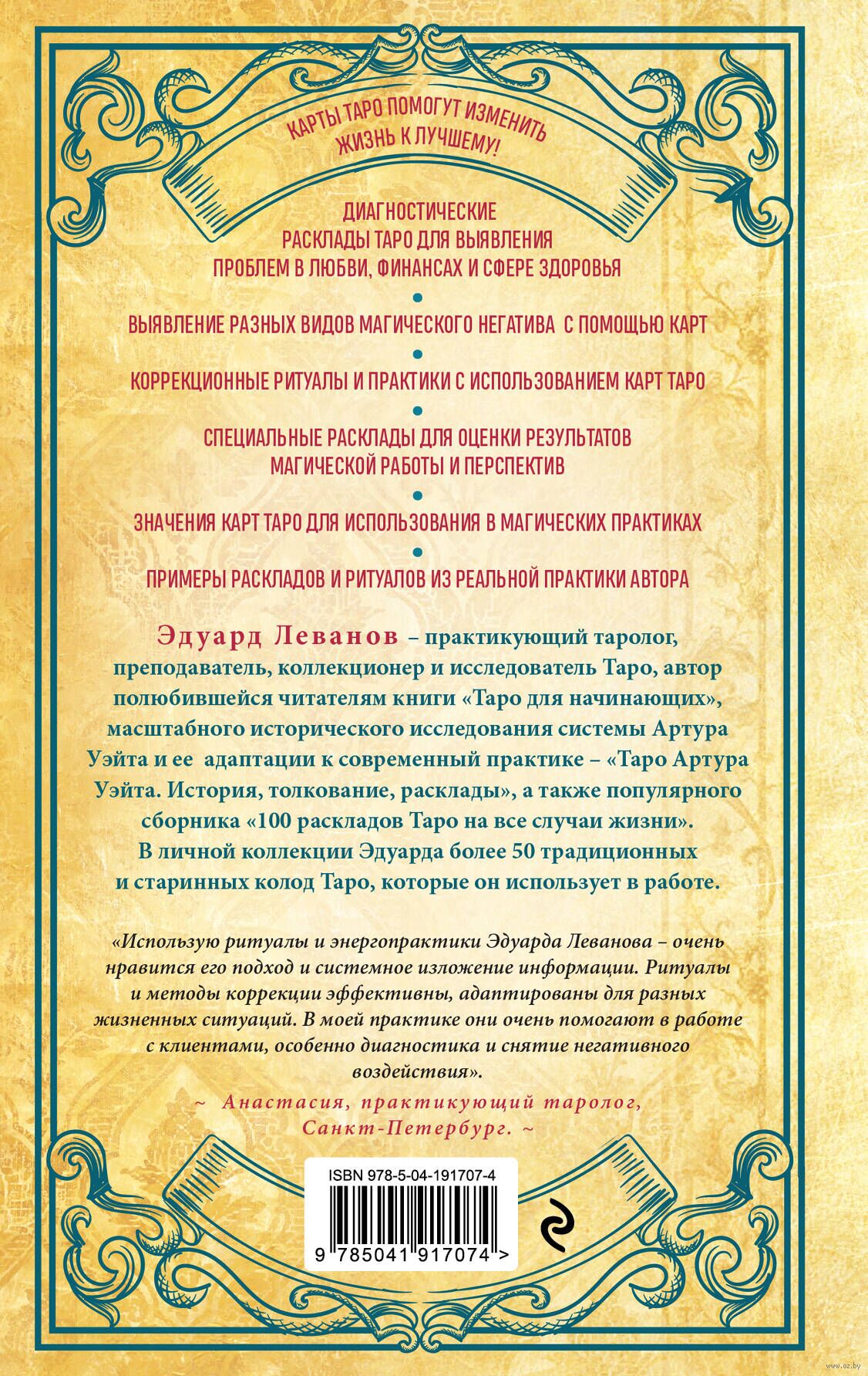 Это практическое руководство включает диагностические расклады для выявления проблем в любви, финансах и сфере здоровья, а также определения разных видов магического негатива. В ней вы найдете коррекционные ритуалы и практики с использованием карт Таро, которые помогут решить проблему, а также специальные расклады для оценки результатов магической работы и дальнейших перспектив. Все расклады и ритуалы сопровождаются разбором реальных примеров из практики автора. Книга также включает специальные значения карт Таро для использования в магических практиках.