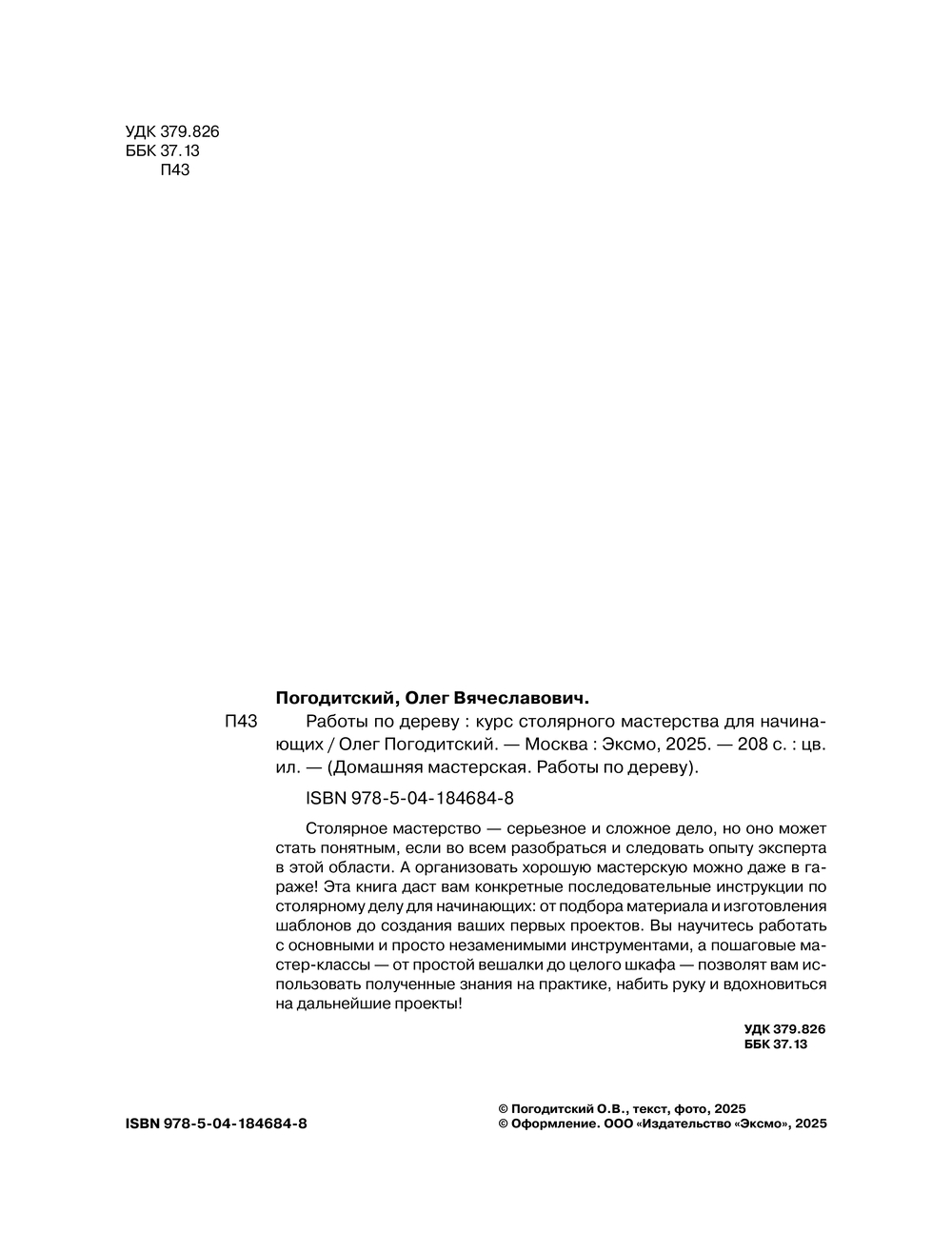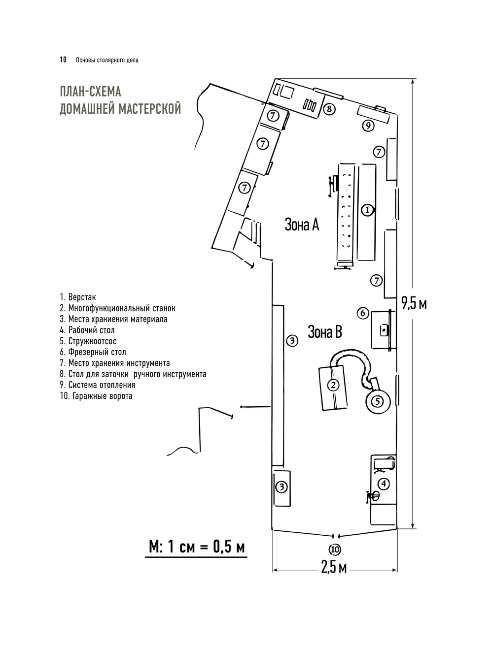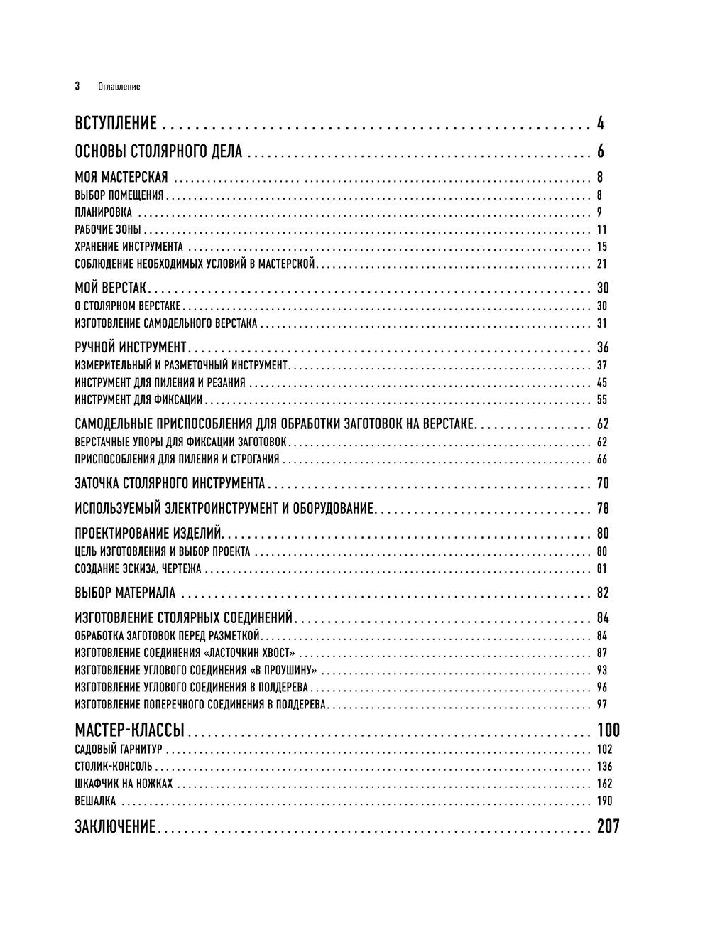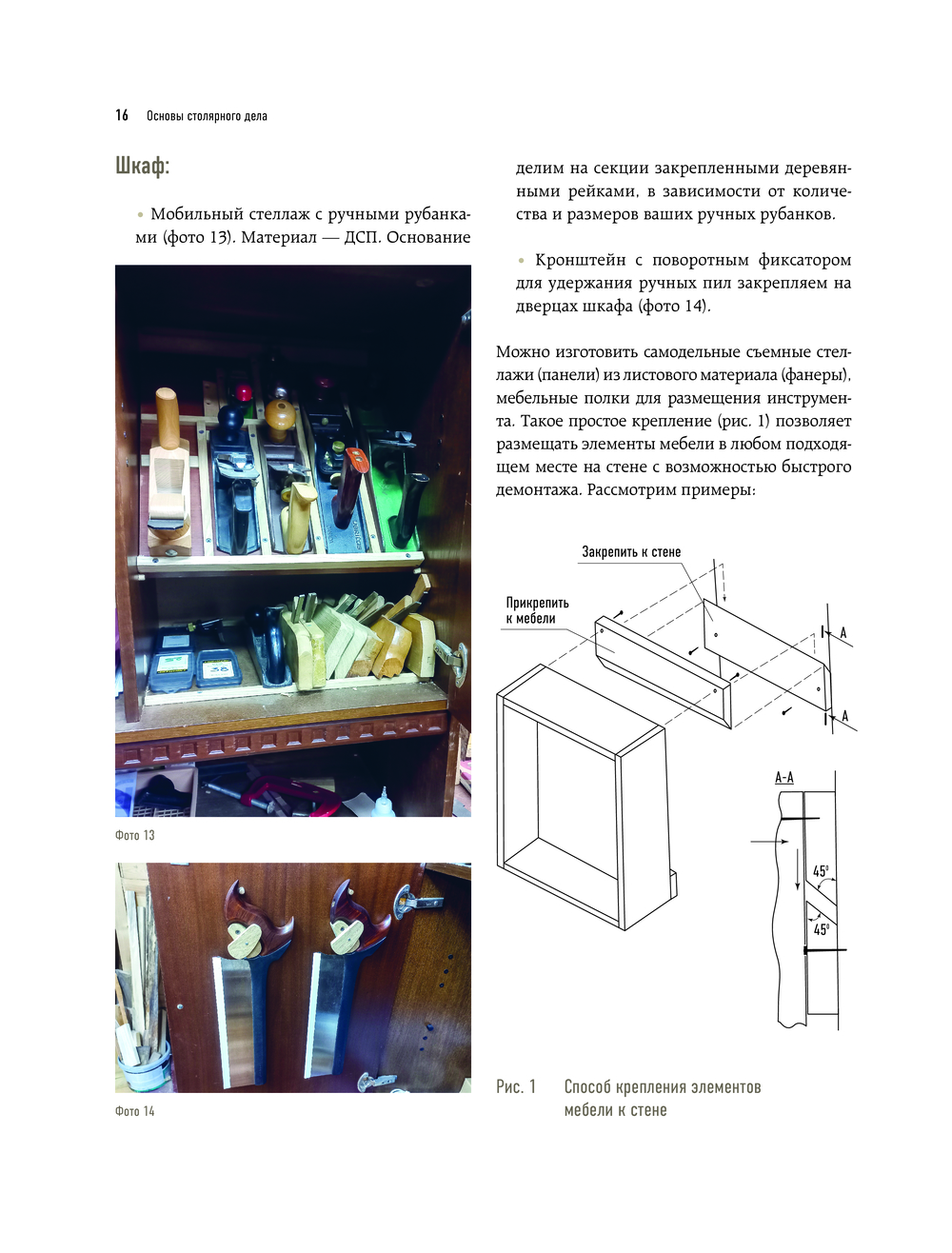 Столярное мастерство – серьезное и сложное дело, но оно может стать понятным, если во всем разобраться и следовать опыту эксперта в этой области. А организовать хорошую мастерскую можно даже в гараже! Эта книга даст вам конкретные последовательные инструкции по столярному делу для начинающих: от подбора материала и изготовления шаблонов до создания ваших первых проектов. Вы научитесь работать с основными и просто незаменимыми инструментами, а пошаговые мастер-классы – от простой вешалки до целого шкафа – позволят вам использовать полученные знания на практике, набить руку и вдохновиться на дальнейшие проекты!