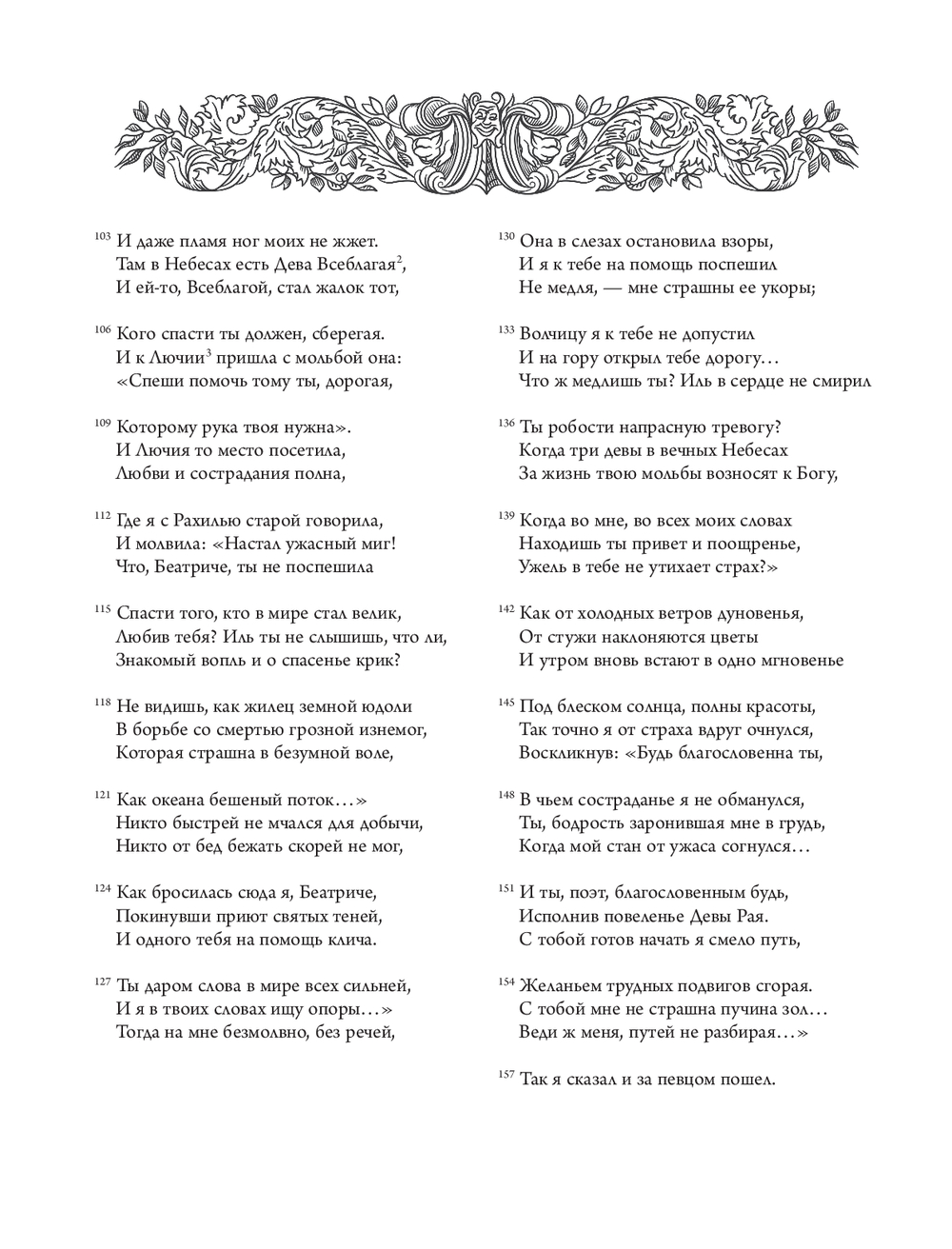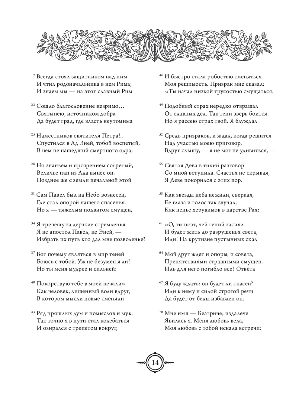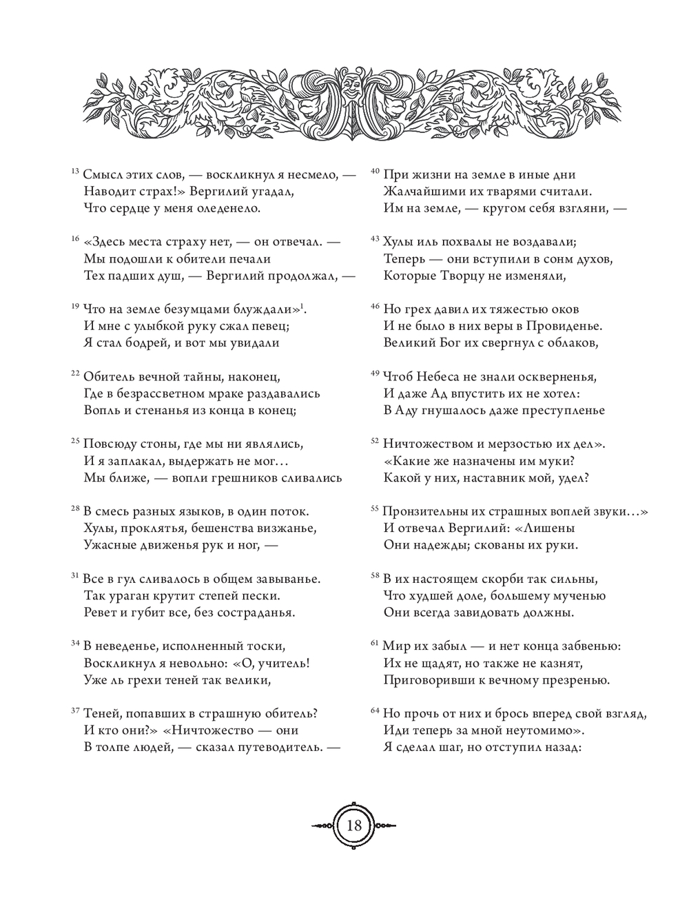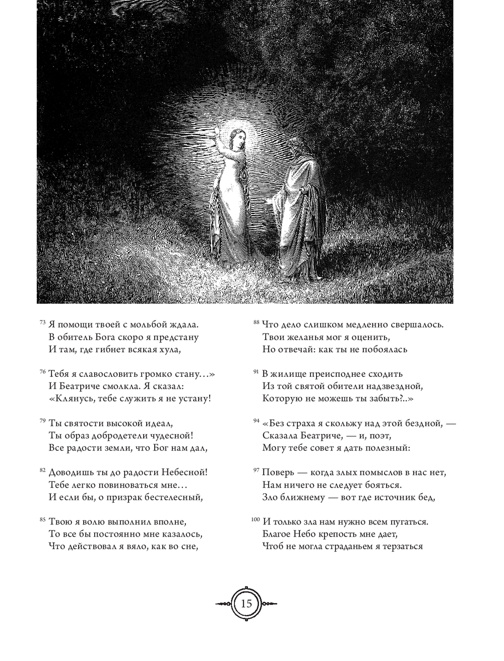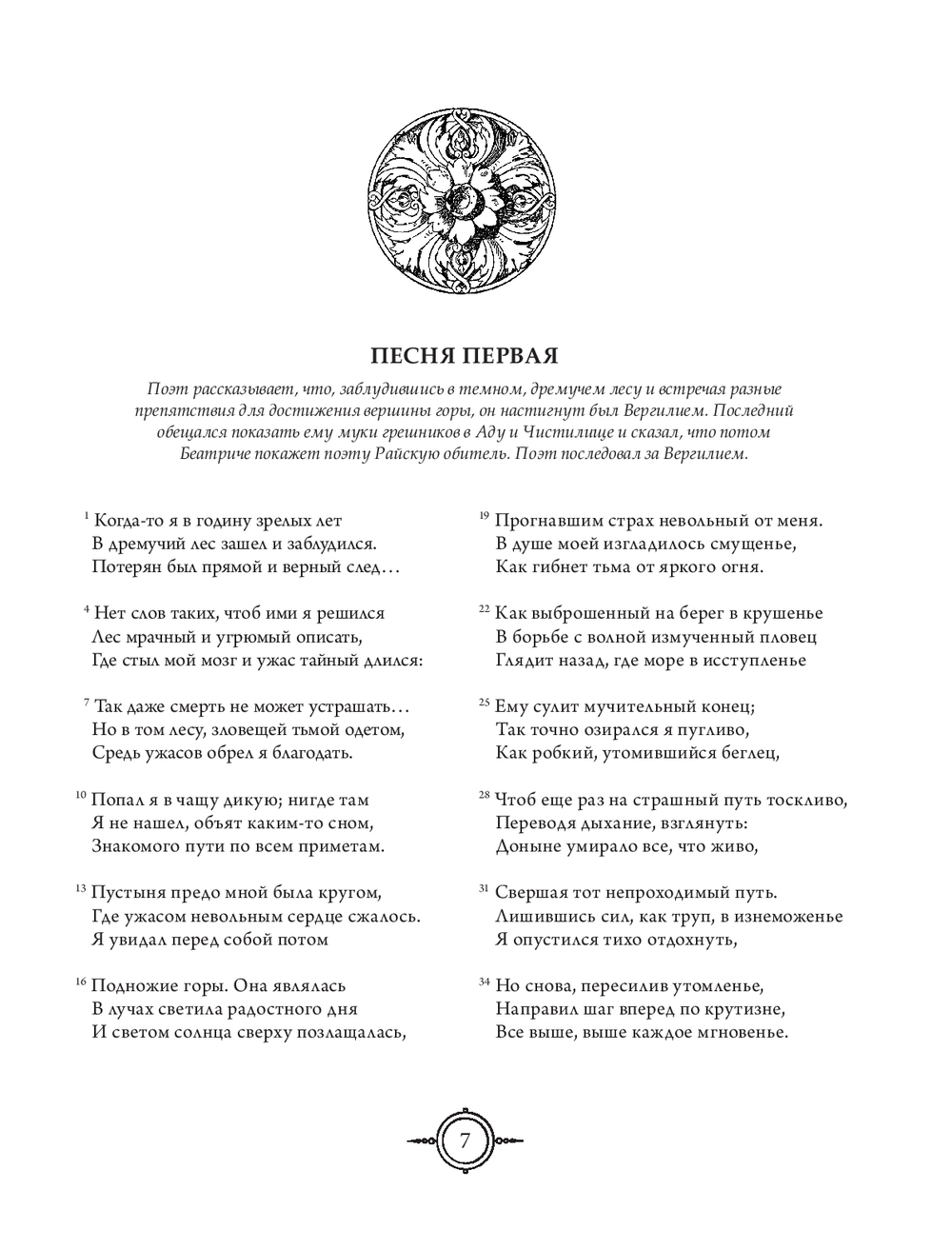 "Божественную комедию" можно прочесть и как величайшее признание в любви: из всех способов восславить свою возлюбленную Беатриче Данте избрал наиболее возвышенный, подарив ей бессмертие в раю рядом с Богом и в людской памяти. Но прежде всего это одиссея человеческой души, странствие к ее глубинам и высотам в поисках обновления и возрождения к новой жизни. Спустя столетия Данте становится нашим собственным Вергилием и приглашает уже нас самих в путешествие не из легких – по нашему внутреннему аду, чистилищу и раю. И тем не менее даже там, где царит суровая дихотомия добра и зла, остается место надежде и утешению: ад Данте головокружительно глубок, но все же не бездонен, и именно через самые темные глубины пролегает путь наверх, к свету.