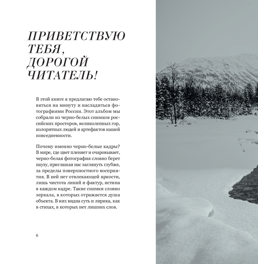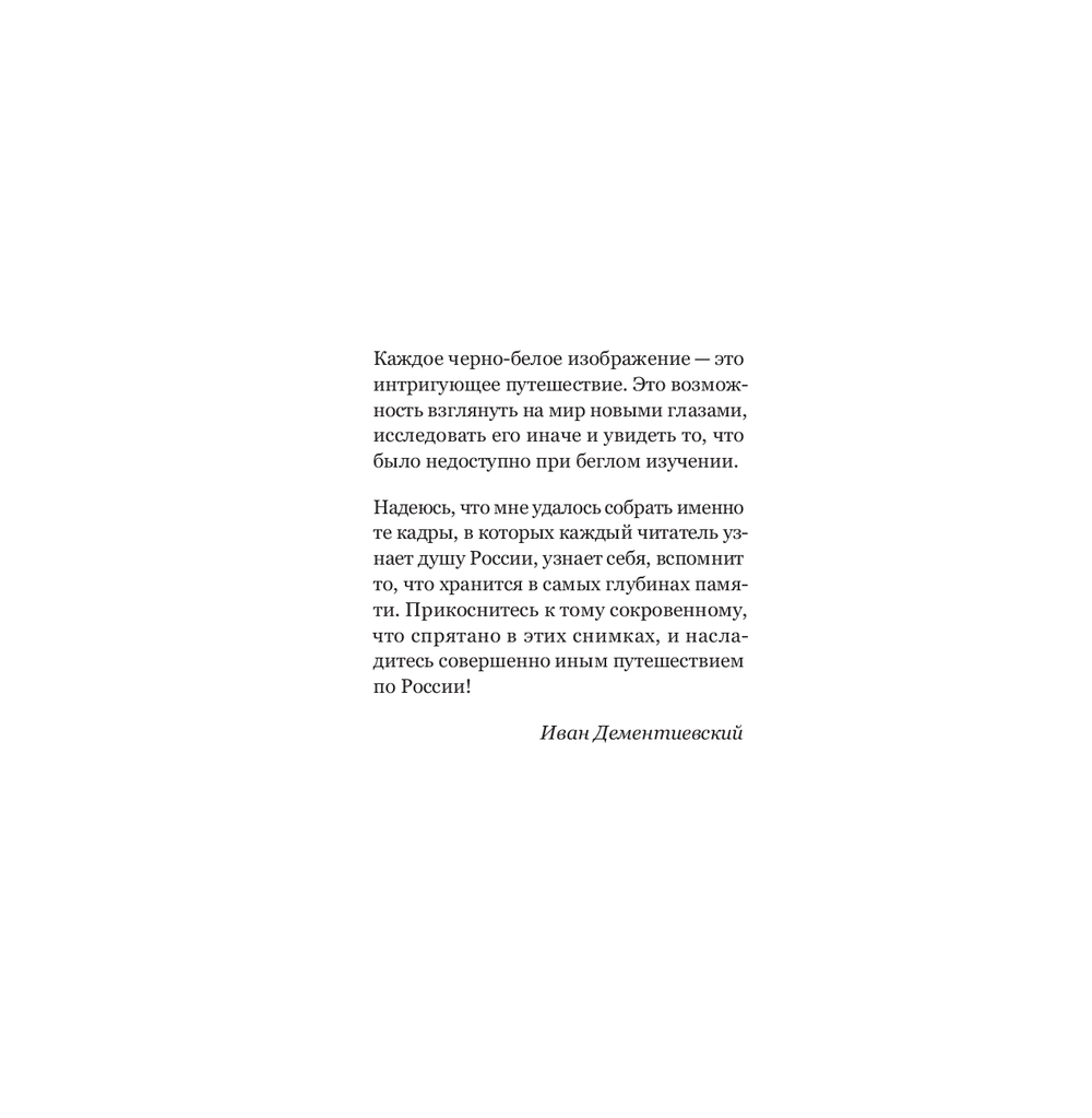 Этот альбом предлагает читателю взглянуть с другого ракурса не только на Россию, но и внутрь себя. Ведь черно-белые снимки это не просто отсутствие цвета, это мощный инструмент, позволяющий увидеть эмоцию в каждом сюжете. Каждый элемент кадра – это тщательно продуманное сочетание форм, смыслов, света и тени.