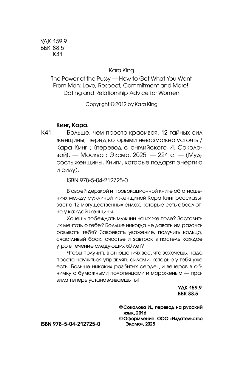 В своей дерзкой и провокационной книге об отношениях между мужчиной и женщиной Кара Кинг рассказывает о 12 могущественных силах, которые есть абсолютно у каждой женщины.