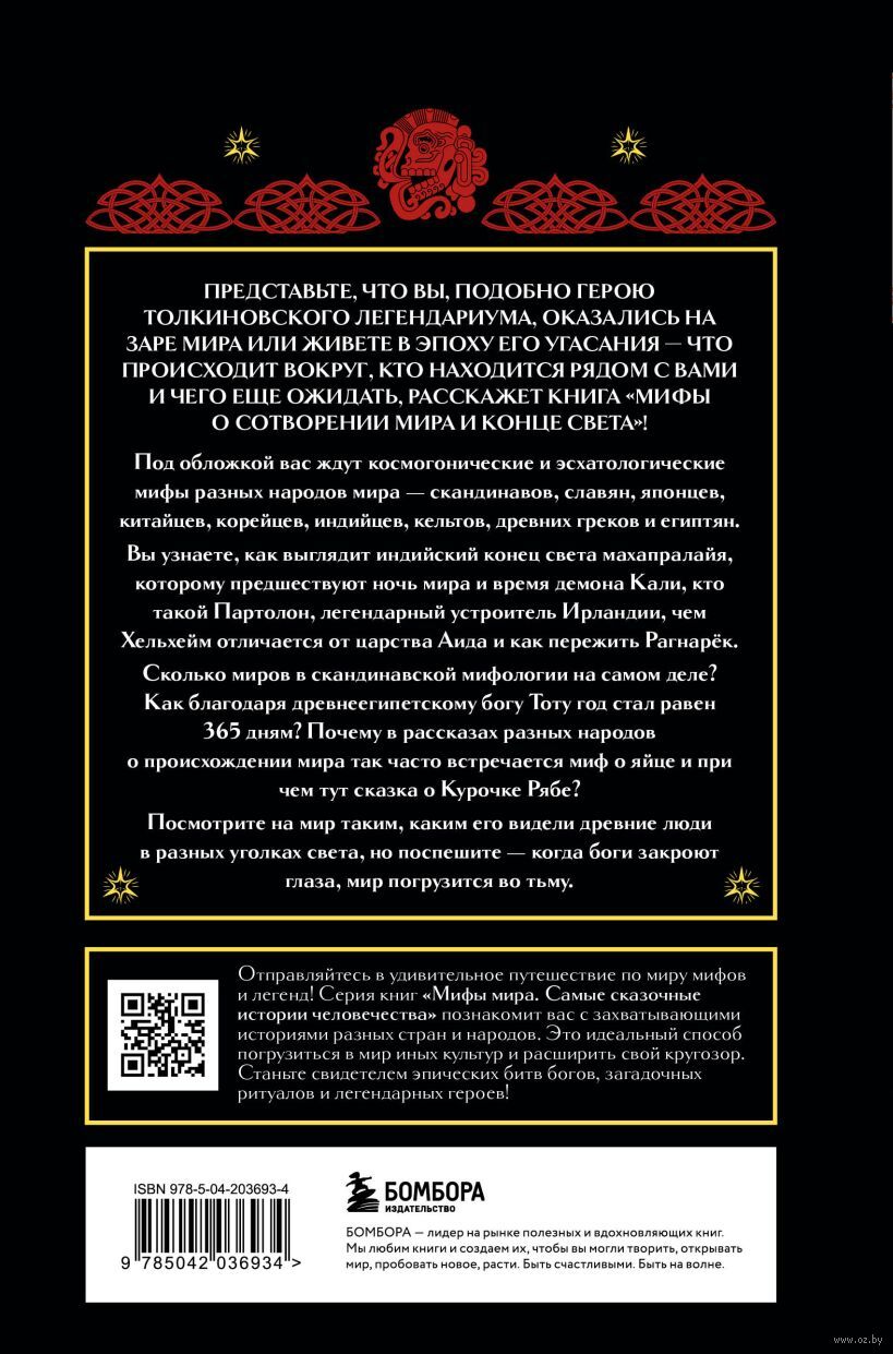 Книга "Мифы о сотворении мира и конце света" приглашает совершить путешествие сквозь время и пространство и увидеть мир глазами древних людей. Под обложкой собраны космогонические (о происхождении вселенной), этиологические (о появлении природы, небесных светил, растений и животных), антропологические (о рождении человека) и эсхатологические (о конце света) мифы разных народов – древних греков и египтян, индийцев, кельтов, скандинавов, славян, японцев, китайцев, корейцев. Для предков современных людей эти мифы не просто объясняли устройство мира и происхождение всего вокруг, но и устанавливали социальный порядок, закладывали представления о хорошем и плохом, становились основой культуры и быта. Герои и сюжеты этих сказаний во многом схожи, однако каждый народ и цивилизация по-своему отвечают на вечные вопросы: Откуда мы пришли? Кто мы? Куда мы идем?