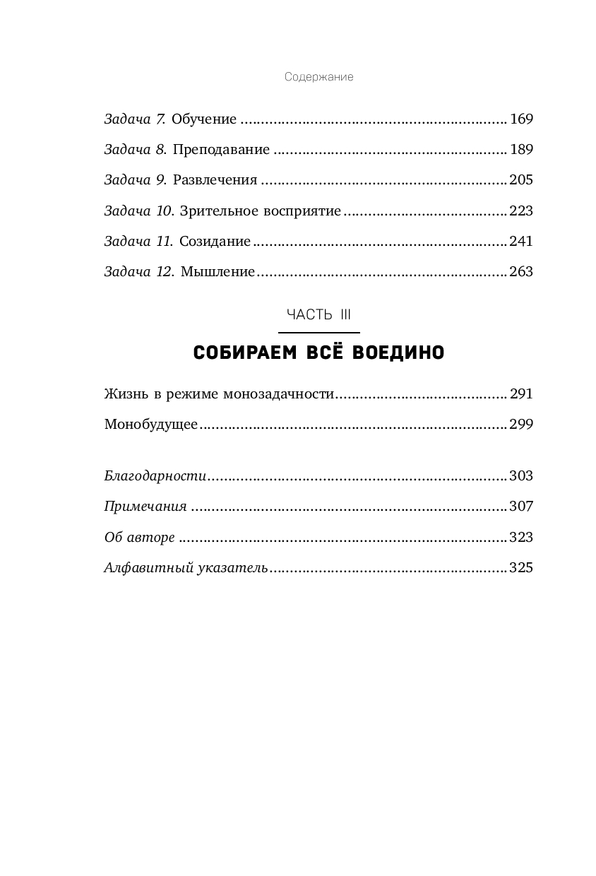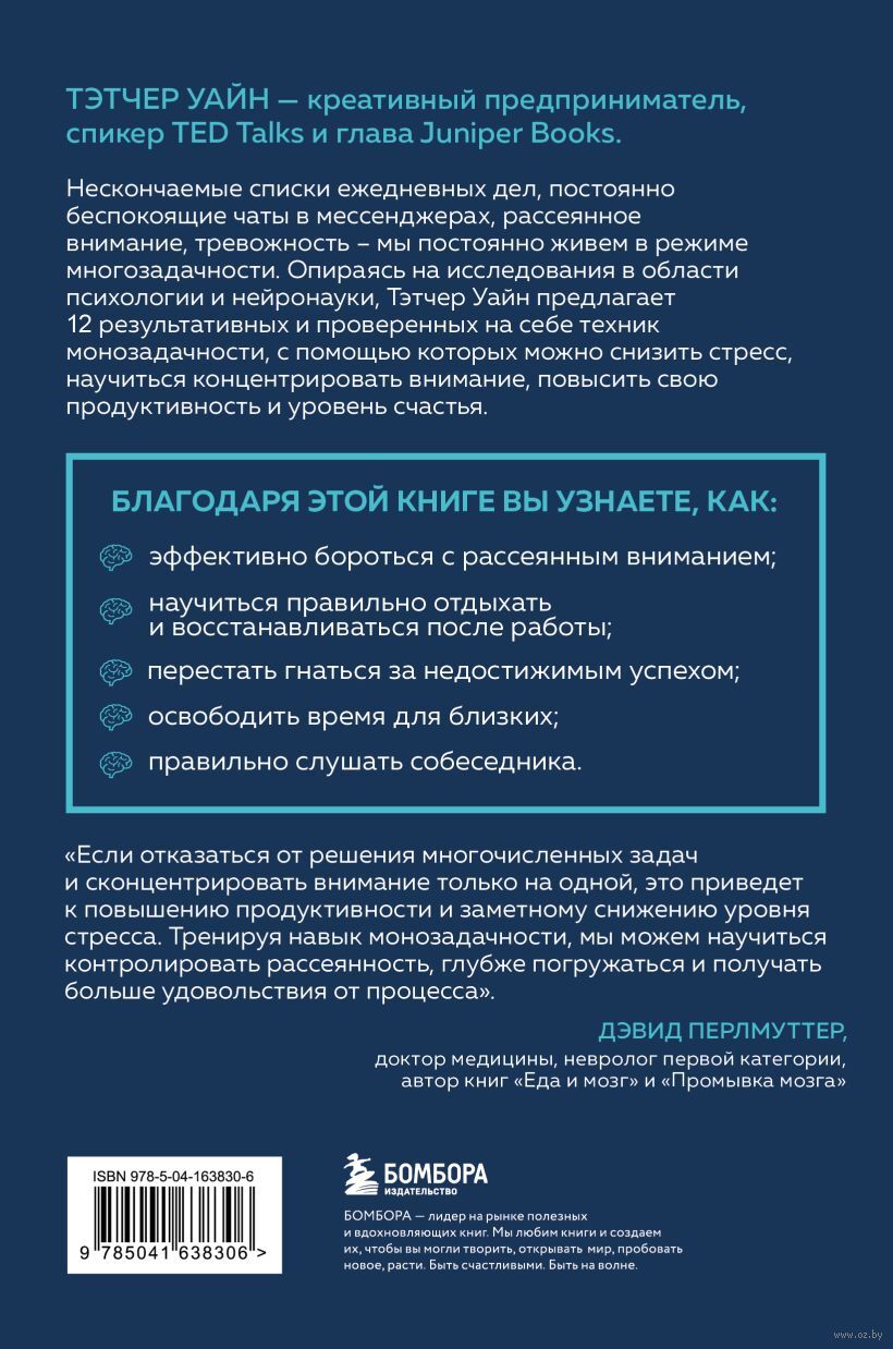 Нескончаемые списки ежедневных дел, постоянно беспокоящие чаты в мессенджерах, рассеянное внимание, тревожность – мы постоянно живем в режиме многозадачности. Опираясь на исследования в области психологии и нейронауки, Тэтчер Уайн предлагает 12 результативных и проверенных на себе техник монозадачности, с помощью которых можно снизить стресс, научиться концентрировать внимание, повысить свою продуктивность и уровень счастья.