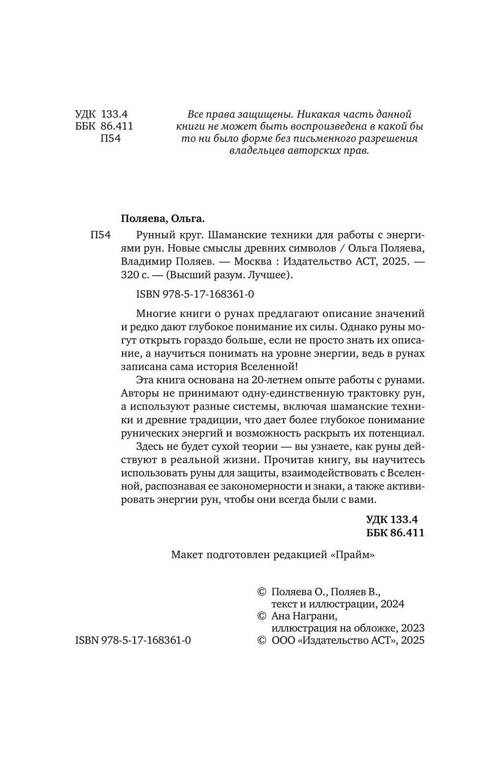 Потратив на знакомство с рунами более двадцати лет, Ольга и Владимир Поляев написали книгу, чтобы поделиться своими открытиями о них. Авторы обращались не только к истории Скандинавии, но также изучали традиции толтеков, суфиев и шаманов, чтобы сполна понять могущественную силу древних символов. Книга вобрала в себя философскую мудрость наших предков и предлагает читателю уникальный подход к изучению рун.