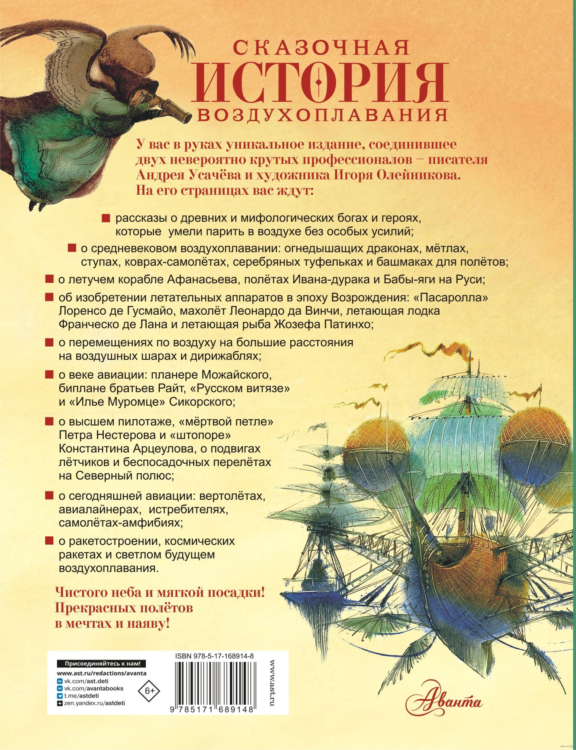 Вы держите в руках полноценную энциклопедия, посвященную воздухоплаванию. В ней и история развития воздухоплавания (от летательных аппаратов эпохи Возрождения, воздушных шаров и дирижаблей до реактивных самолетов и космических ракет), и рассказы о веке авиации, о планерах и бипланах, а также о потрясающих подвигах летчиков. Кроме того, о мифах, легендах и литературных произведениях, герои которых летают, используя ковры-самолеты и ступы, птиц и пушечные ядра, зонтики и моторчики, а то и совсем необычные средства...