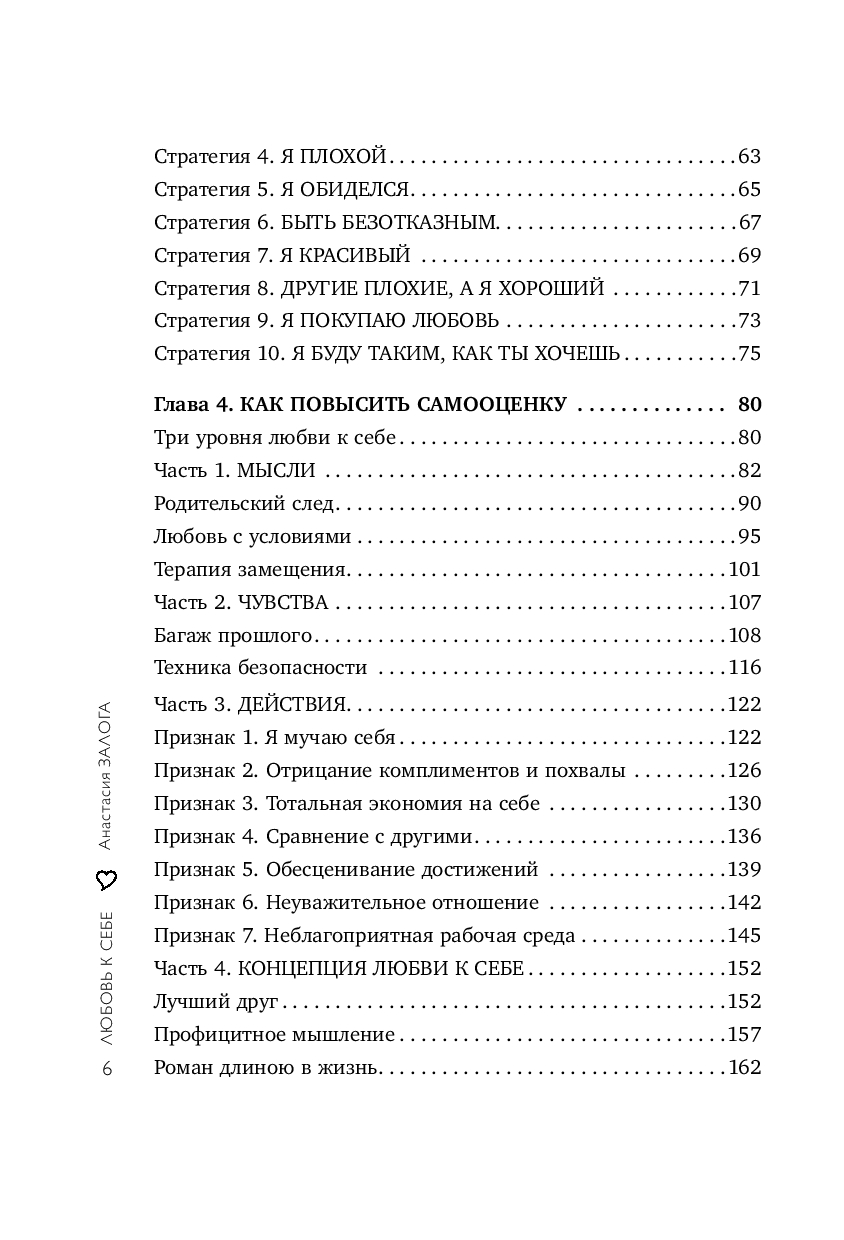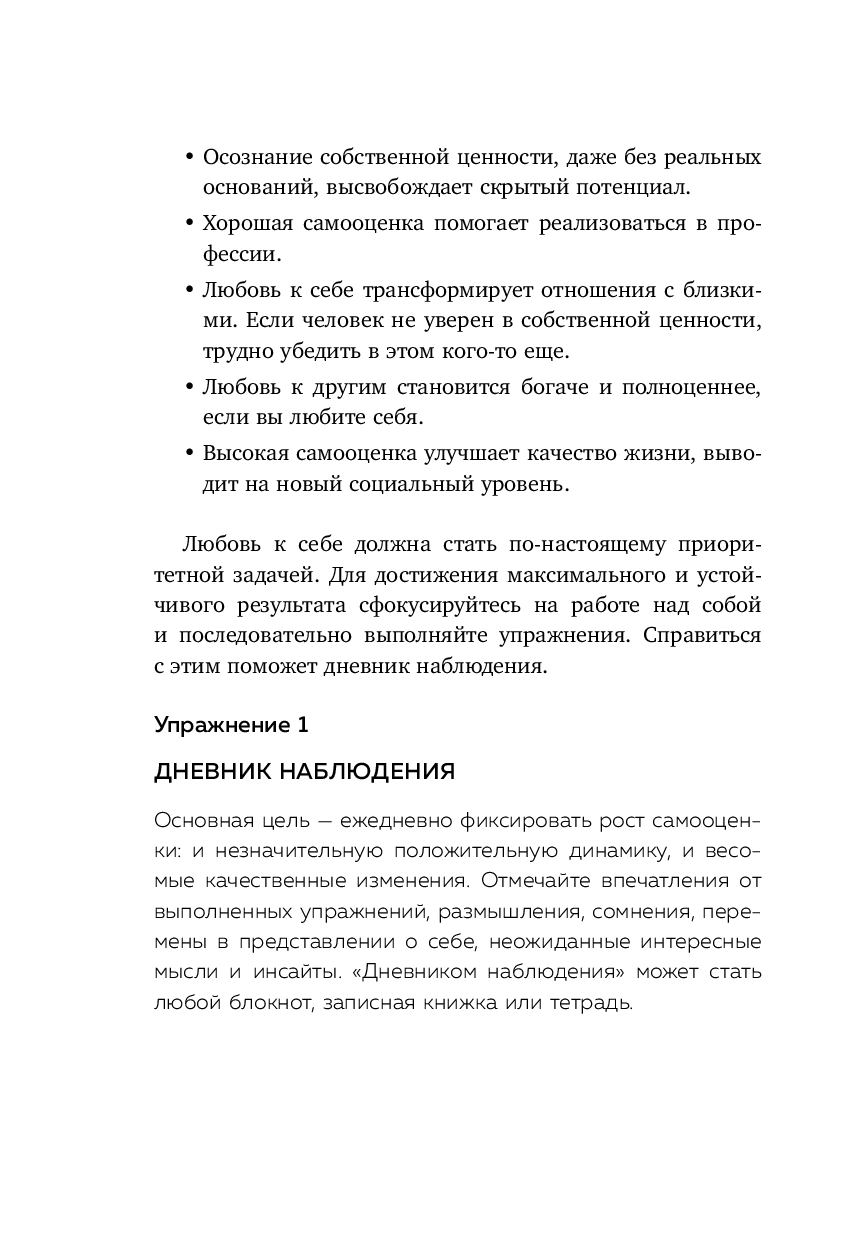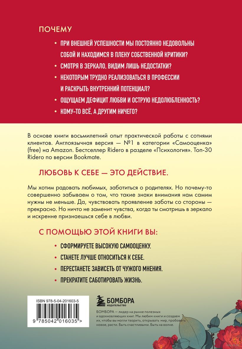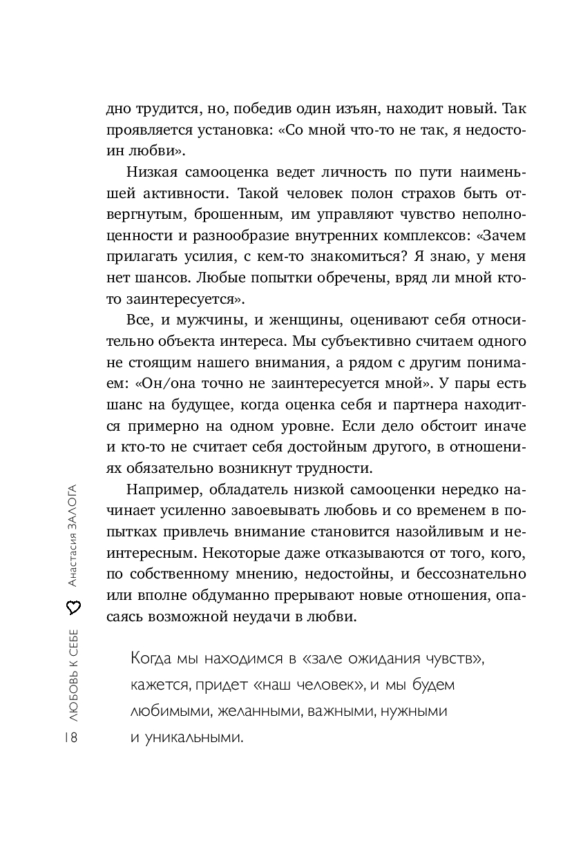 За 10 лет практического опыта с клиентами Анастасия Залога собрала самые эффективные способы полюбить себя. В каждой главе этой книги вы найдете практические упражнения, которые помогут шаг за шагом прийти к внутренней гармонии, сформировать правильную самооценку, принять свое тело и полюбить себя на всех уровнях. В этой уникальной методике нет универсальных шаблонов, но есть общий базовый фундамент, на котором каждому предстоит самостоятельно выстроить качественно новые отношения с собой.