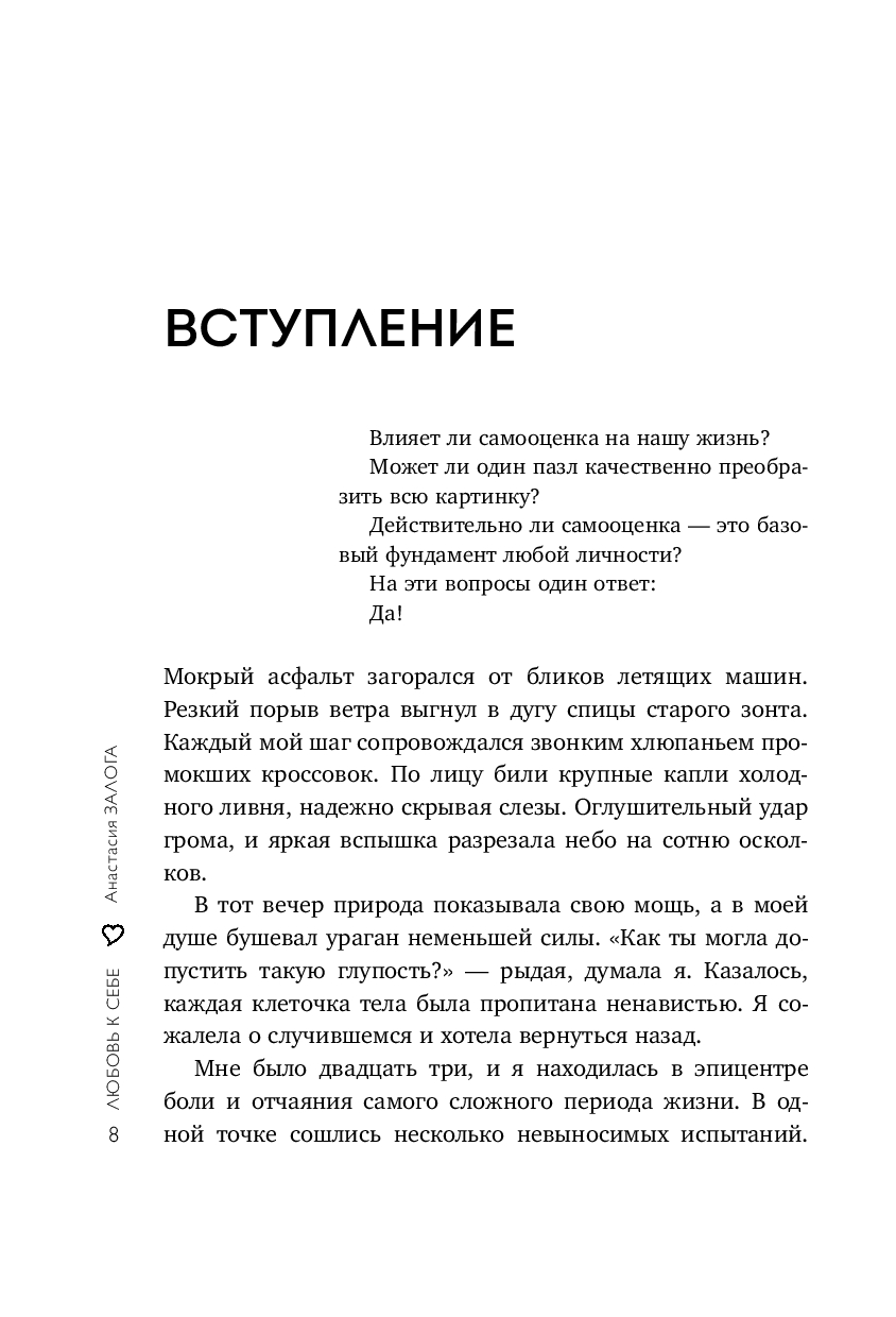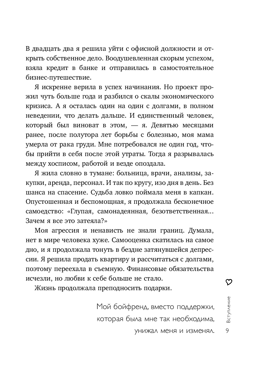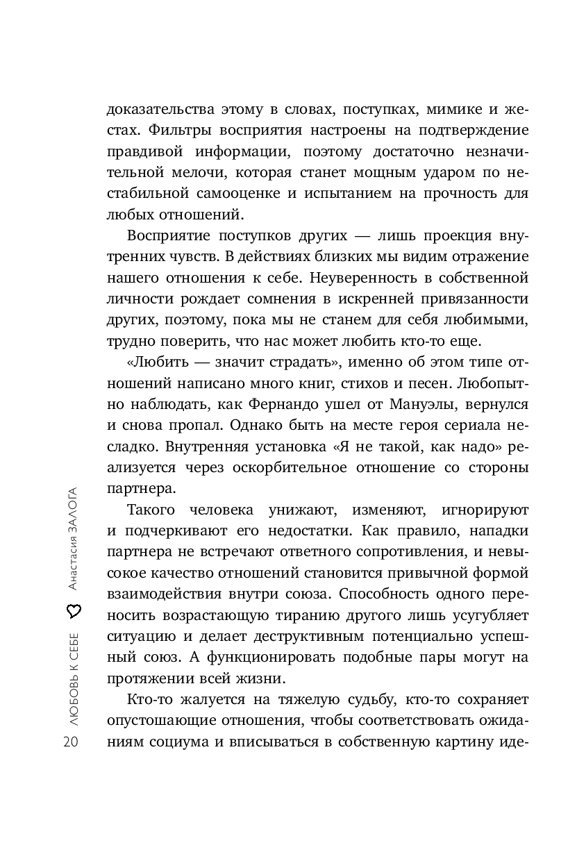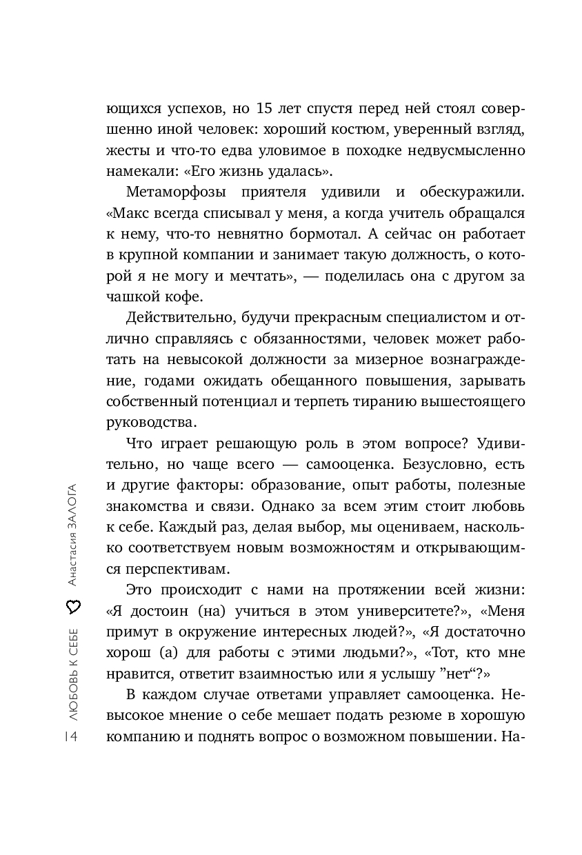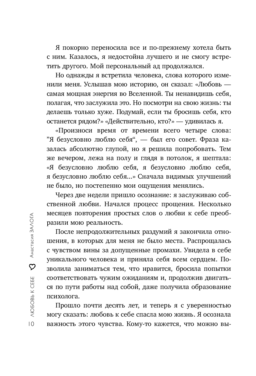 За 10 лет практического опыта с клиентами Анастасия Залога собрала самые эффективные способы полюбить себя. В каждой главе этой книги вы найдете практические упражнения, которые помогут шаг за шагом прийти к внутренней гармонии, сформировать правильную самооценку, принять свое тело и полюбить себя на всех уровнях. В этой уникальной методике нет универсальных шаблонов, но есть общий базовый фундамент, на котором каждому предстоит самостоятельно выстроить качественно новые отношения с собой.
