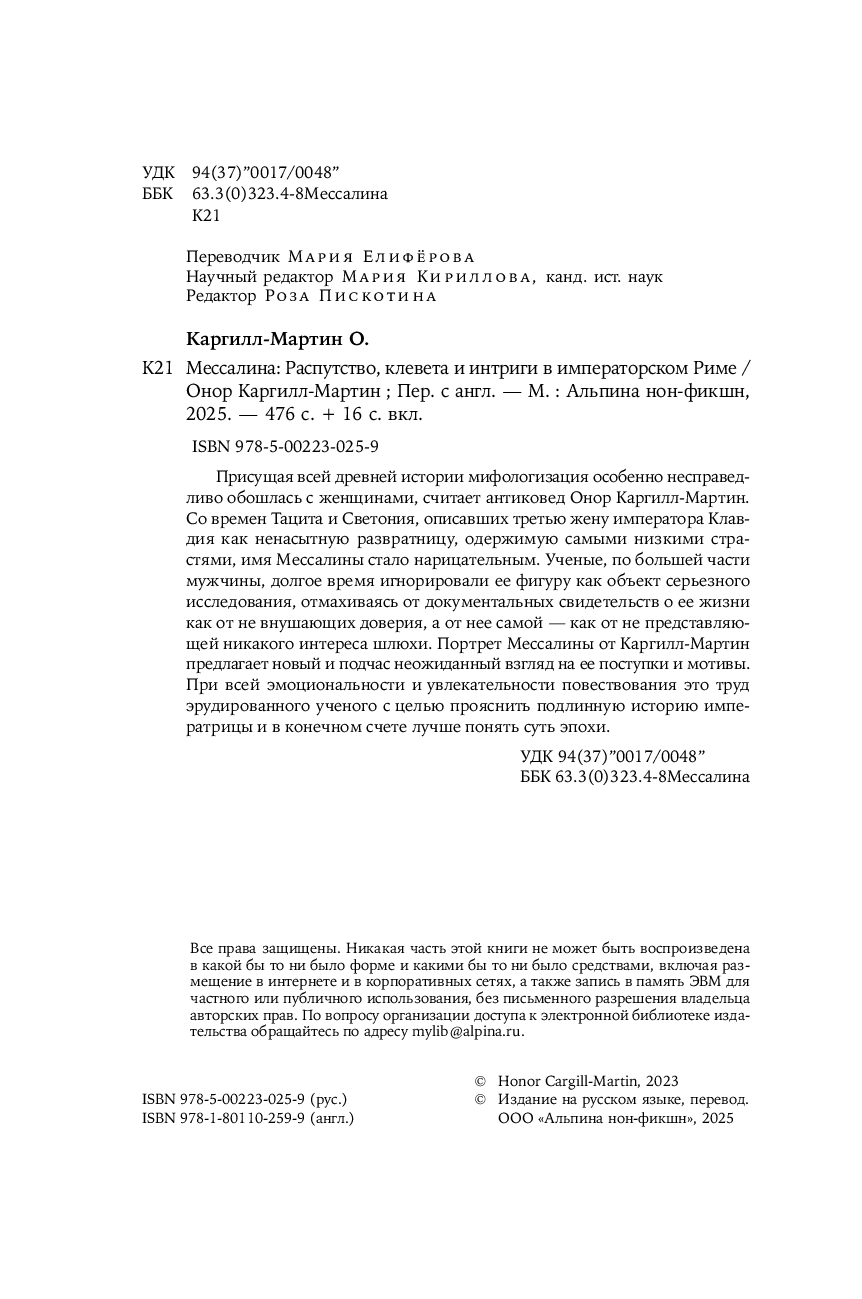 Портрет Мессалины от Каргилл-Мартин предлагает новый и подчас неожиданный взгляд на ее поступки и мотивы. При всей эмоциональности и увлекательности повествования это труд эрудированного ученого с целью прояснить подлинную историю императрицы и в конечном счете лучше понять суть эпохи.
