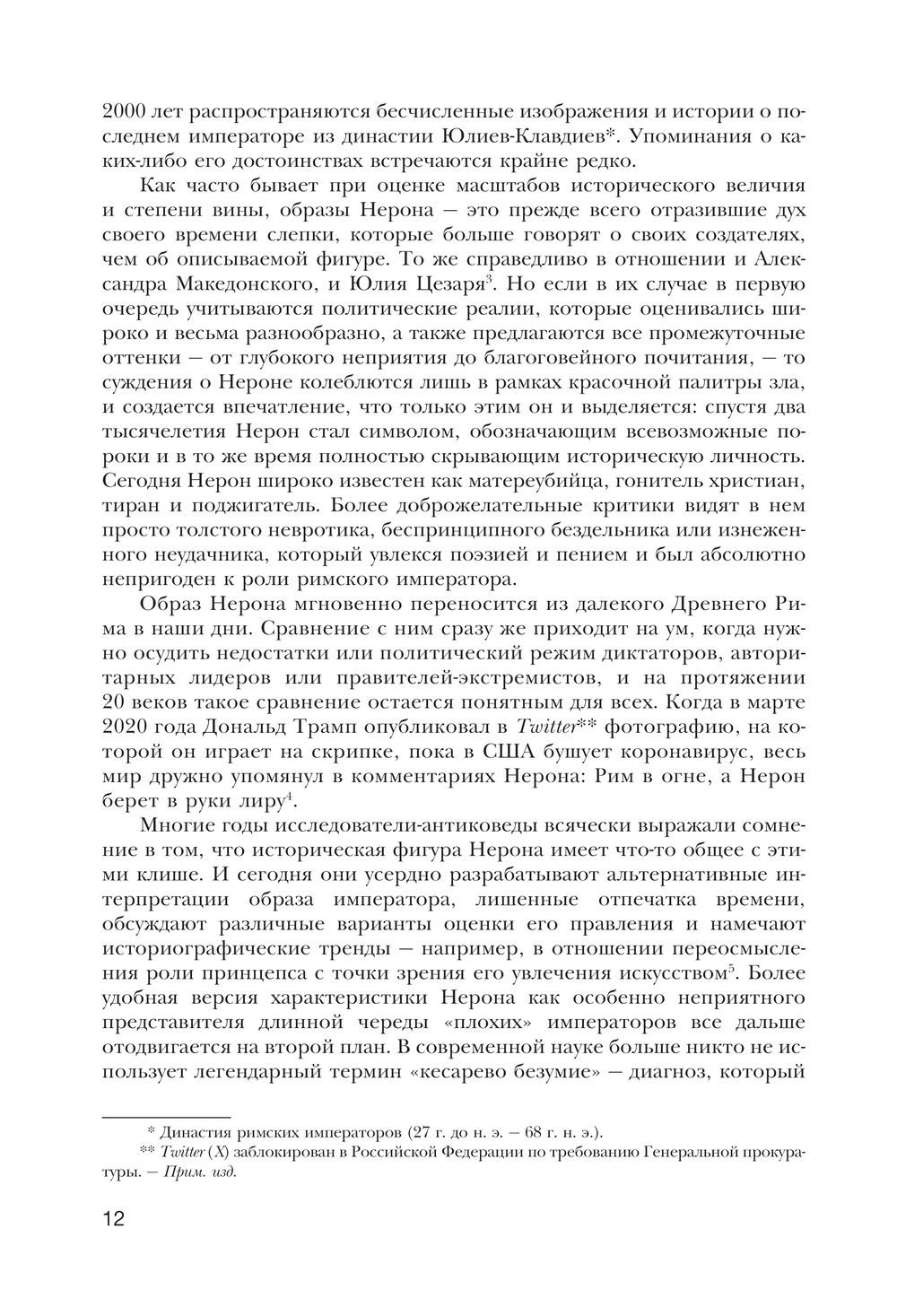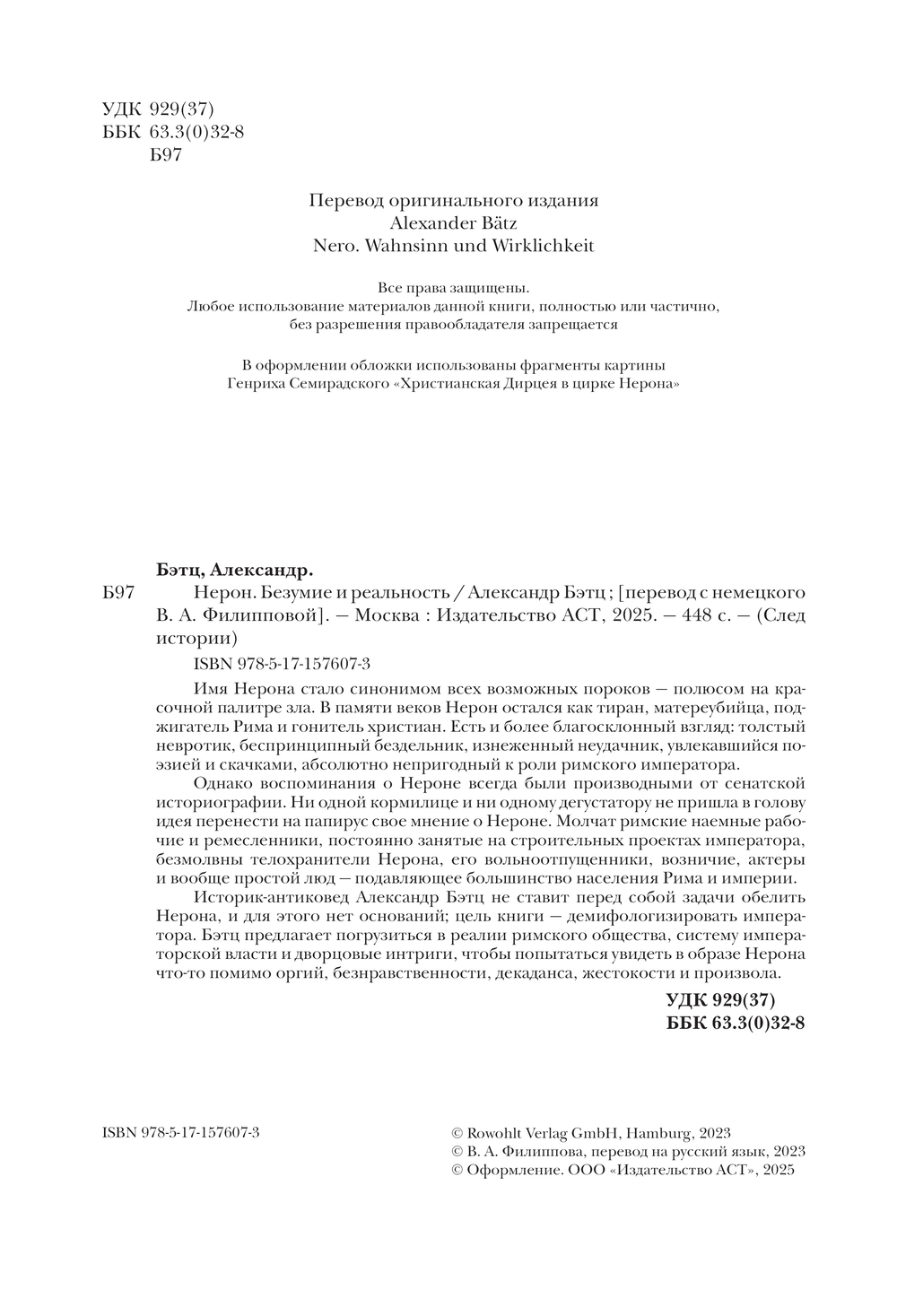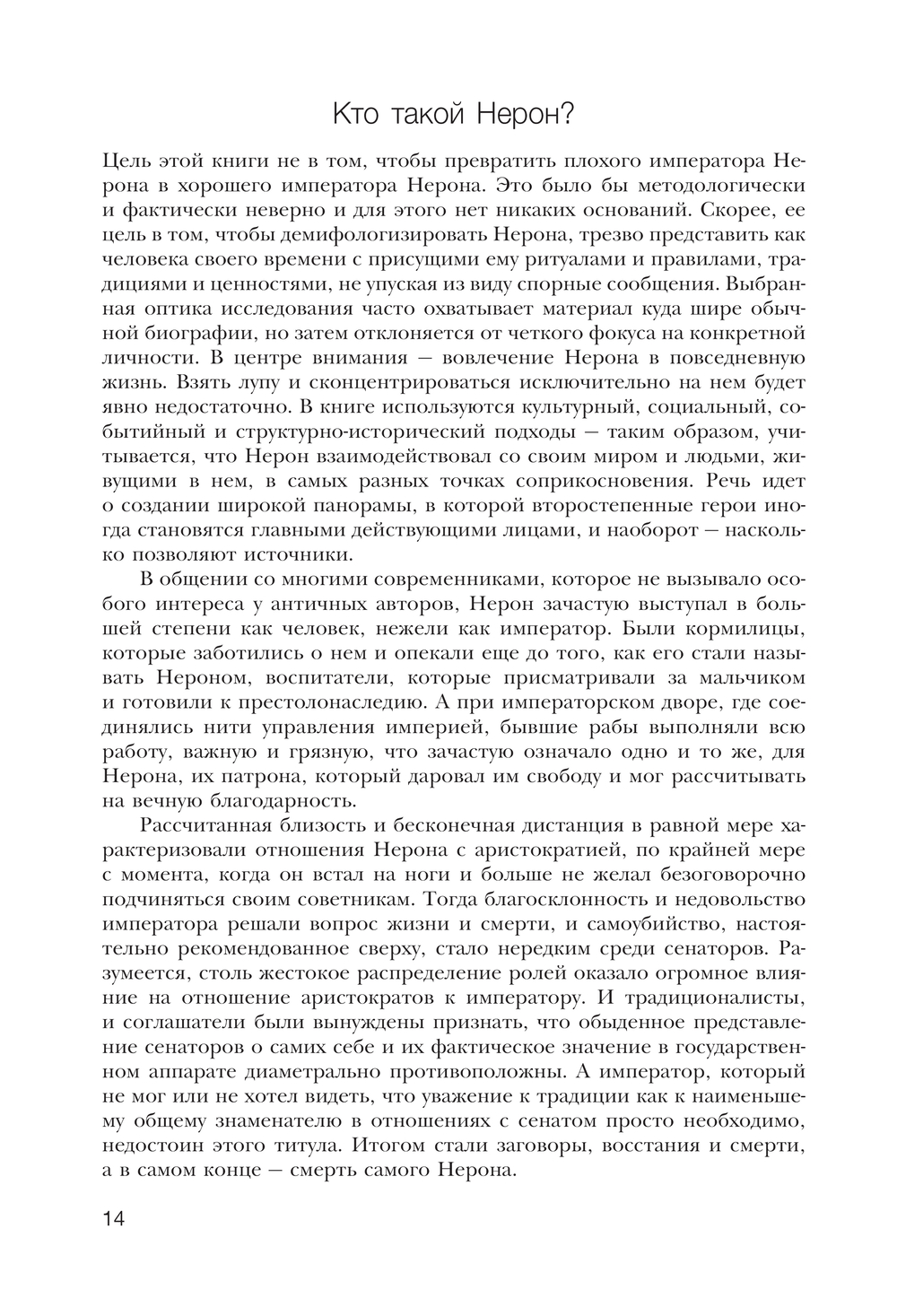 Историк-антиковед Александр Бэтц не ставит перед собой задачу обелить Нерона, и для этого нет оснований; цель книги – демифологизировать императора. Бэтц предлагает погрузиться в реалии римского общества, систему императорской власти и дворцовые интриги, чтобы попытаться увидеть в образе Нерона что-то помимо оргий, безнравственности, декаданса, жестокости и произвола.
