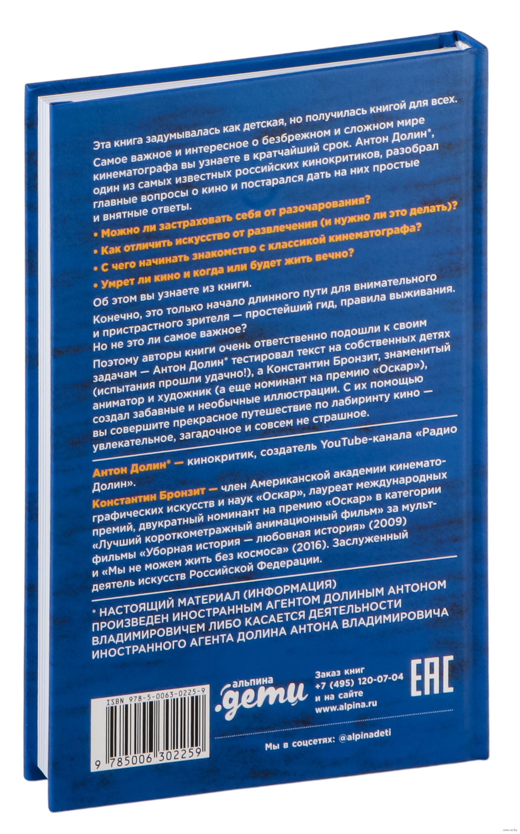 Авторы книги очень ответственно подошли к своим задачам – Антон Долин тестировал текст на собственных детях (испытания прошли удачно!), а Константин Бронзит, знаменитый аниматор и художник (а еще номинант на премию "Оскар"), создал забавные и необычные иллюстрации. С их помощью вы совершите прекрасное путешествие по лабиринту кино – увлекательное, загадочное и совсем не страшное.