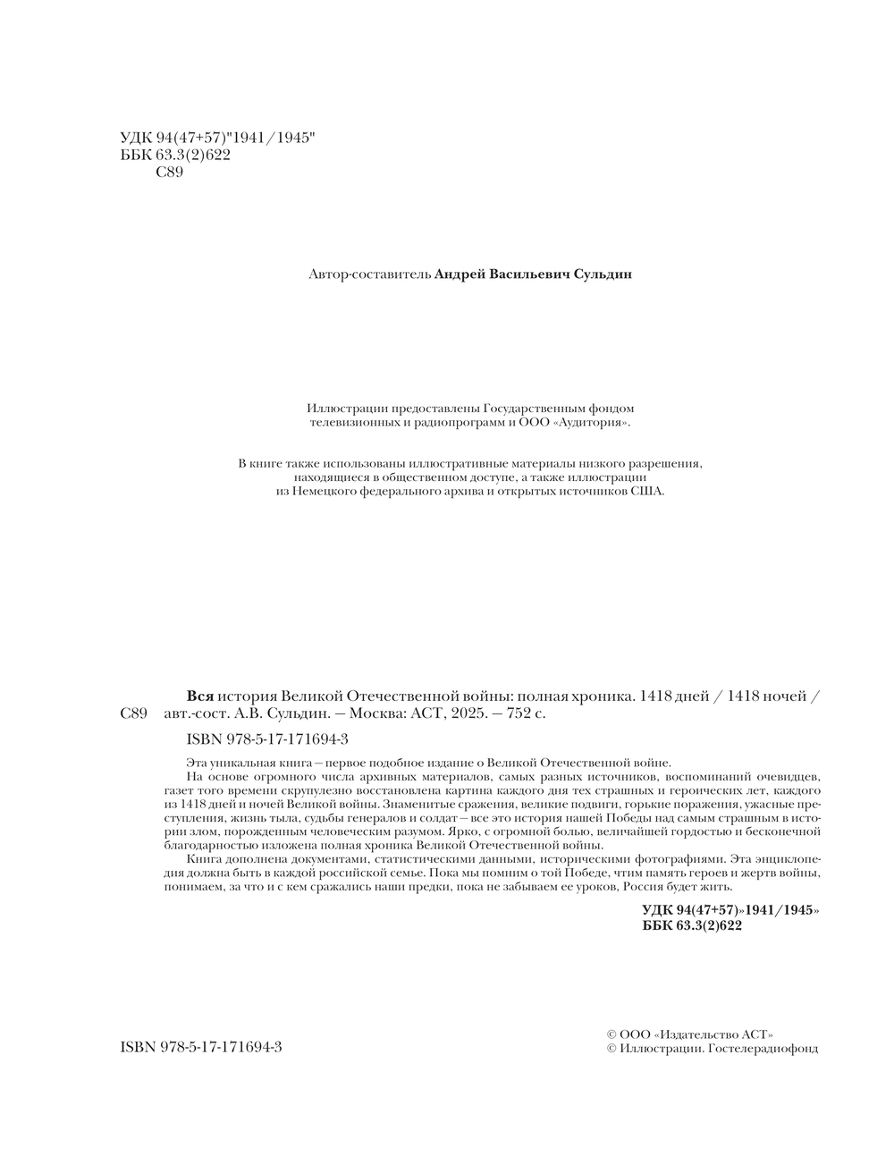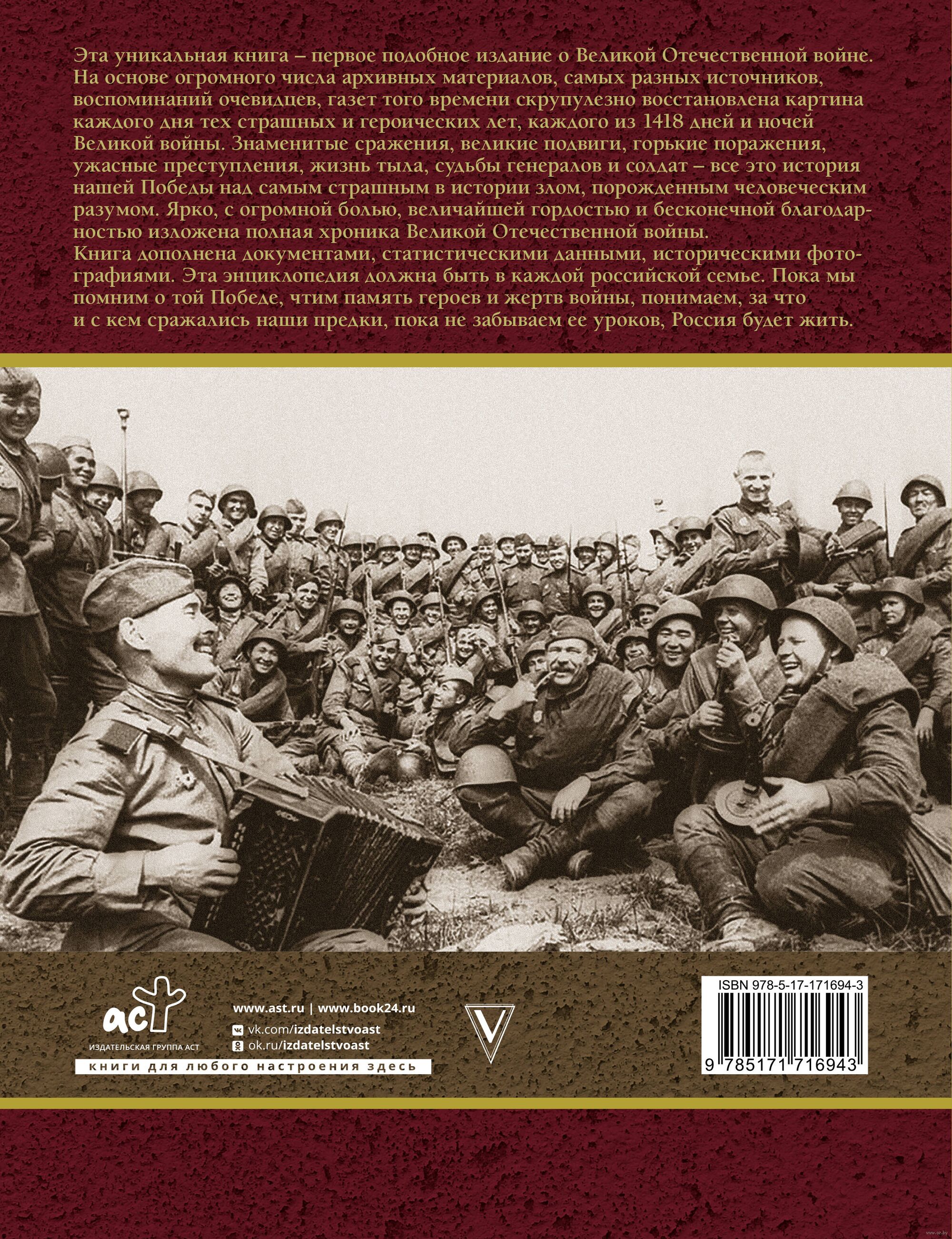 ужасные преступления, жизнь тыла, судьбы генералов и солдат – все это история нашей Победы над самым страшным в истории злом, порожденным человеческим разумом. Ярко, с огромной болью, величайшей гордостью и бесконечной благодарностью изложена полная хроника Великой Отечественной войны. Книга дополнена документами, статистическими данными, историческими фотографиями.
