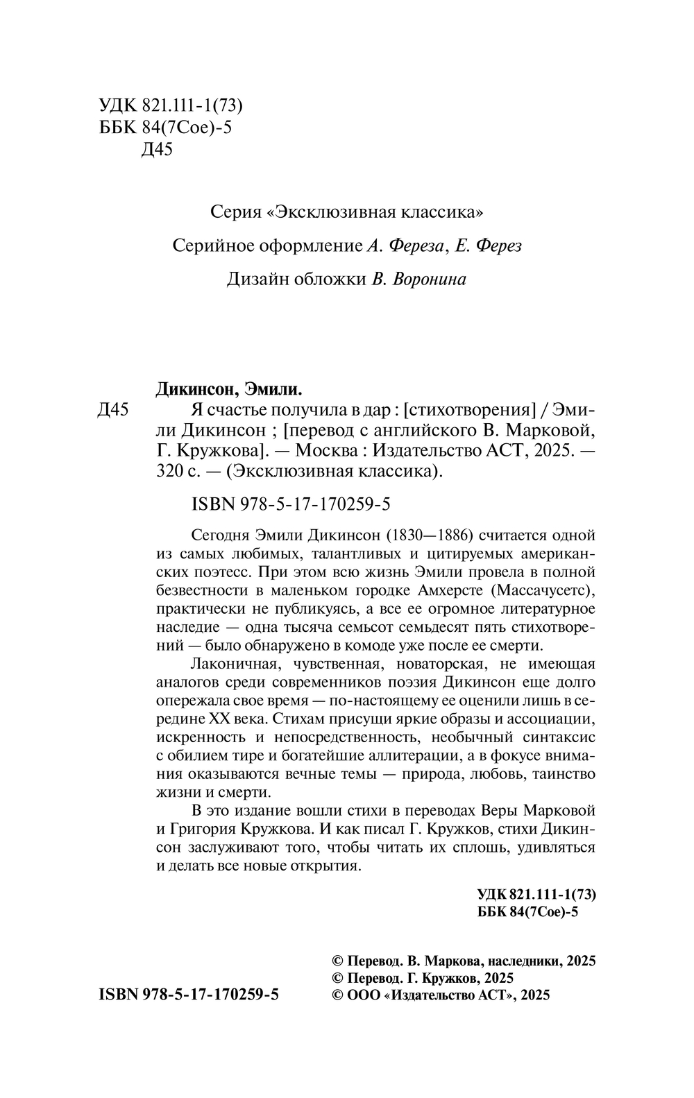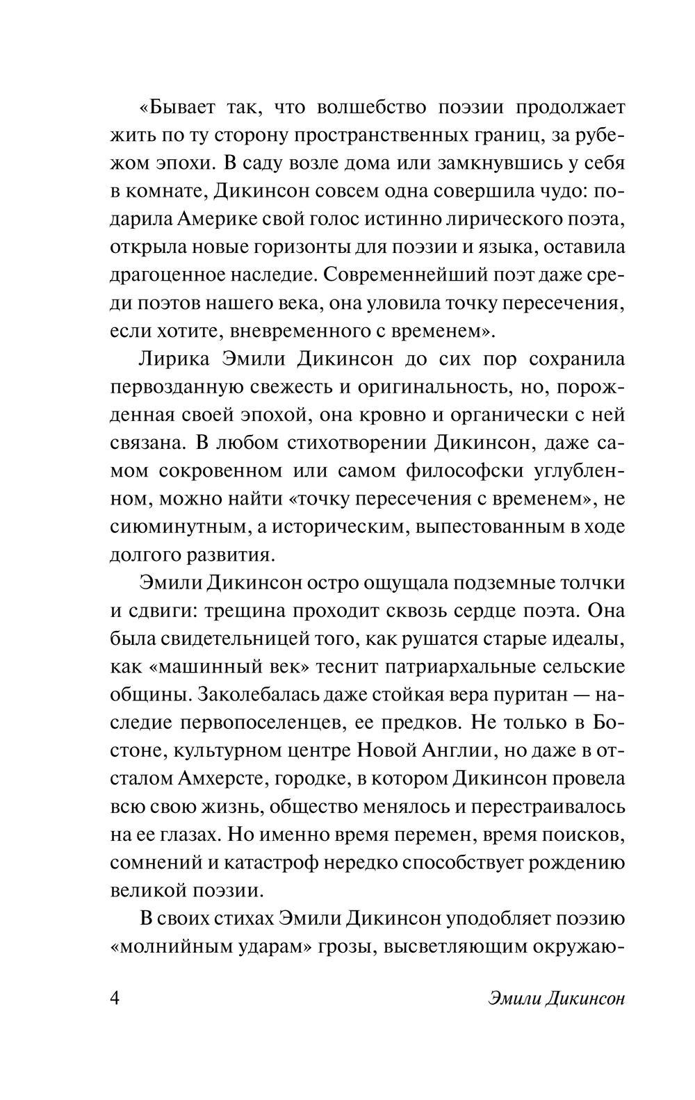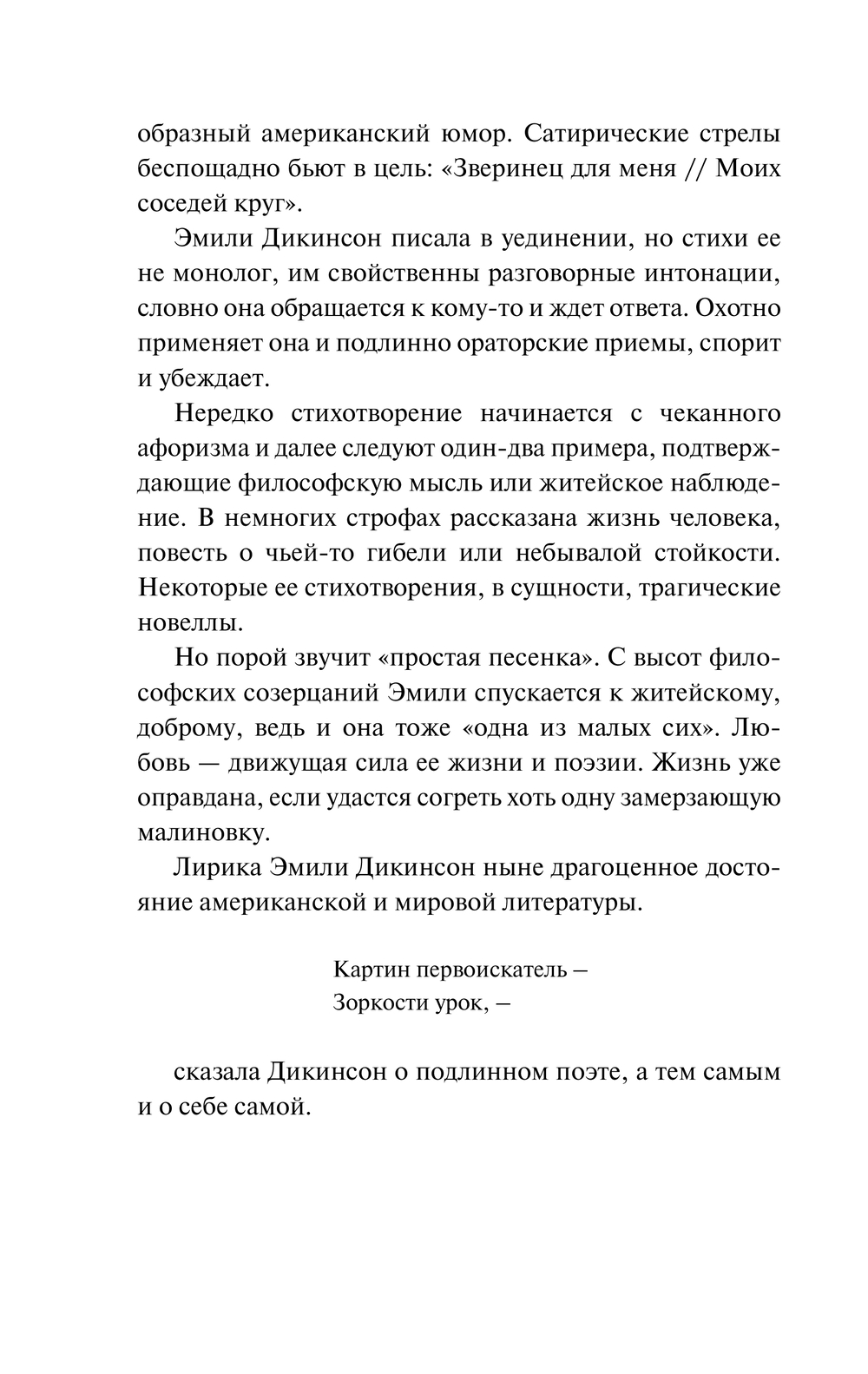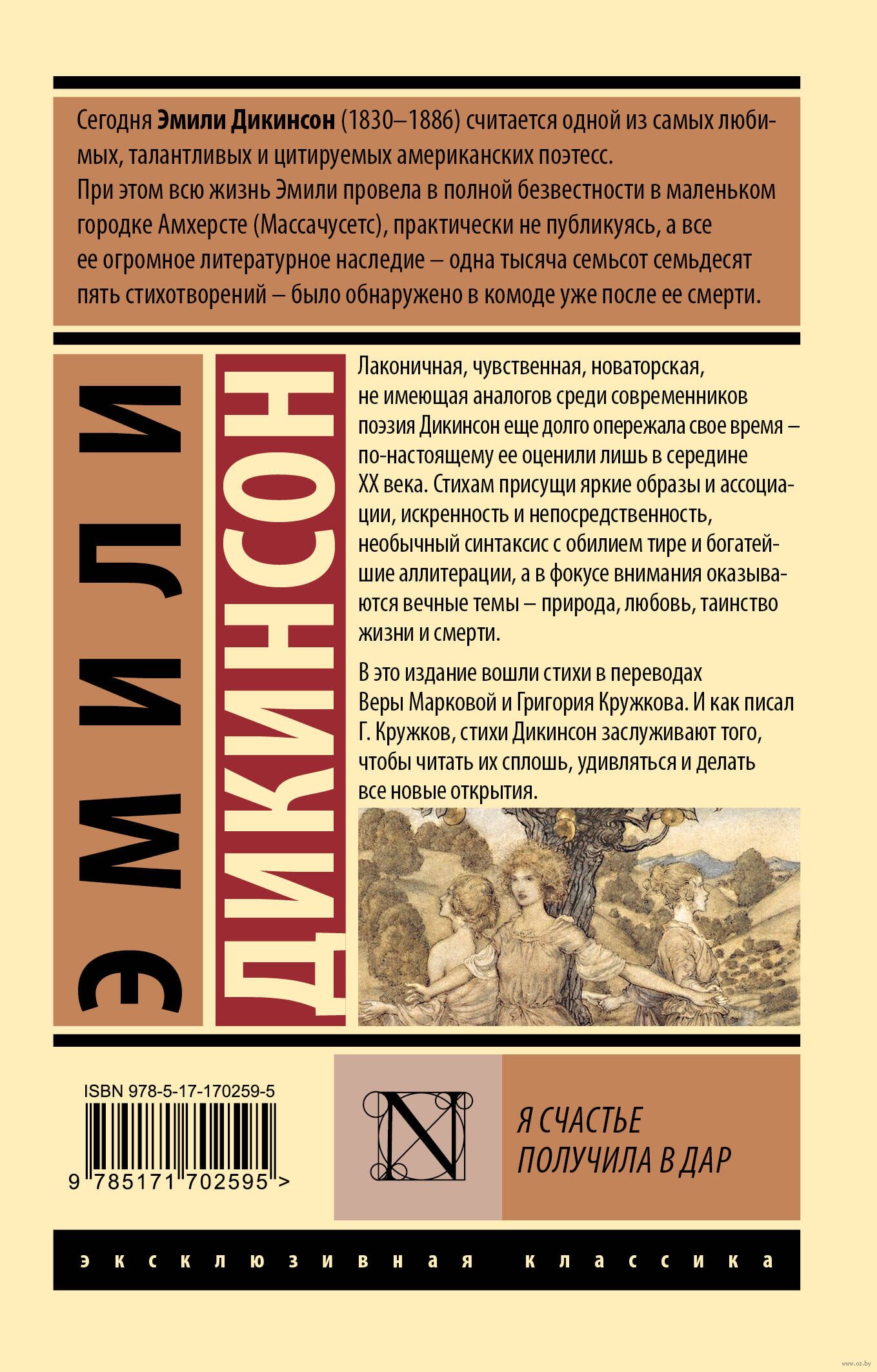 В это издание вошли стихи в переводах Веры Марковой и Григория Кружкова. И как писал Г. Кружков, стихи Дикинсон заслуживают того, чтобы читать их сплошь, удивляться и делать все новые открытия.