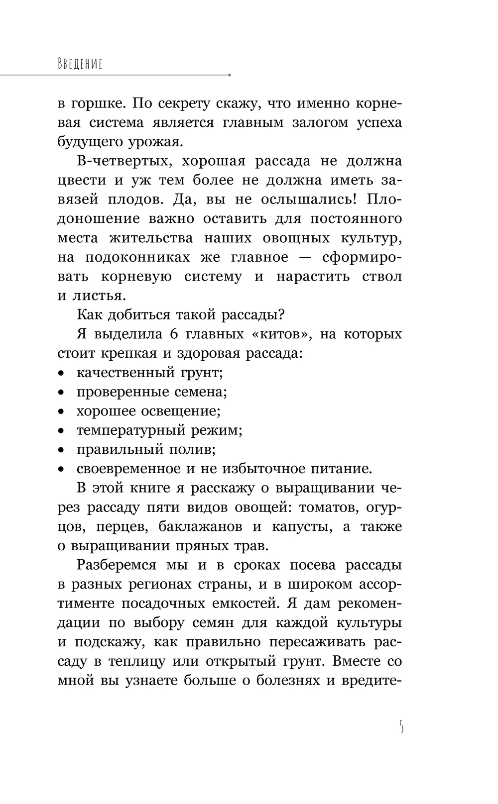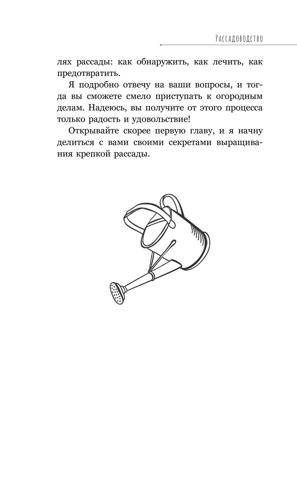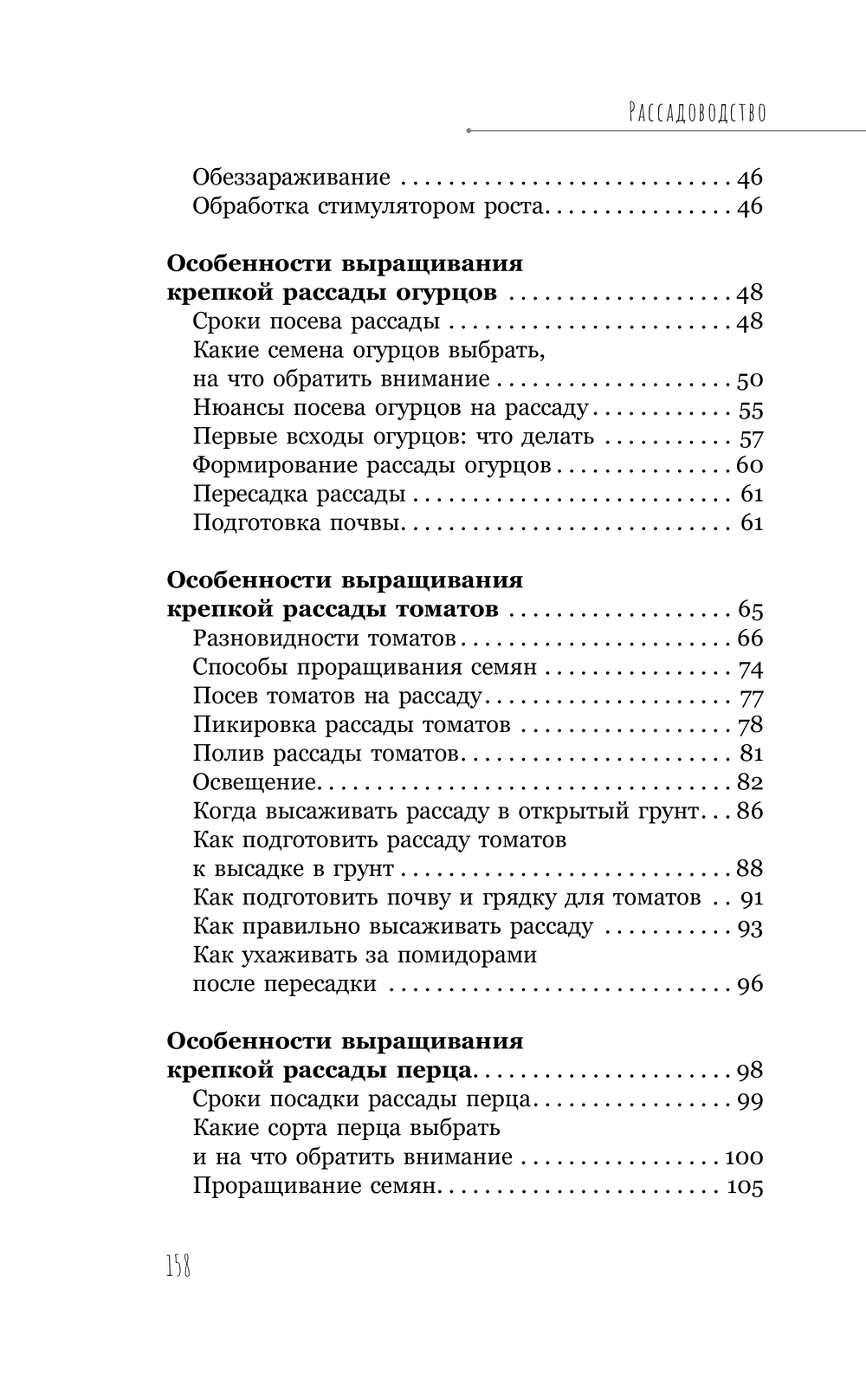 Автор пошагово расскажет о выращивании через рассаду пяти основных видов овощей: томатов, огурцов, перцев, баклажанов, капусты – и даже пряных трав. А на цветной вклейке вы найдете карточки для заполнения, с помощью которых сможете отслеживать рост вашей рассады.