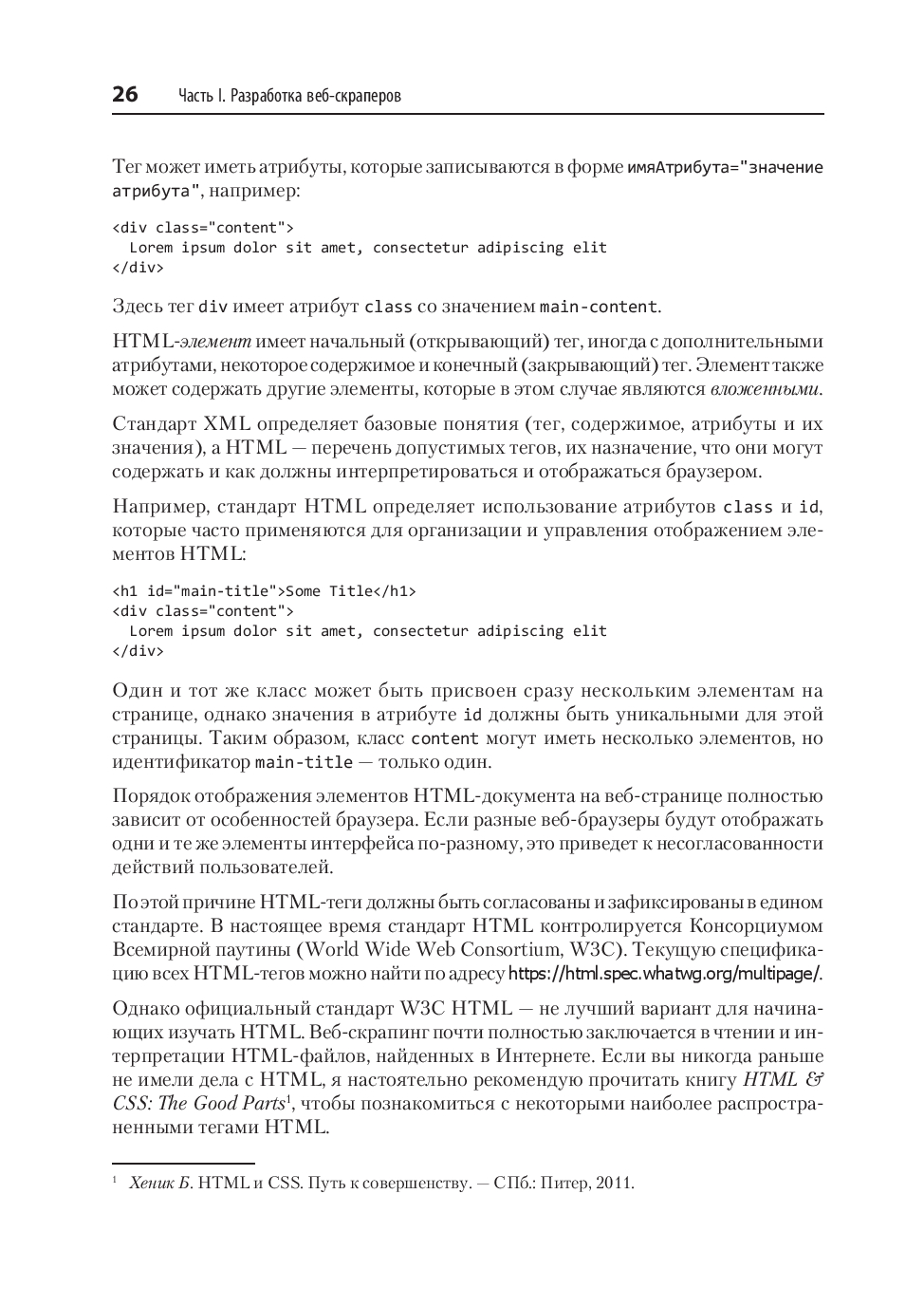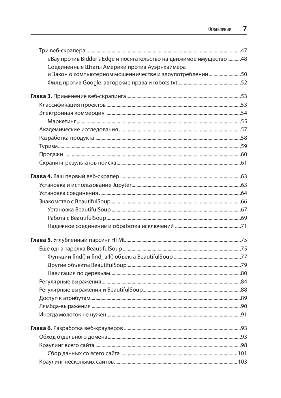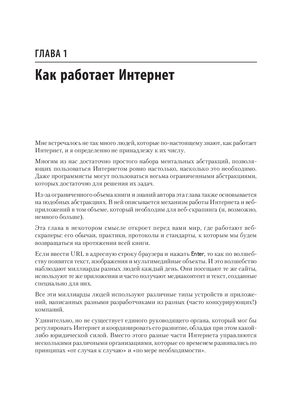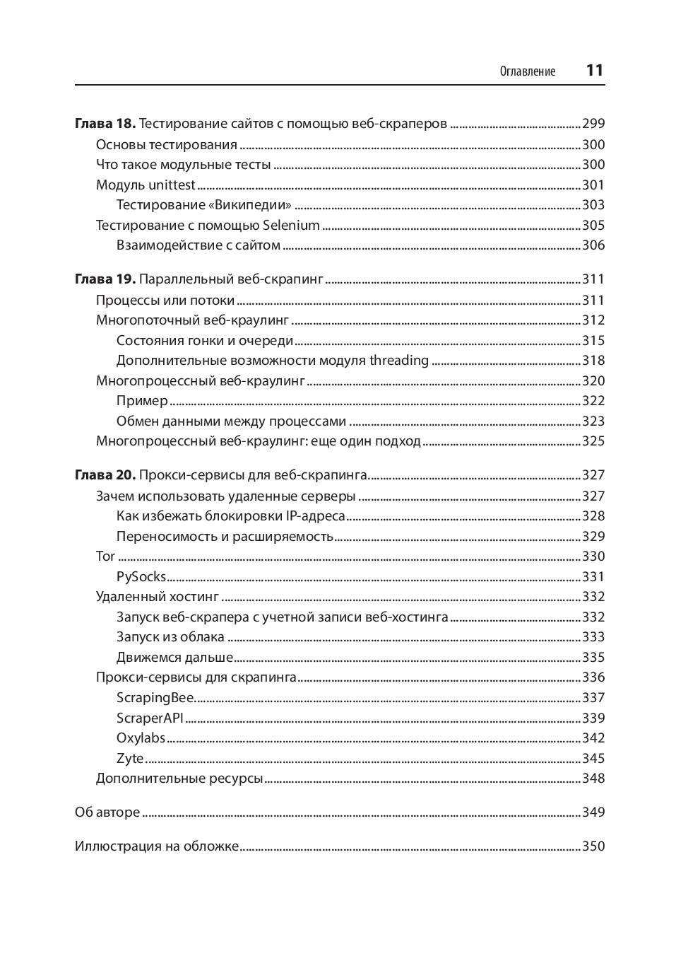 Книга покажет, как анализировать сложные HTML-страницы; разрабатывать веб-сканеры с помощью фреймворка Scrapy; хранить данные, полученные с помощью скрапинга; читать и извлекать данные из документов; очищать и нормализовывать плохо отформатированные данные; читать и записывать информацию на естественных языках; выполнять поиск по формам и страницам входа; выполнять скрапинг JavaScript-кода и работать с API; писать и использовать программы для преобразования изображений в текст; обходить противоскрапинговые ловушки и блокаторы ботов; тестировать свои веб-сайты с помощью скрапинга.