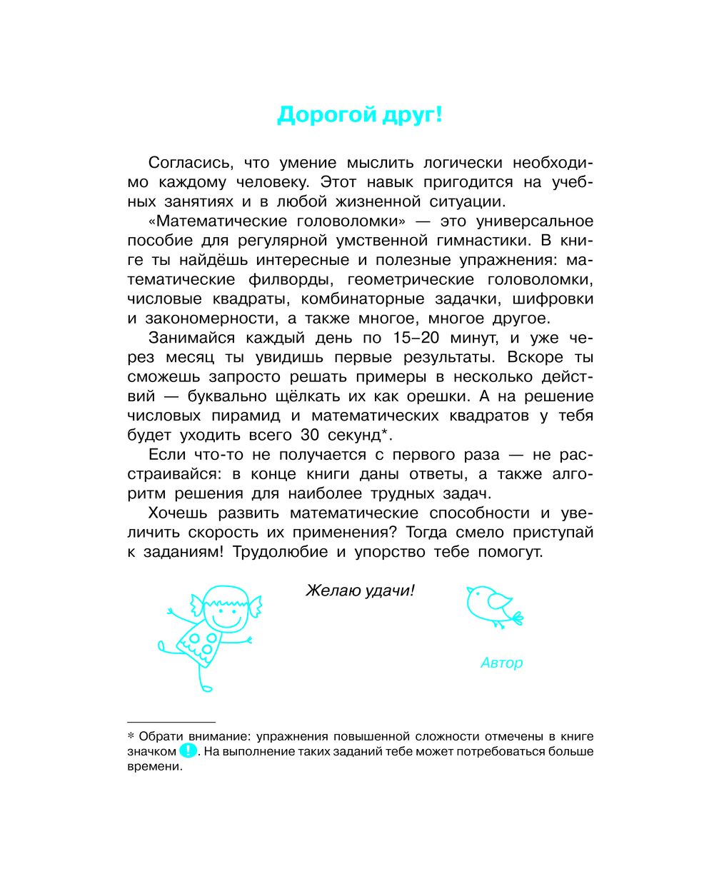 В сборнике "Математические головоломки за 30 секунд" – самые интересные и полезные задания для учеников начальной школы: числовые квадраты, шифровки, закономерности, геометрические задачи, а также многое другое. Разгадывая головоломки и отрабатывая знания на практике, школьники смогут развить математические способности и подготовиться к контрольным и проверочным работам. Книгу можно использовать для занятий дома и в классе по всем федеральным программам начальной школы.