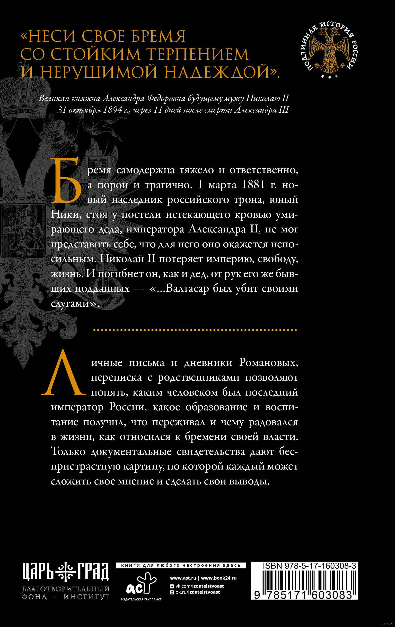 Бремя самодержца тяжело и ответственно, а порой и трагично. 1 марта 1881 г. новый наследник российского трона, юный Ники, стоя у постели истекающего кровью умирающего деда, императора Александра II, не мог представить себе, что для него оно окажется непосильным. Николай II потеряет империю, свободу, жизнь. И погибнет он, как и дед, от рук его же бывших подданных – "...Валтасар был убит своими слугами".