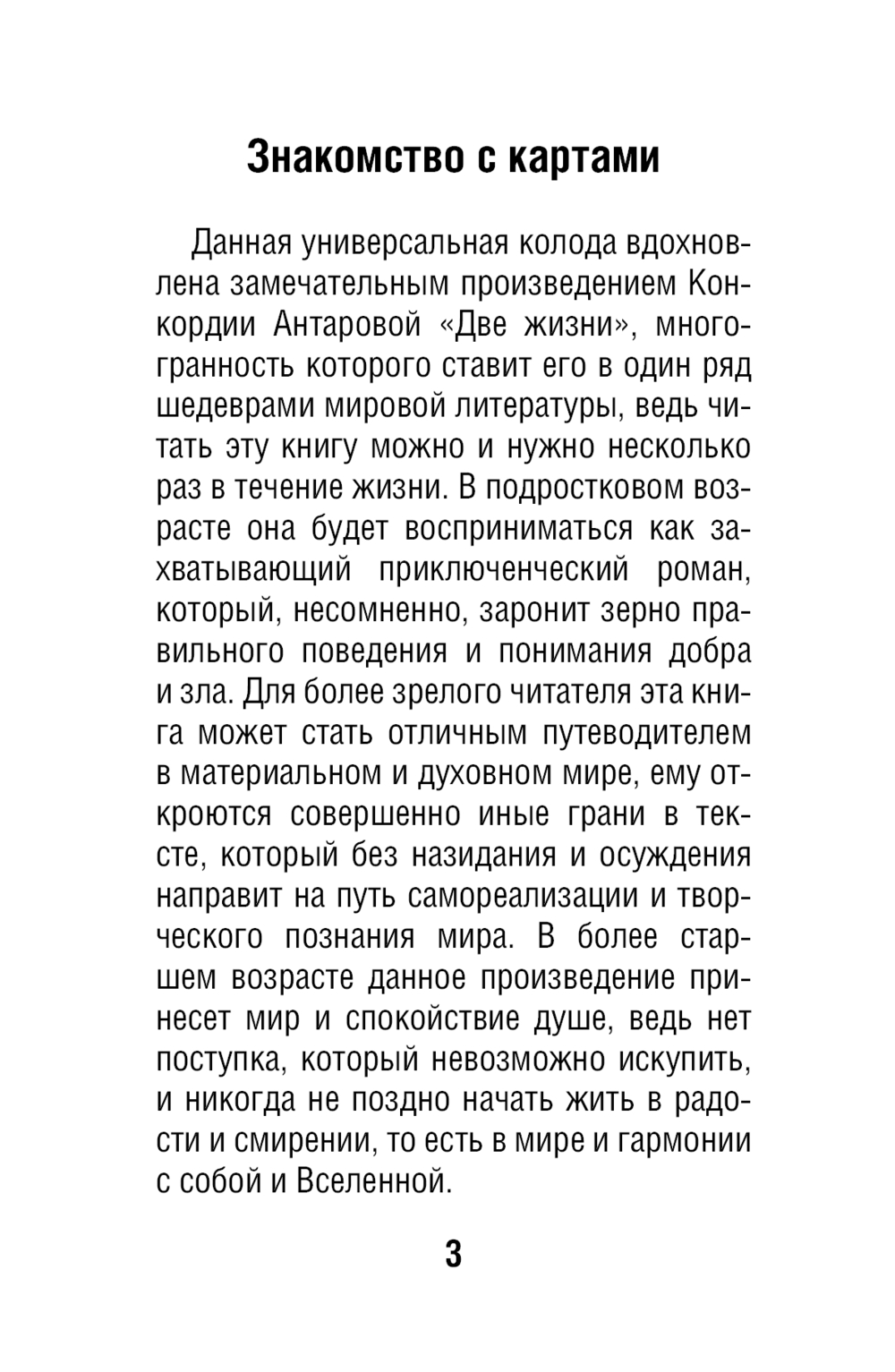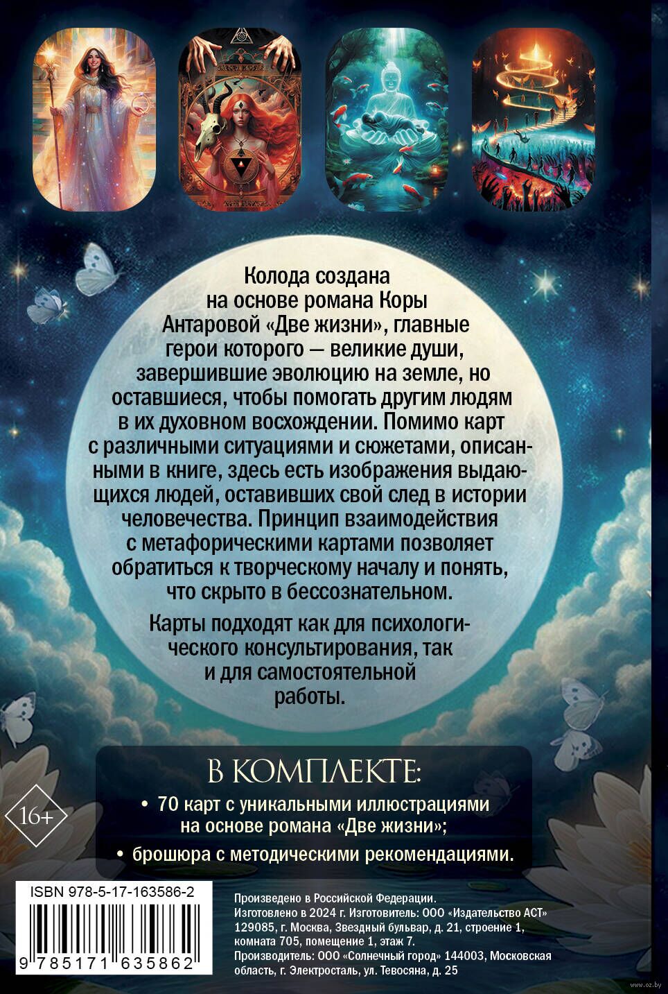 Колода создана на основе романа Коры Антаровой "Две жизни", главные герои которого – великие души, завершившие эволюцию на земле, но остались, чтобы помогать другим людям в их духовном восхождении. Помимо карт с различными ситуациями и сюжетами, описанными в книге, здесь есть изображения выдающихся людей, оставивших свой след в истории человечества. Принцип взаимодействия с метафорическими картами позволяет обратиться к творческому началу и понять, что скрыто в бессознательном.