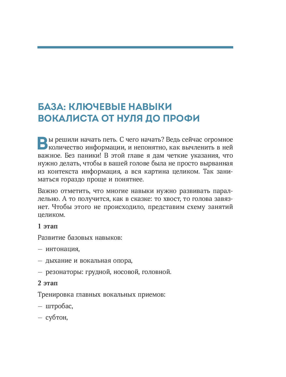 Эта книга – настоящий подручный помощник для каждого, кто увлечен пением или только делает первые шаги в этом ремесле! Она подойдёт как начинающим, так и продолжающим вокалистам, а также профессионалам. Книга Александры Стройцевой станет отличной шпаргалкой, которую вы сможете использовать во время занятий вокалом.