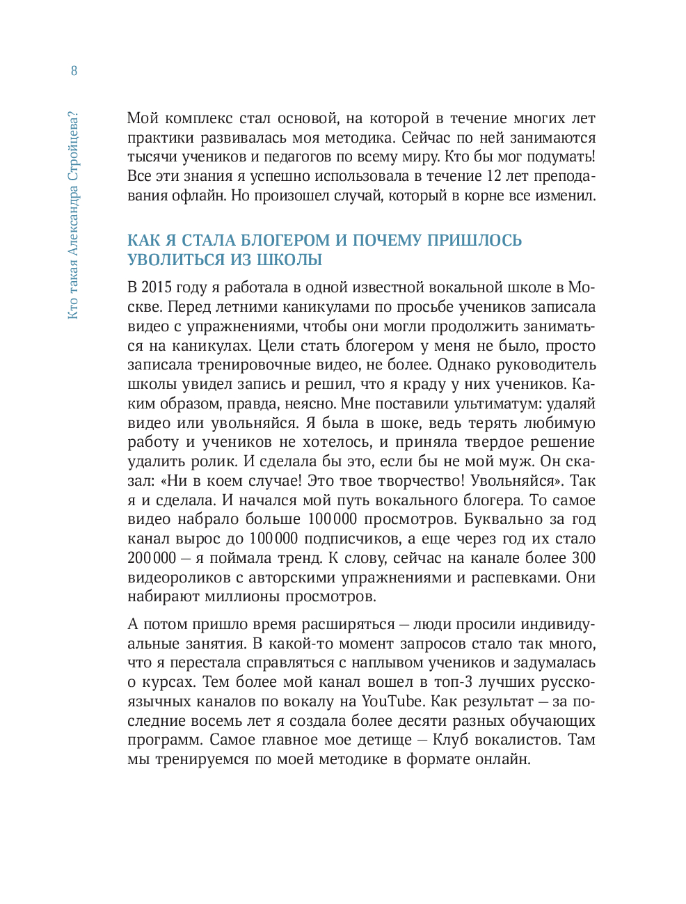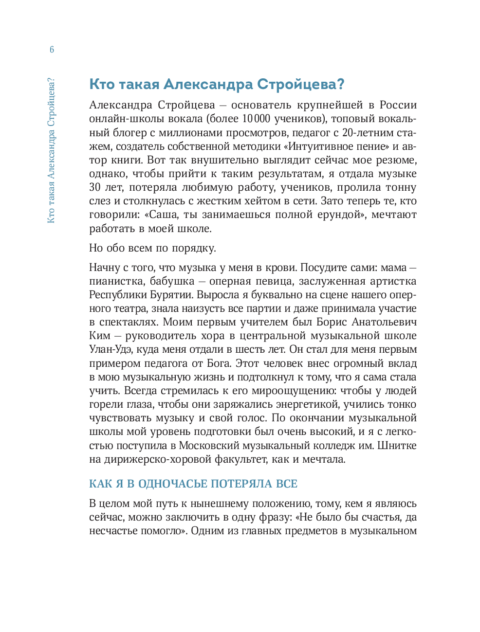 Автор книги – Александра Стройцева, основатель крупнейшей в России онлайн-школы вокала, блогер с миллионами просмотров, педагог с 20 летним стажем, создатель собственной методики "Интуитивное пение".