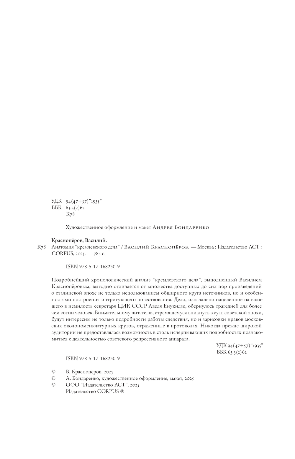 Подробнейший хронологический анализ "кремлевского дела", выполненный Василием Краснопёровым, выгодно отличается от множества доступных до сих пор произведений о сталинской эпохе не только использованием обширного круга источников, но и особенностями построения интригующего повествования. Дело, изначально нацеленное на впавшего в немилость секретаря ЦИК СССР Авеля Енукидзе, обернулось трагедией для более чем сотни человек. Внимательному читателю, стремящемуся вникнуть в суть советской эпохи, будут интересны не только подробности работы следствия, но и зарисовки нравов московских околономенклатурных кругов, отраженные в протоколах. Никогда прежде широкой аудитории не предоставлялась возможность в столь исчерпывающих подробностях познакомиться с деятельностью советского репрессивного аппарата.
