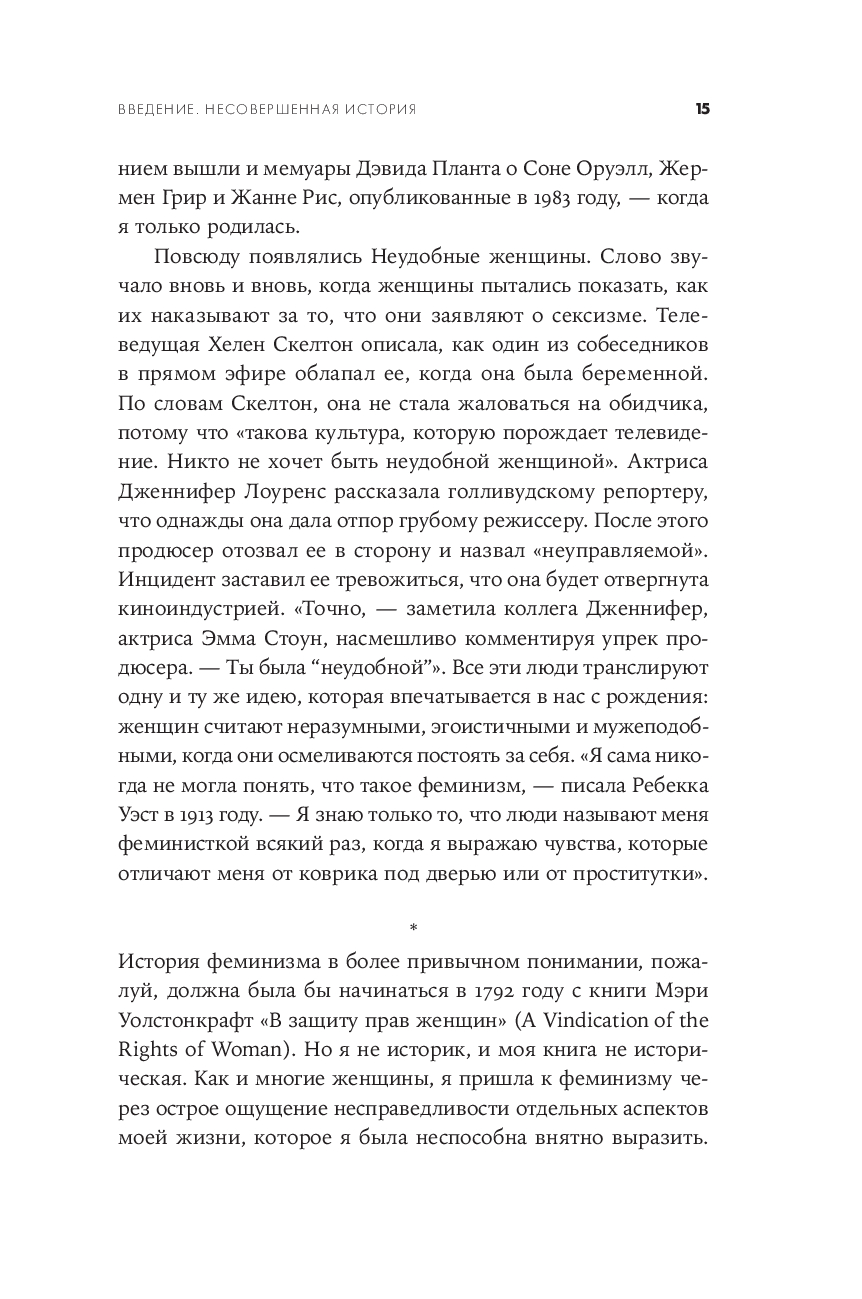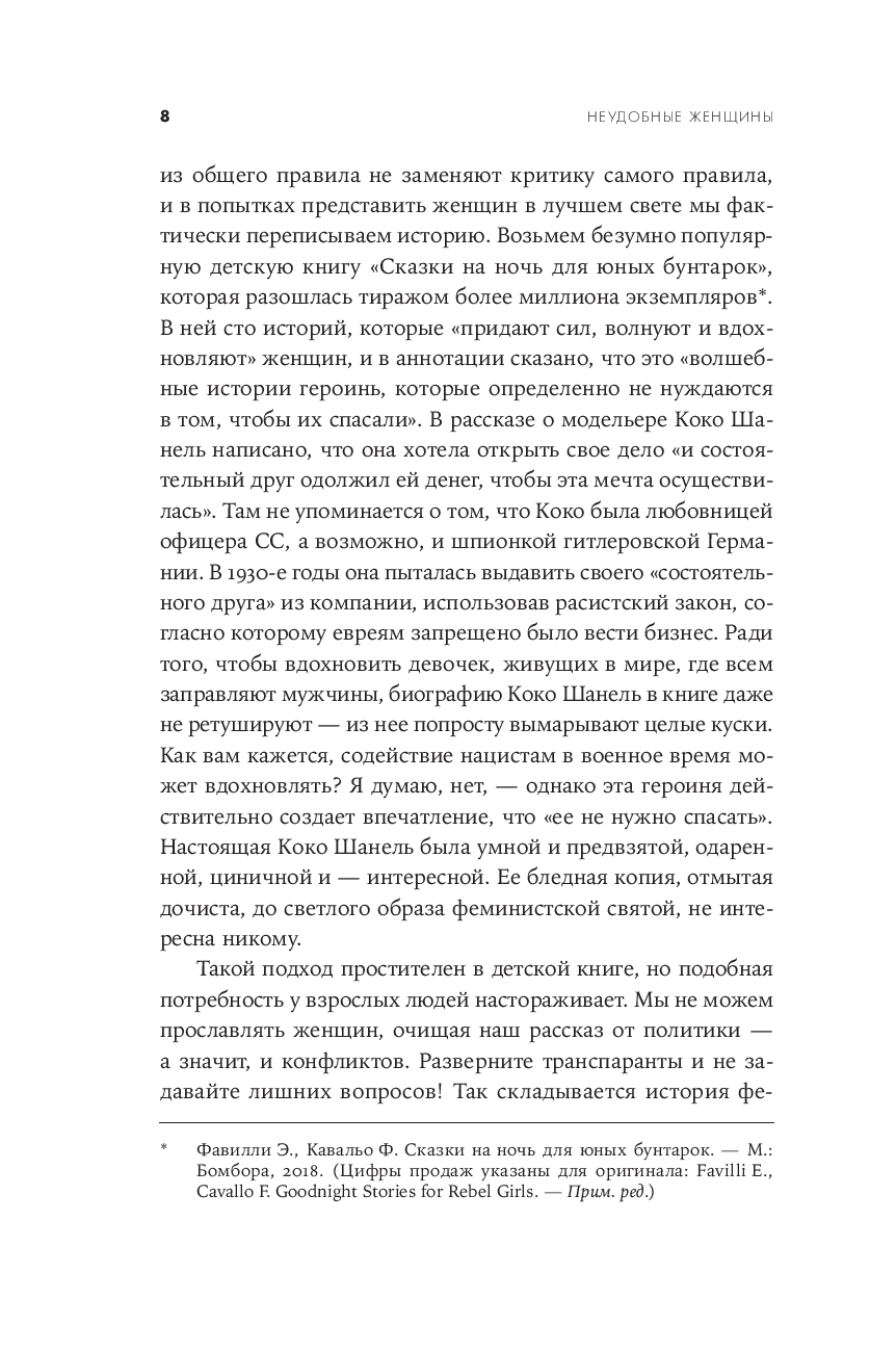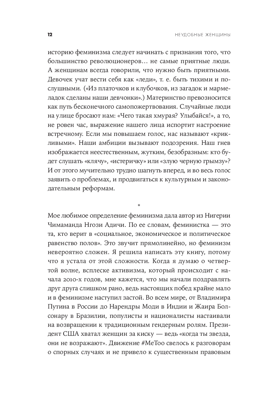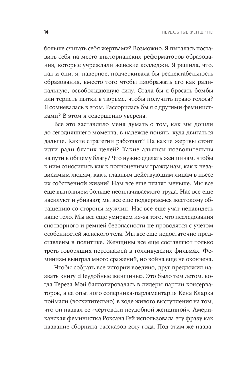 Патриархальная культура веками навязывала женщине идеалы кротости, жертвенного служения и смирения, роль домашнего ангела и необходимость быть "милой". Героинь Хелен Льюис милыми не назовешь. Их имена были связаны со скандалами. Сложные, нетерпимые, неудобные, порой агрессивные, порой смешные – оригиналки, чудачки, выскочки, они с предельной прямотой озвучивали проблемы и показывали аномальность привычного, ломали стереотипы и заставляли общество пересматривать гендерные установки, меняли уклад, правовые нормы и государственные институты – в интересах всех остальных. Благодаря им женщины обрели те права, которыми, порой даже не задумываясь, пользуются сейчас: право распоряжаться своим телом и голосом, своим временем и доходами, право ошибаться и исправлять ошибки. Полная ярких и точных политических наблюдений, одновременно забавных и информативных, эта книга – трезвая, горькая, веселая и бесстрашная история феминизма, его побед и провалов и манифест всех тех женщин, которые не готовы быть "удобными".