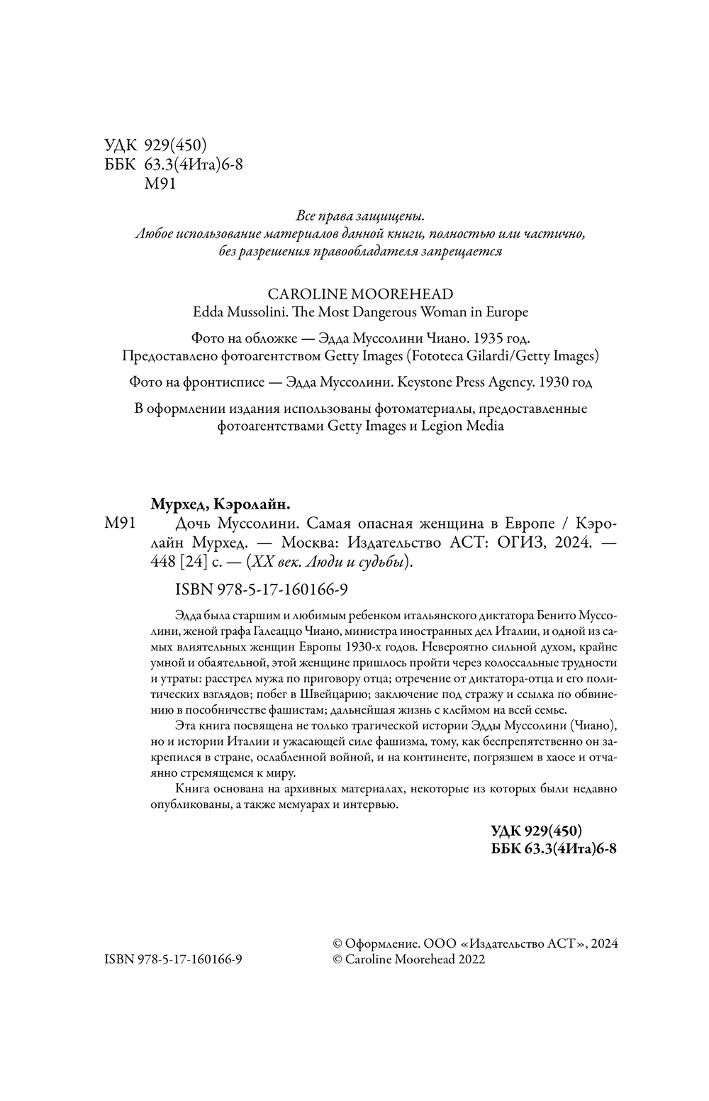 Эта книга посвящена не только трагической истории Эдды Муссолини (Чиано), но и истории Италии и ужасающей силе фашизма, тому, как беспрепятственно он закрепился в стране, ослабленной войной, и на континенте, погрязшем в хаосе и отчаянно стремящемся к миру.